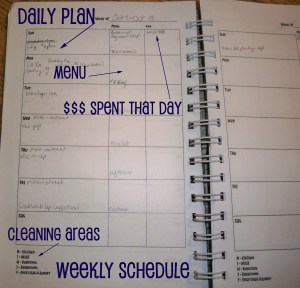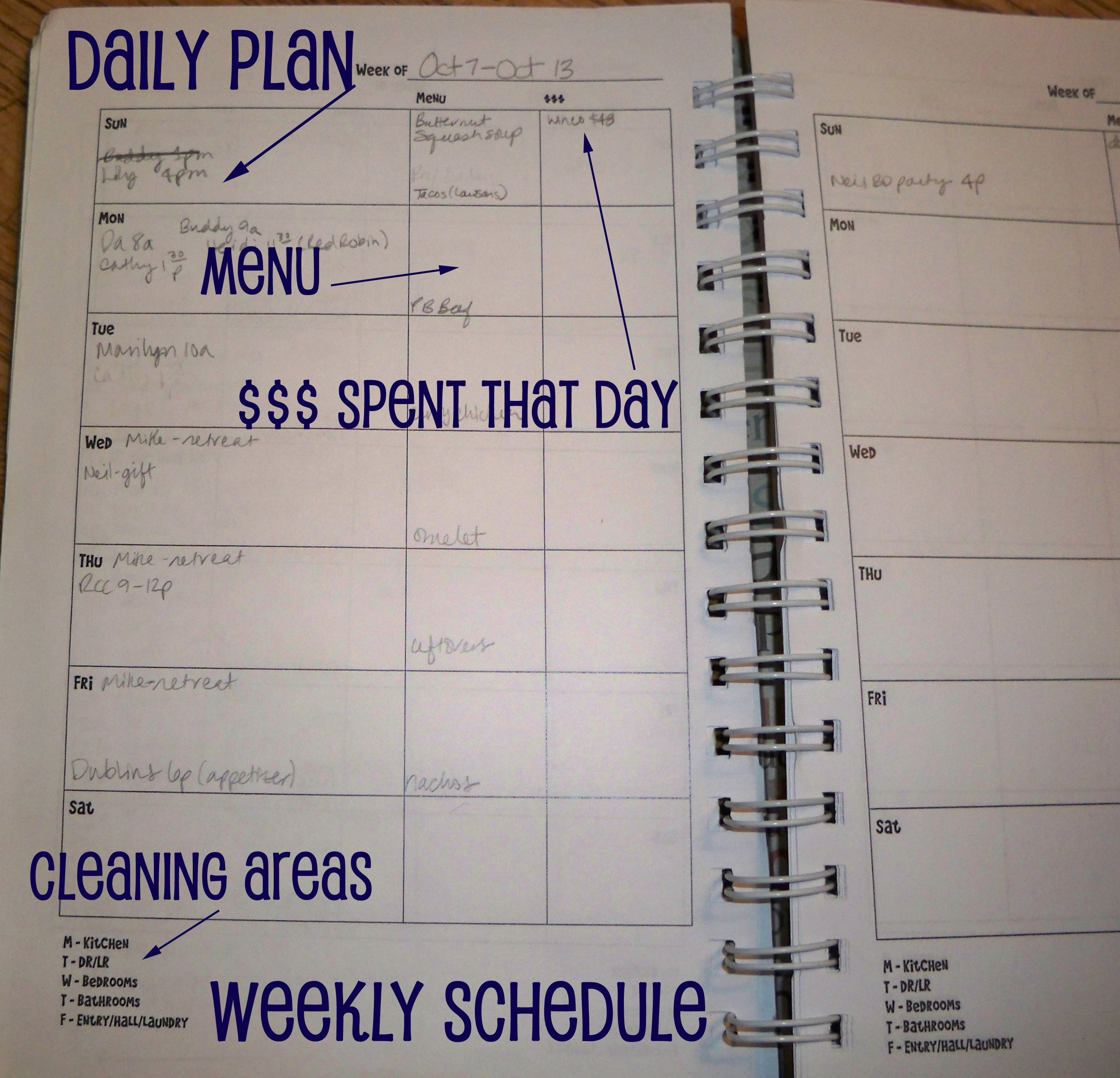Following the notes, I have a page for each week of the month that is broken out by the days, Sunday through Saturday. I have space to write out appointments/tasks for each day (Daily Plan), our dinner menu (Menu) and a spot to write down if I spent any money that day ($$$ Spent That Day). At the bottom of the page, I have listed the areas of my house that get attention on each particular day.