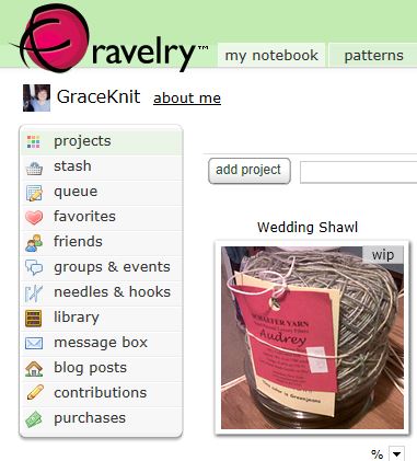 tion for your current projects, your stash (yarn), your queue (projects you want to do), your library of patterns and other fun features. You can enter the particulars about each project (pattern, yarn used, needles used, notes) including its status: finished, in progress, hibernating, frogging. Ravelry has other wonderful features. If you’re a knitter or crocheter and you haven’t heard of Ravelry, check it out!