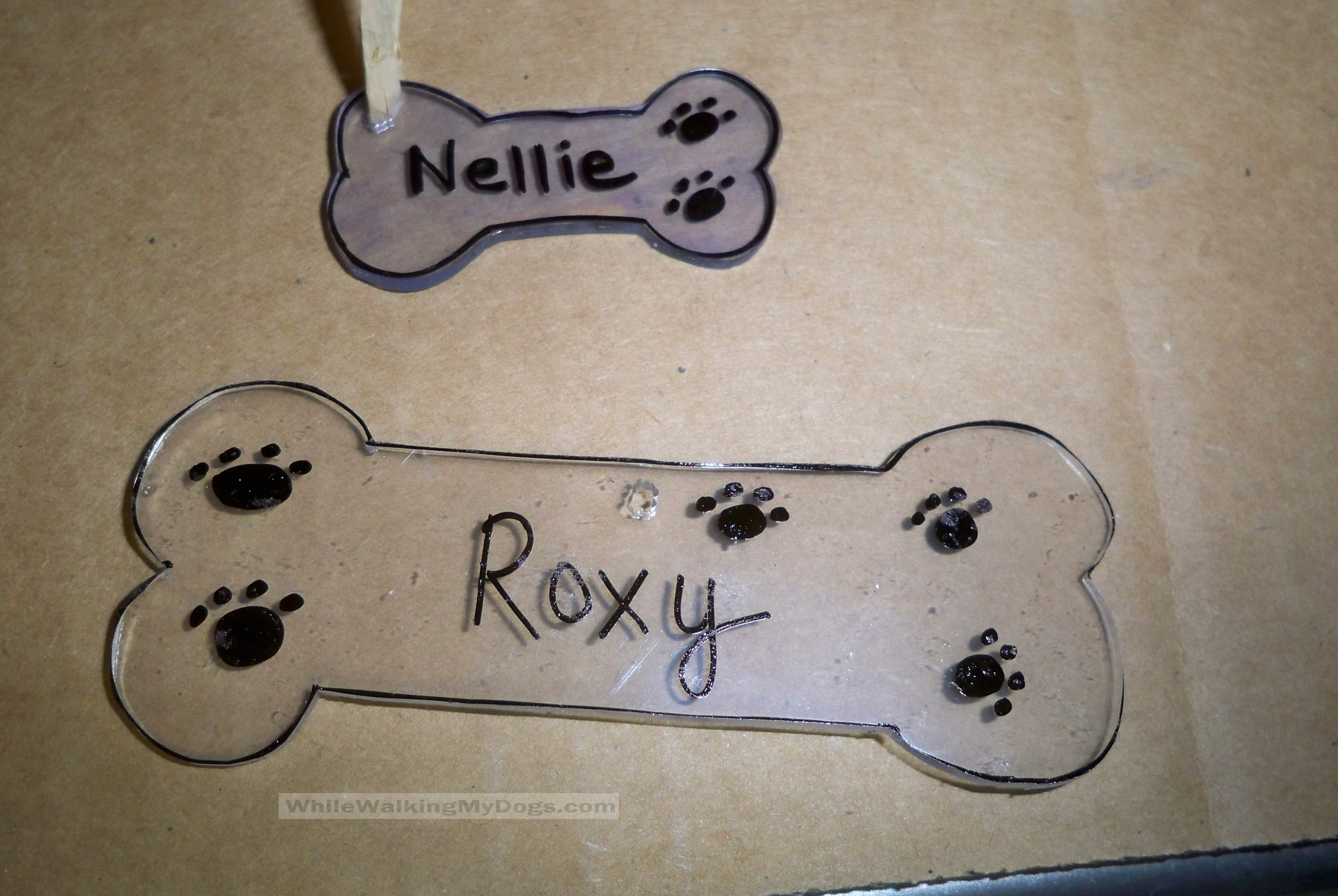 Here’s how I made them. Following the general instructions of the tutorial, I traced out a bone shape for each tag I wanted. The Shrinky Dinks they used were the kind where you can print directly onto them, but I only had the original kind so I used my permanent markers. I used a dog-bone shaped cookie cutter for my general bone shape and then hand wrote the names on each one.