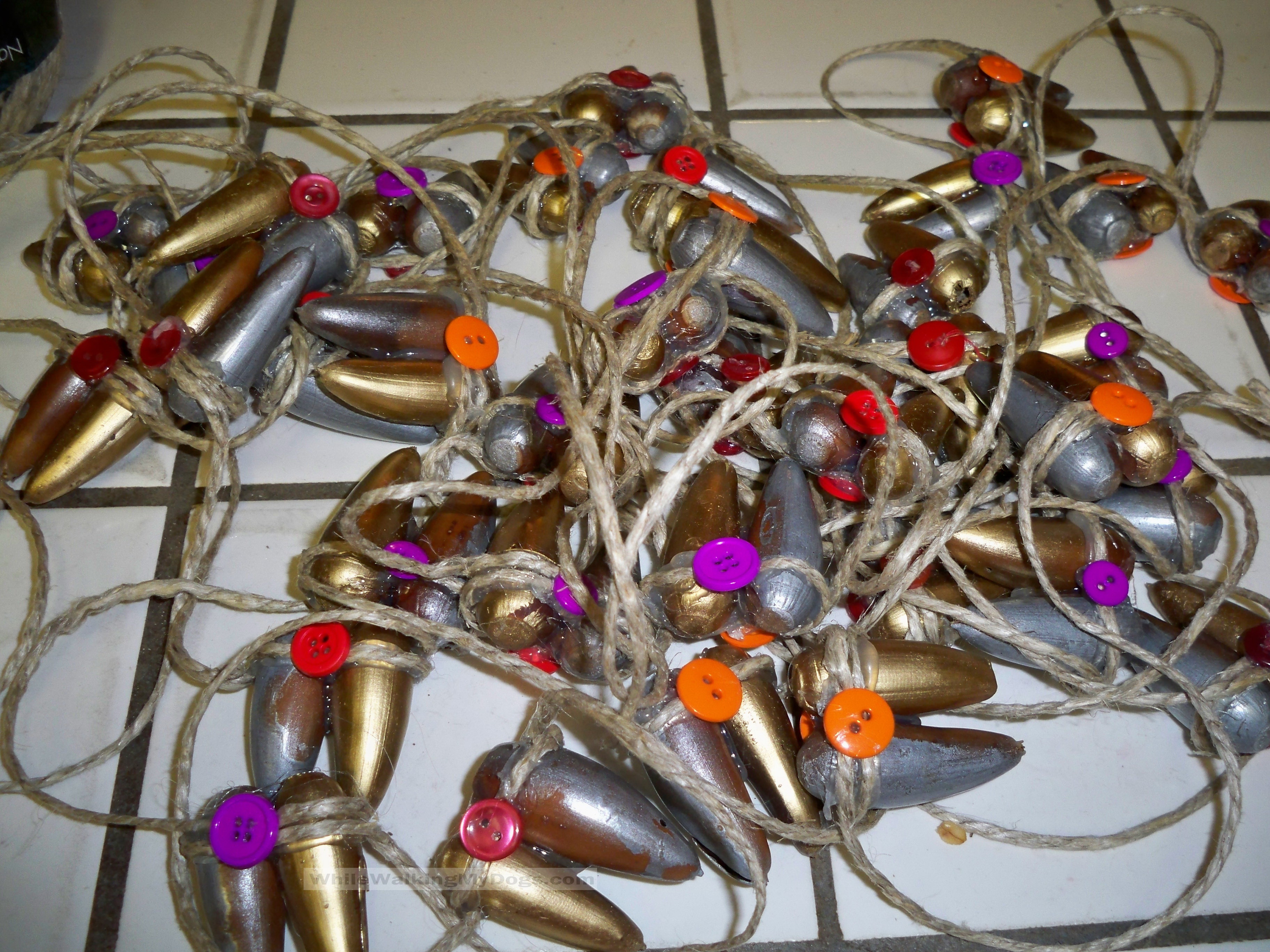 Today, I put the finishing touches on our garland. I originally collected the acorns and washed them. I then spray-painted them gold and silver. I took a gold acorn and a silver acorn and hot-glued them together. I then wrapped hemp twine around the two glued acorns and added a colorful button on either side. I did this every 12″ on the length of twine and have completed about 30 feet so far. I’ll spend the rest of tonight finishing the rest of the acorns and will probably end up with about 60 feet of garland. I think that will be enough for our tree.