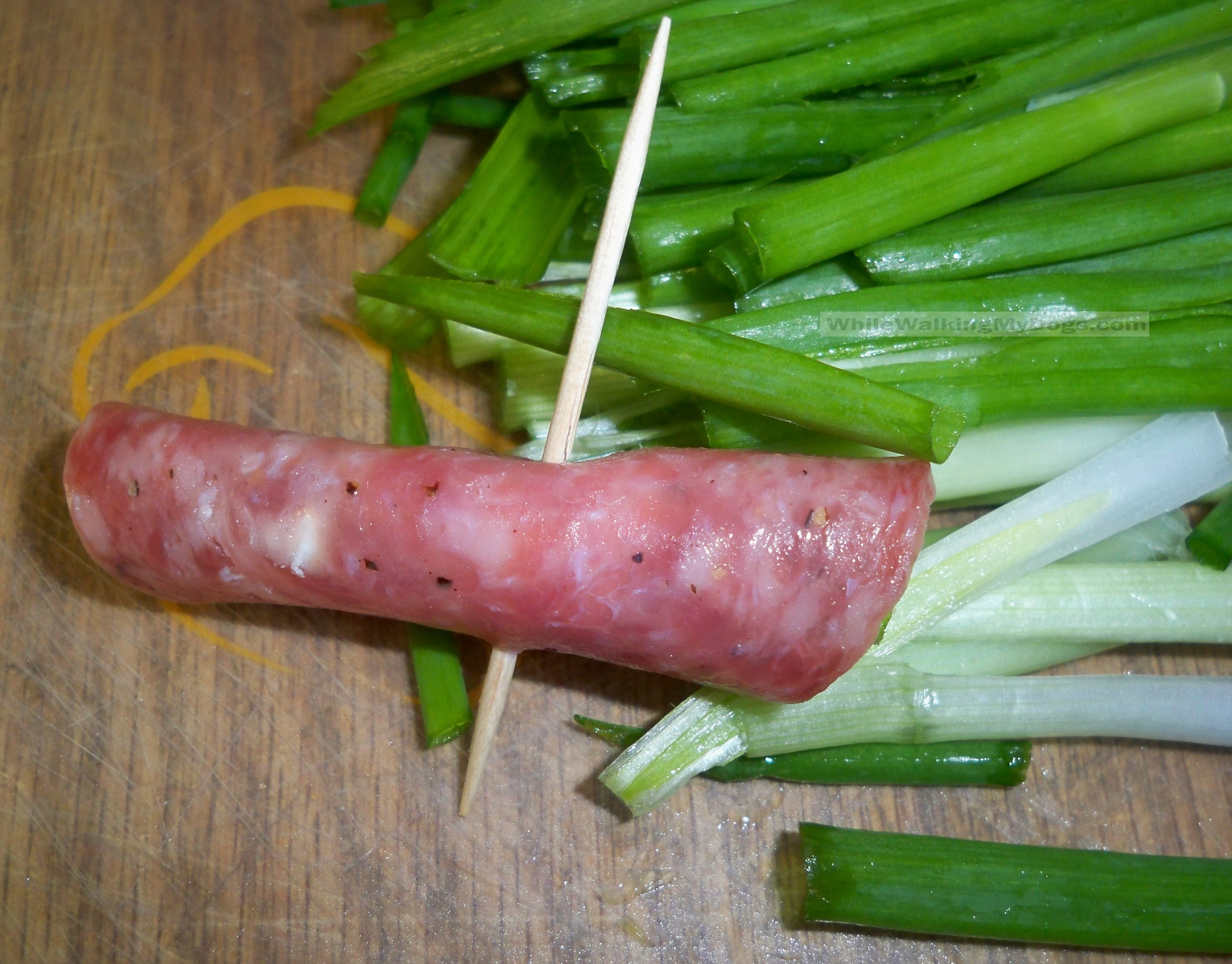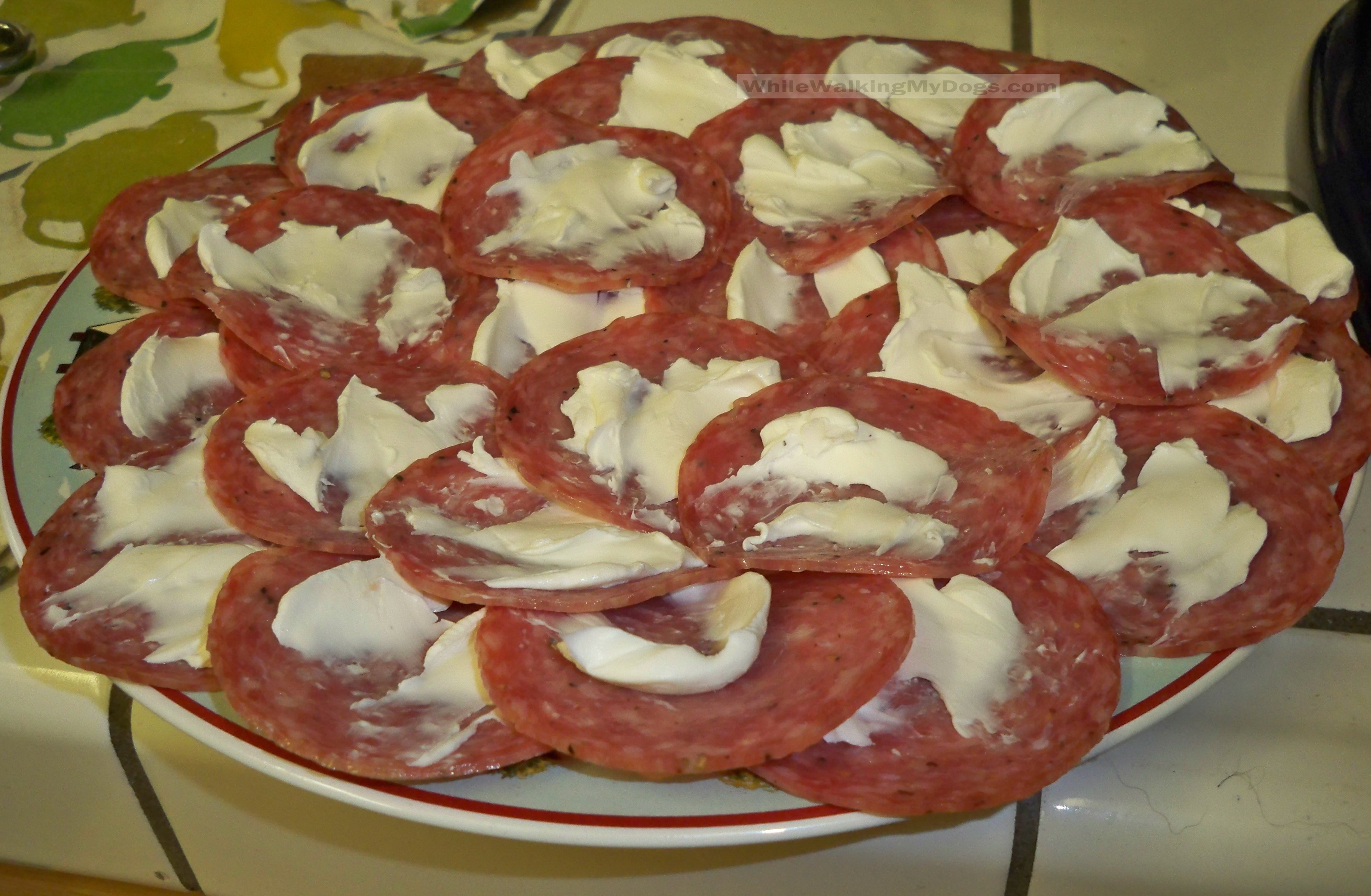 Basically you cut your green onions into thin slices to fit the diameter of your salami slices. You don’t need a lot of onion, just enough to get the flavor. You then smear the salami slice with a bit of cream cheese, lay the onion across the middle, roll that baby up and secure it with a toothpick. Easy, peasy. Mike helped me today by prepping all the salami slices with cream cheese. Thanks hon!