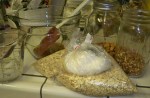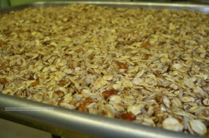 Frugal Girl’s recipe calls for vegetable oil and I’m really into using coconut oil for all my baking, so I made that substitution. No biggie. I always use almonds if I have them, but there have been occasions when I have a lot of pecans, so this batch today is a combination of almonds and pecans. Once again, no biggie. My addition: ground flax seeds. I add about 1/4 cup for the omega-3 fatty acids. Normally I would add the dried fruit, but I’m out at the moment and we’d rather have granola sans fruit than no granola.