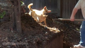 Mike and I started Monday of this week by clearing away the old retaining wall and digging a 12″ X 60′ trench 12″ deep. Mike did all the digging with a lot of help from Ellie. We discovered that she really likes to catch dirt in her mouth. I helped by shoveling the loosened dirt onto the hill and toting the old retaining wall boards up the hill into a neat stack.