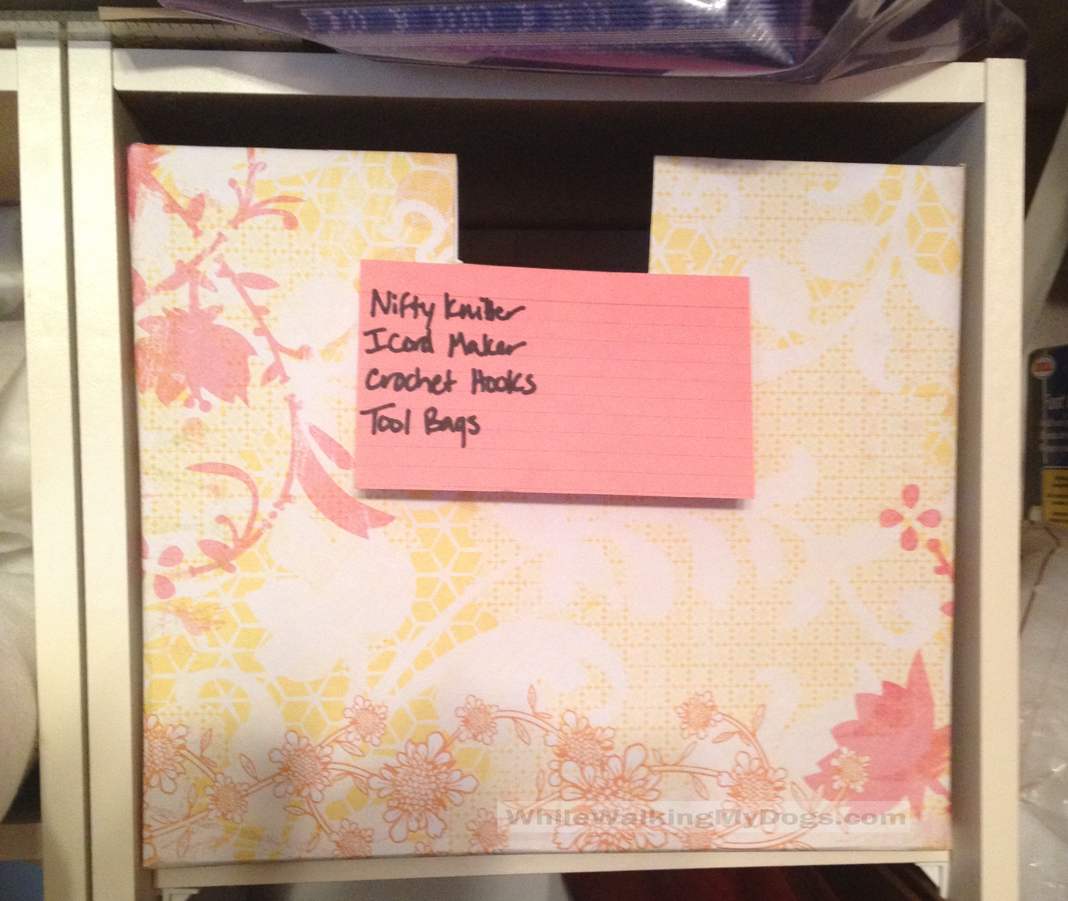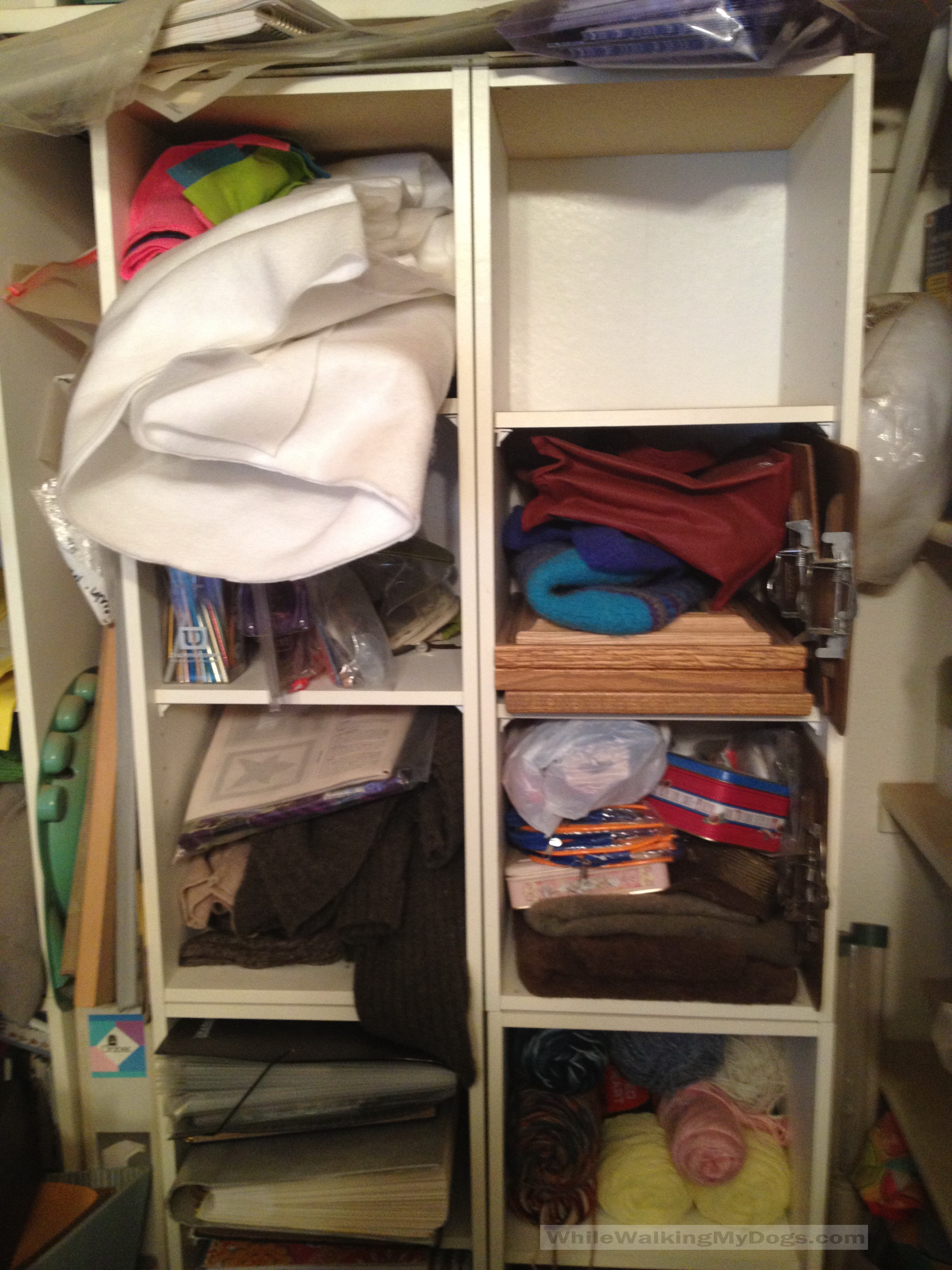 I have a collection of cubbies that I use for storage in the closet in my Craft room. I removed the closet doors years ago so the space was visible. Every now and then I wish I still had the doors so I could hide the mess :-). But I don’t so my only course is to tidy things up. As you can see I’ve let it get away from me, so when I saw this post, I knew exactly what I needed to do.