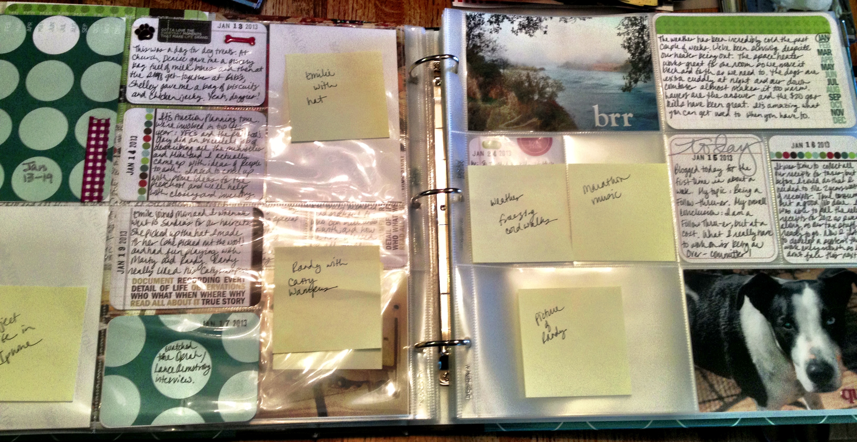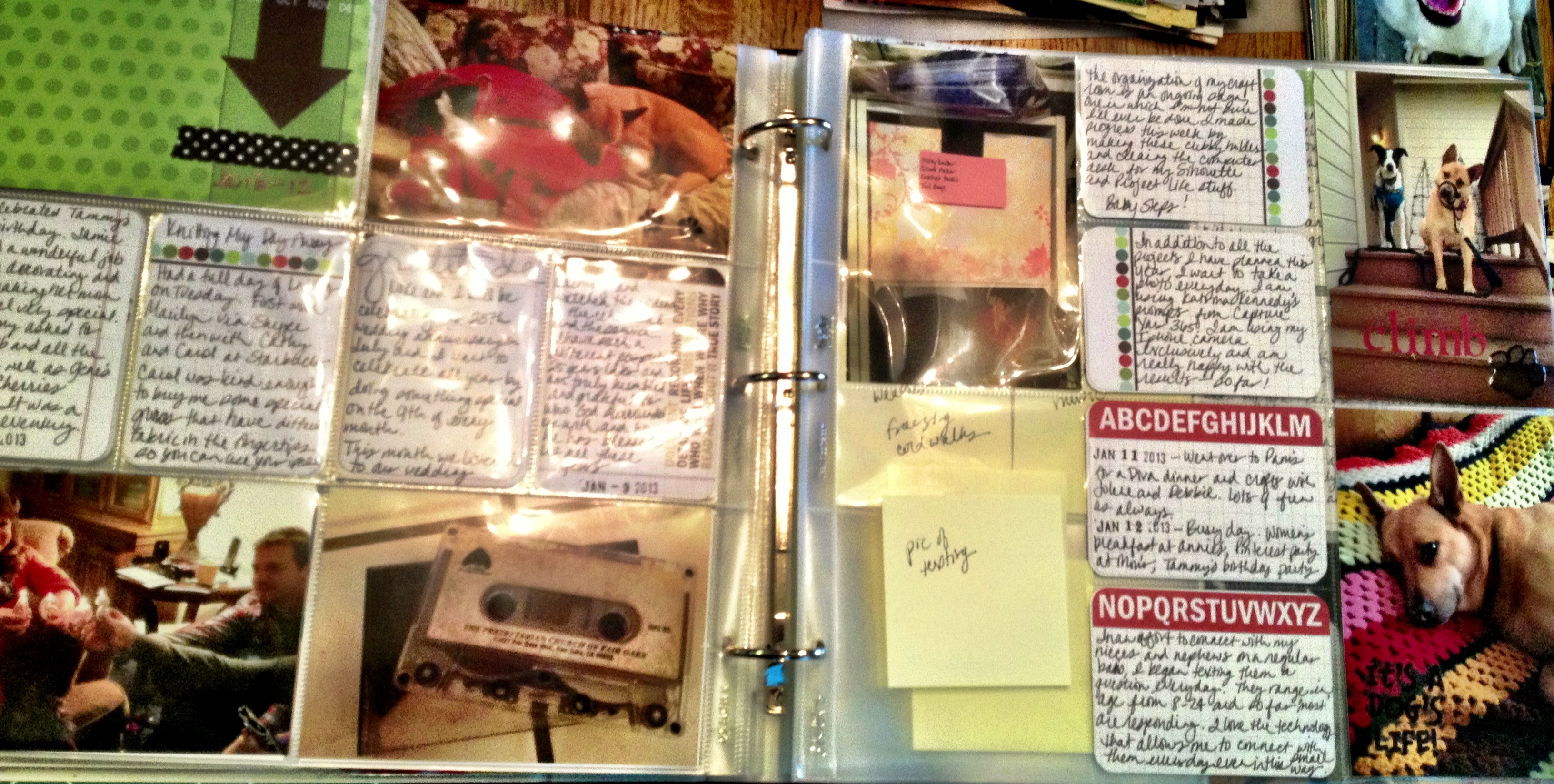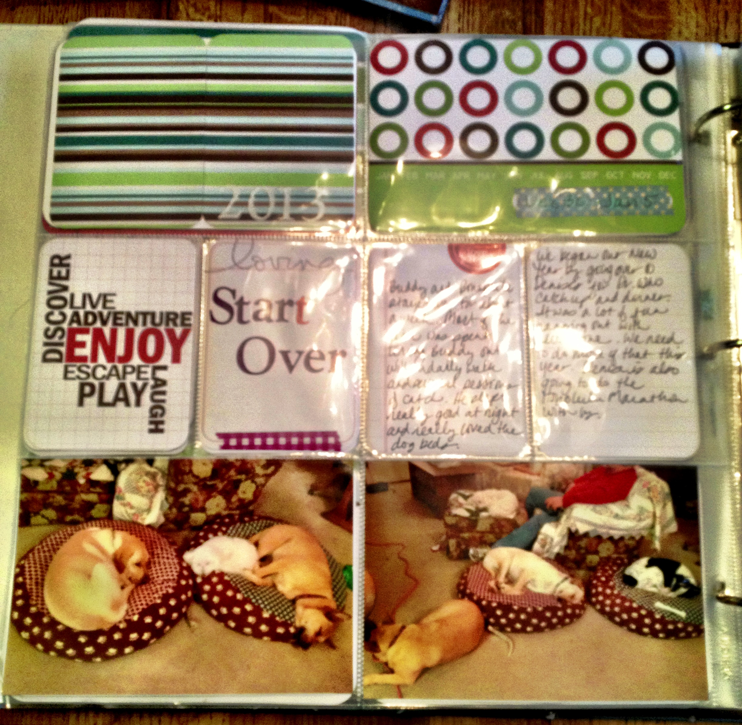 I cannot tell you how much her words instantly relieved me of the guilt I’ve been feeling at just completing two months of last year! While I won’t be going back to fill in the rest of 2012, I promptly got my album out, collected my core kit cards and a few stickers and started fresh with 2013. I had been jotting down daily memories and collecting them in my Iphone, so it was easy to write the stories and pop in the pictures.