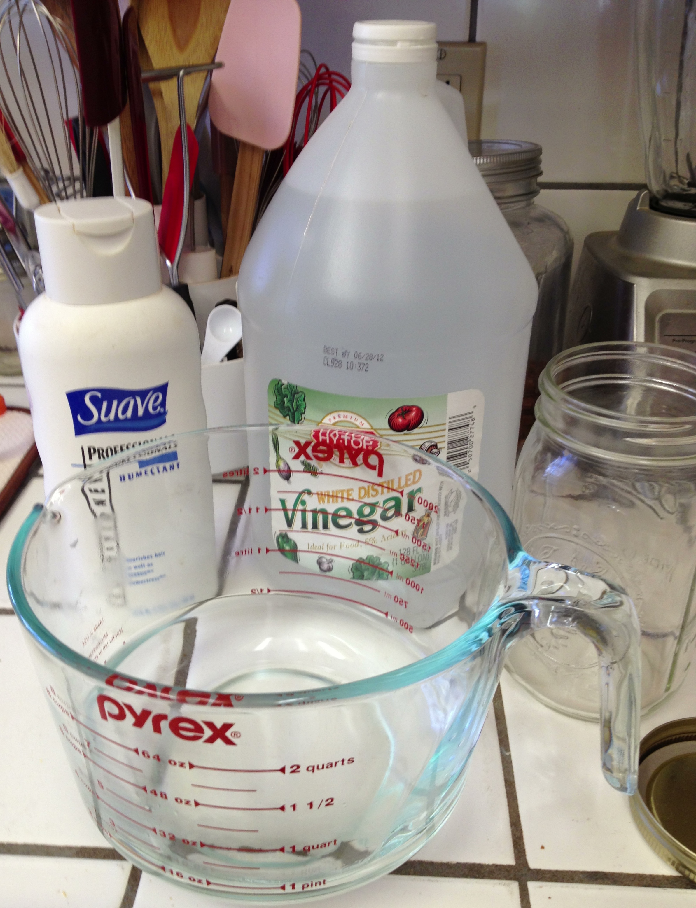 To make the fabric softener, I used a recipe from Thrifty, Crafty, Frugal. I boiled 2 cups of water, combined that with 1 cup of white vinegar and added 2/3 cup of hair conditioner. I don’t use conditioner regularly, but had a whole bottle under the sink in my bathroom. It felt good to be finally using it for something. I mixed these 3