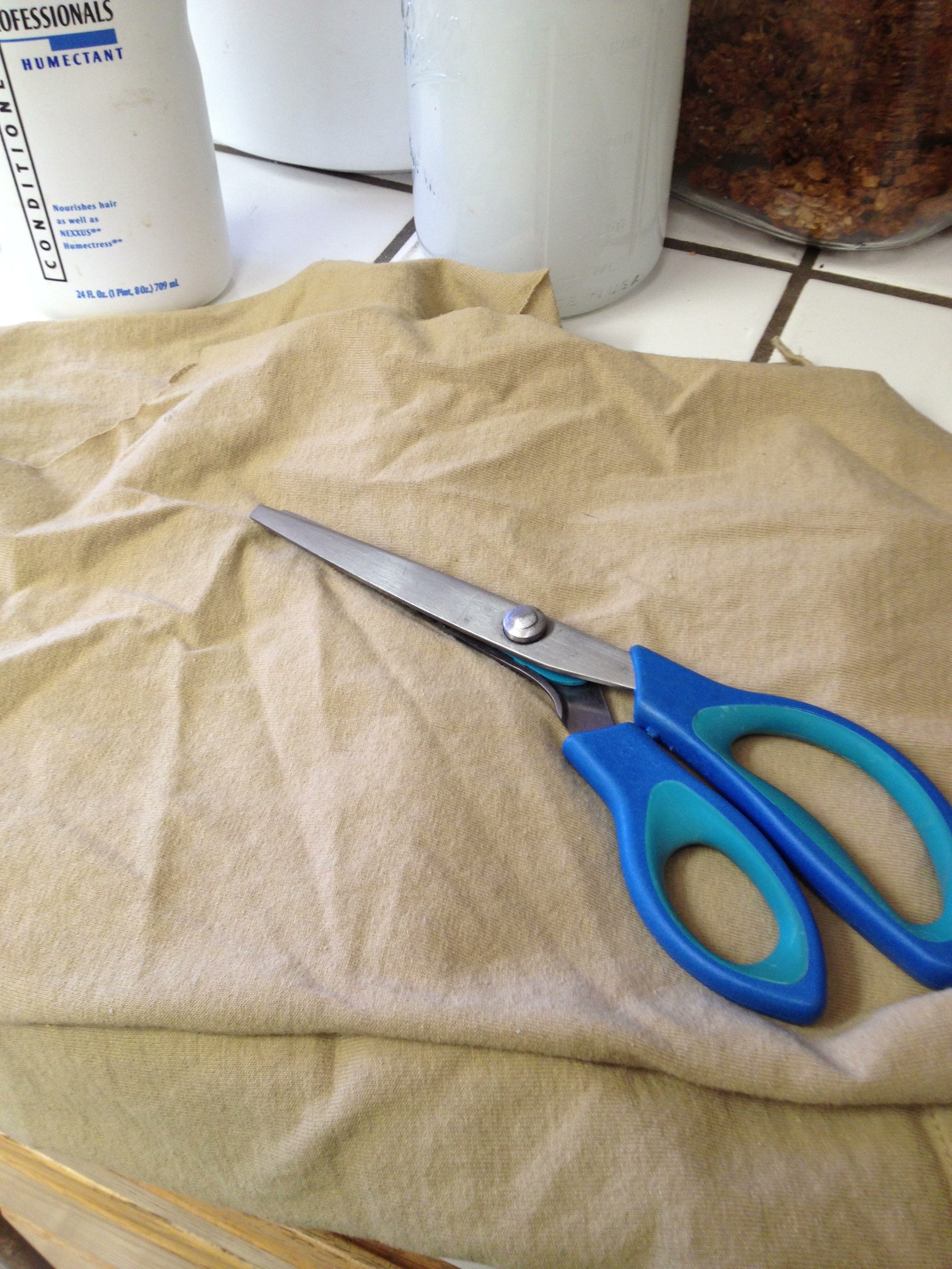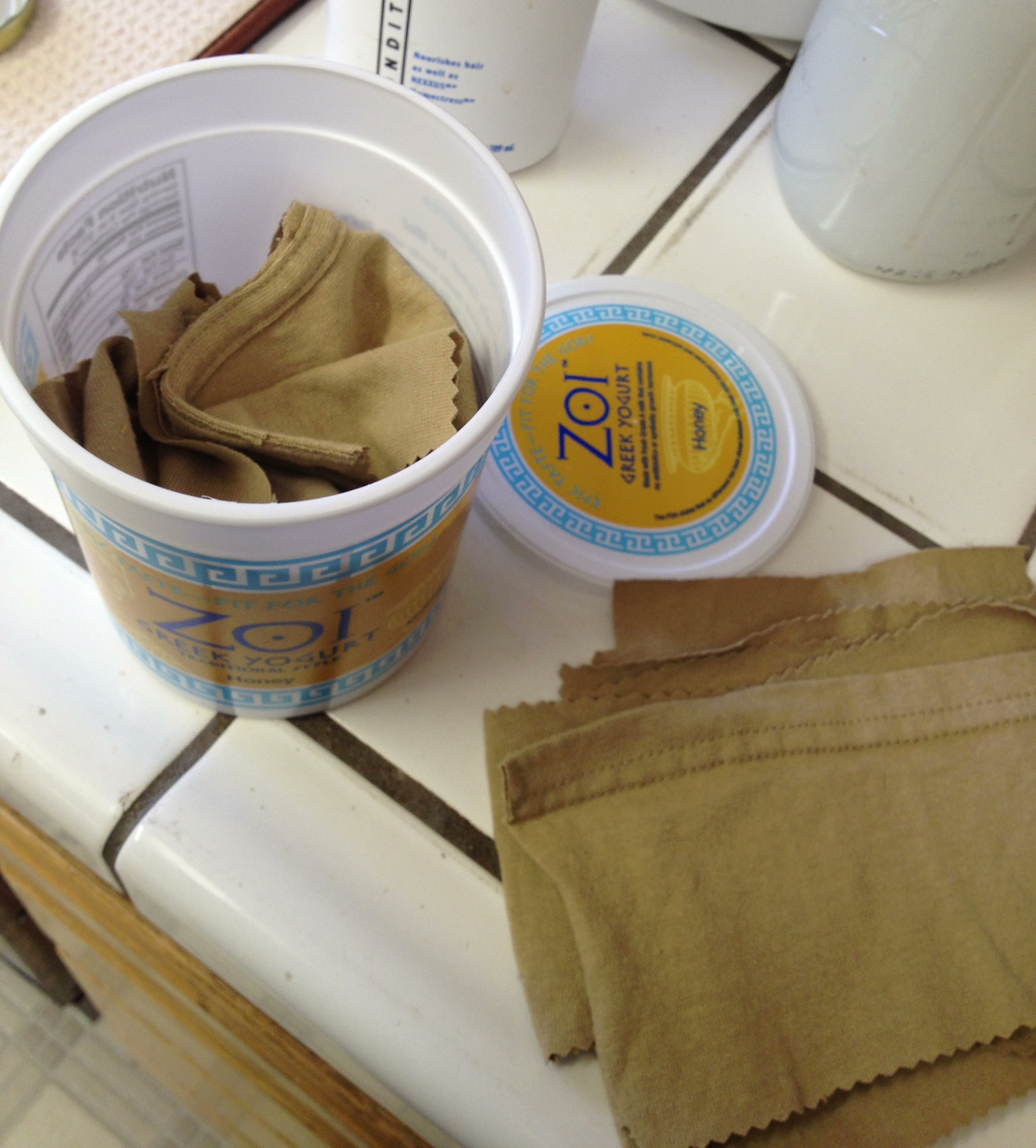 For my DIY dryer sheets, I found a post at Homemade Mamas. I found an old t-shirt of Mike’s, cut it up with my pinking shears and fished a yogurt container out of the recycle bin. I stuffed the yogurt container full of the 3″X5″ pieces of t-shirt and then filled the container with the cooled fabric softener. The recipe said to let it sit for a couple of days, but I couldn’t wait, and ran a load