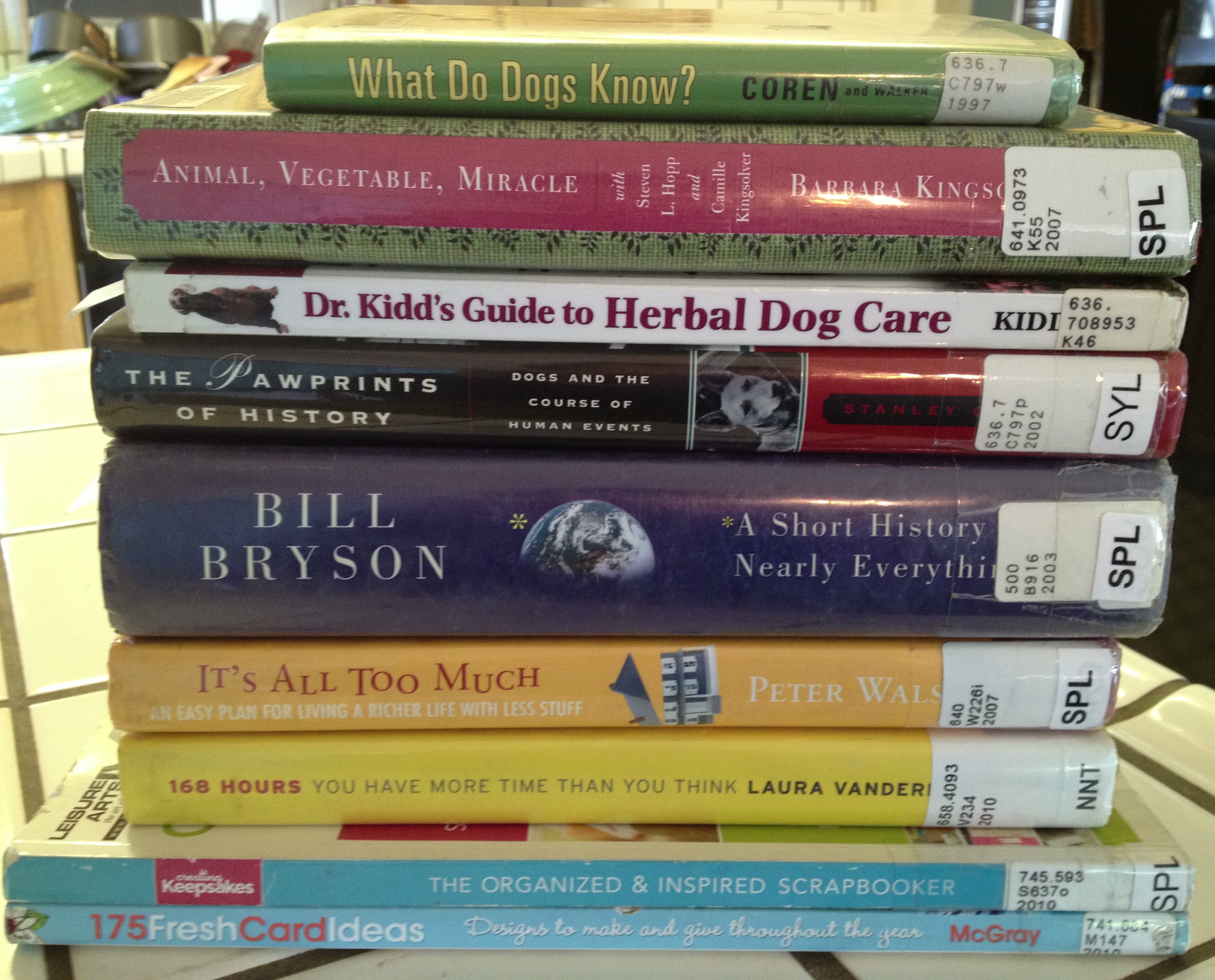 Next to dogs, books are one of my most favorite things. I wrote yesterday about my new library experience and even posted this picture of a pile of library books.