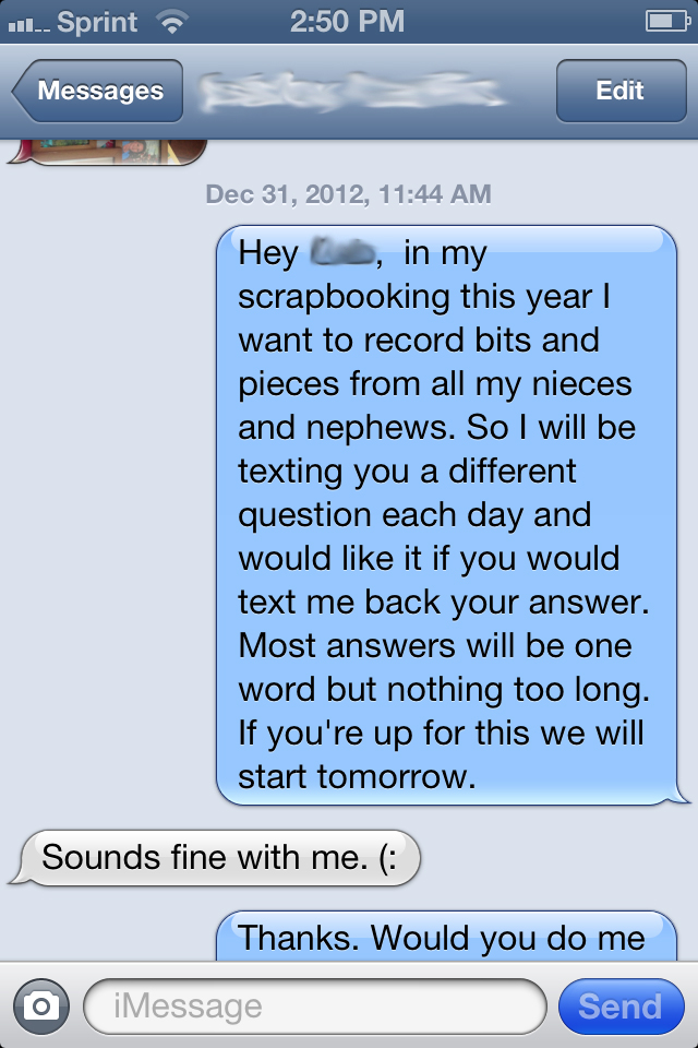 At the beginning of the year, I started texting all my nieces and nephews (7 in all) a question every day. It’s been a fun exercise that connects me with all of them every single day, and it also gives me some insight into their lives. They range in ages from 8 to 24 and have been awesome at responding to my sometimes goofy questions. I’m keeping track of their answers and haven’t decided yet what format I’m going to use to display them. That will come later.