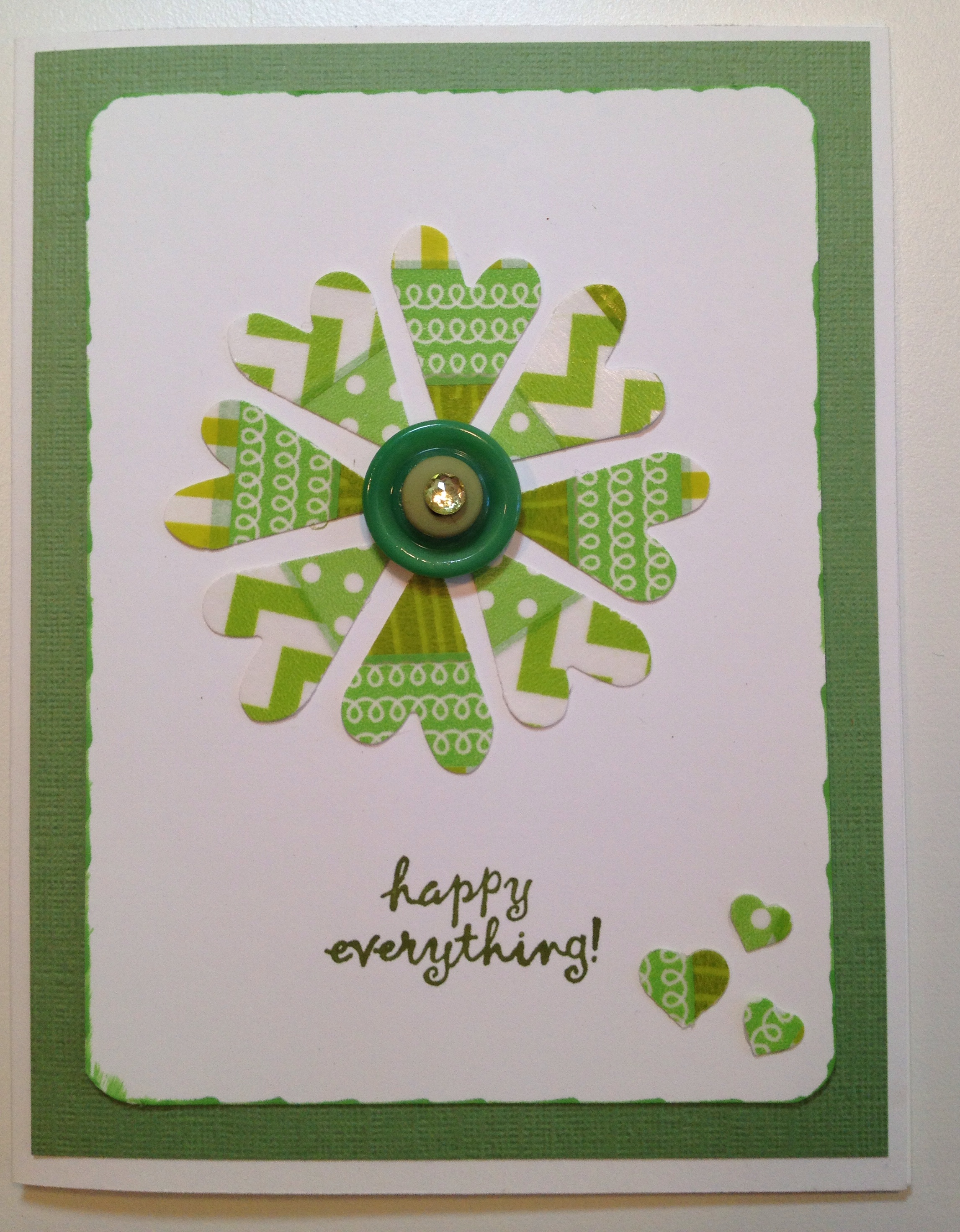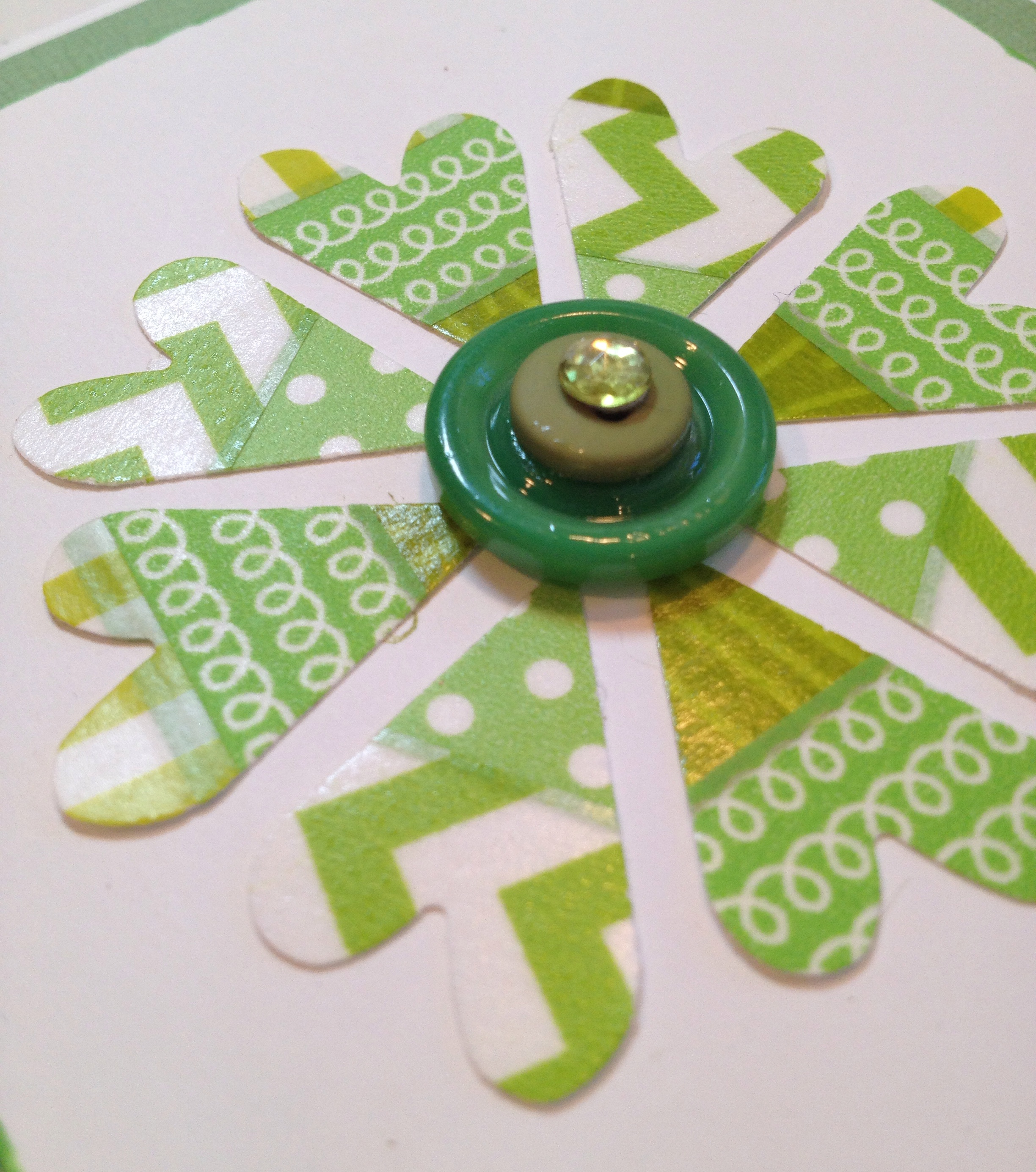 be used for any occasion, but with St. Patrick’s Day around the corner and inspired by the color green, I created this gem. Initially I was going to make shamrocks with the hearts, but that idea worked better in my head than in real life. I used a technique involving washi tape and punches. That’s the creative process for ya!