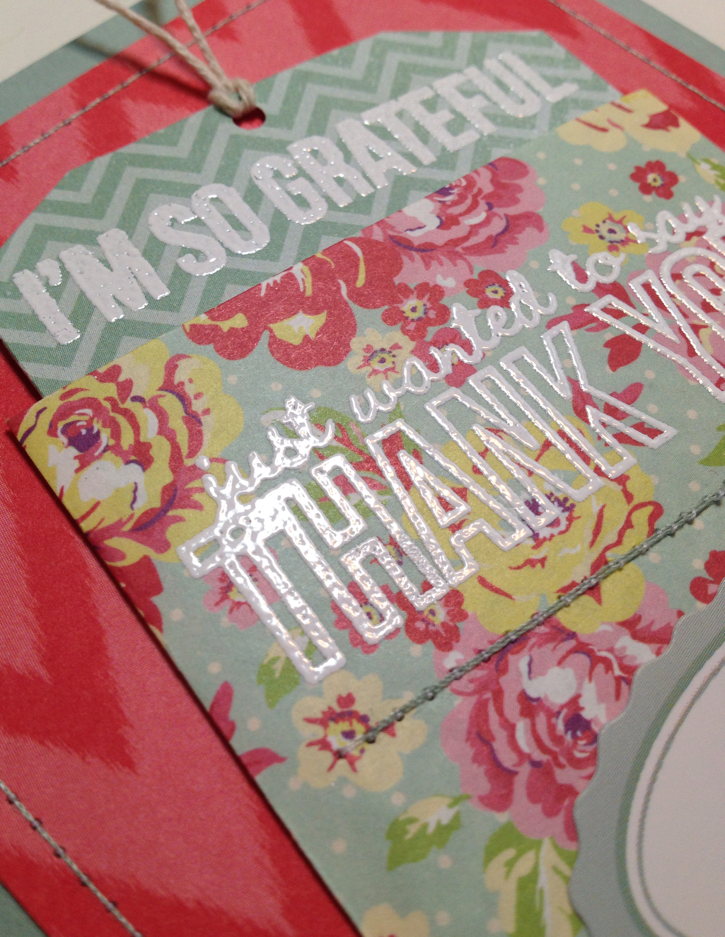 I was drawn to the colors in the photo, particularly the blue/green. My first creation (you can enter as many times as you want until May 5th) began with the blue/green color. I chose a mini craft bag with a blue/green background to stamp my sentiment, “just wanted to say thank you“, from the Many Thanks stamp set. I found a sage green mini chevron card to place in the craft bag and also stamped “I’m so grateful” from that same set. All my stamping was done with Versamark ink and white embossed. From there I chose a pink chevron cardstock to highlight the pink in the roses. The bold pink against the soft blue/green is a striking color combination. I stitched the pink chevron print to the sage card base, glued the craft bag to the pink chevron and put the sage mini chevron card into the bag. To finish off the card, I found an oval label which I placed on the front of the bag and placed a heart brad on top of that.
