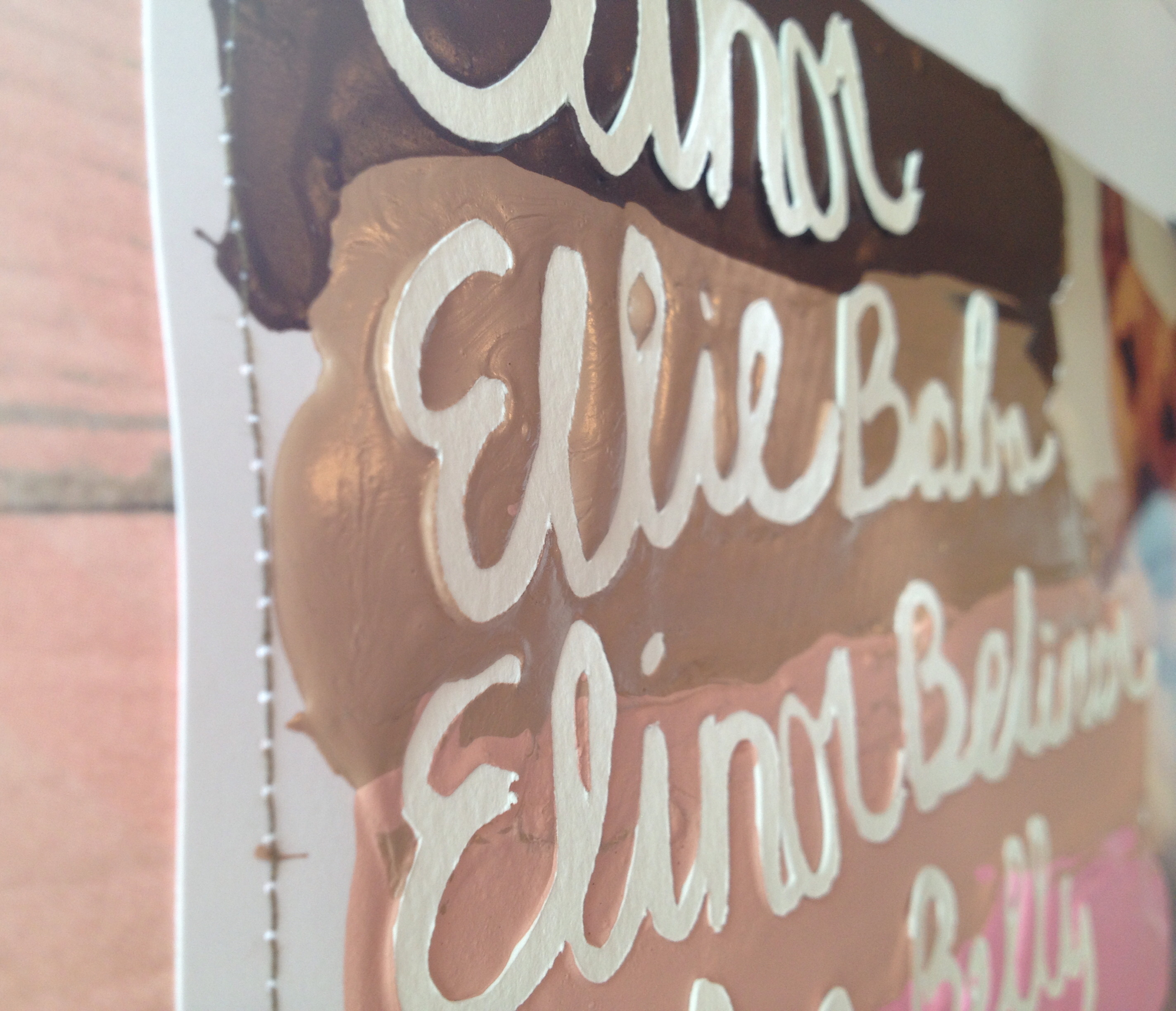 In both layouts, I first hand wrote my words and then cut them out of heavy watercolor paper with my Silhouette die cutting machine. The weight and the type of paper was important because I was going to be pushing them into thick paint. I chose 5 different colors for each layout, mixed the acrylic paint with white tacky glue and spread the colors horizontally. I then needed to wait 24 hours to make sure the paint was completely dry. I chose colors consistent with the photos and the dogs.