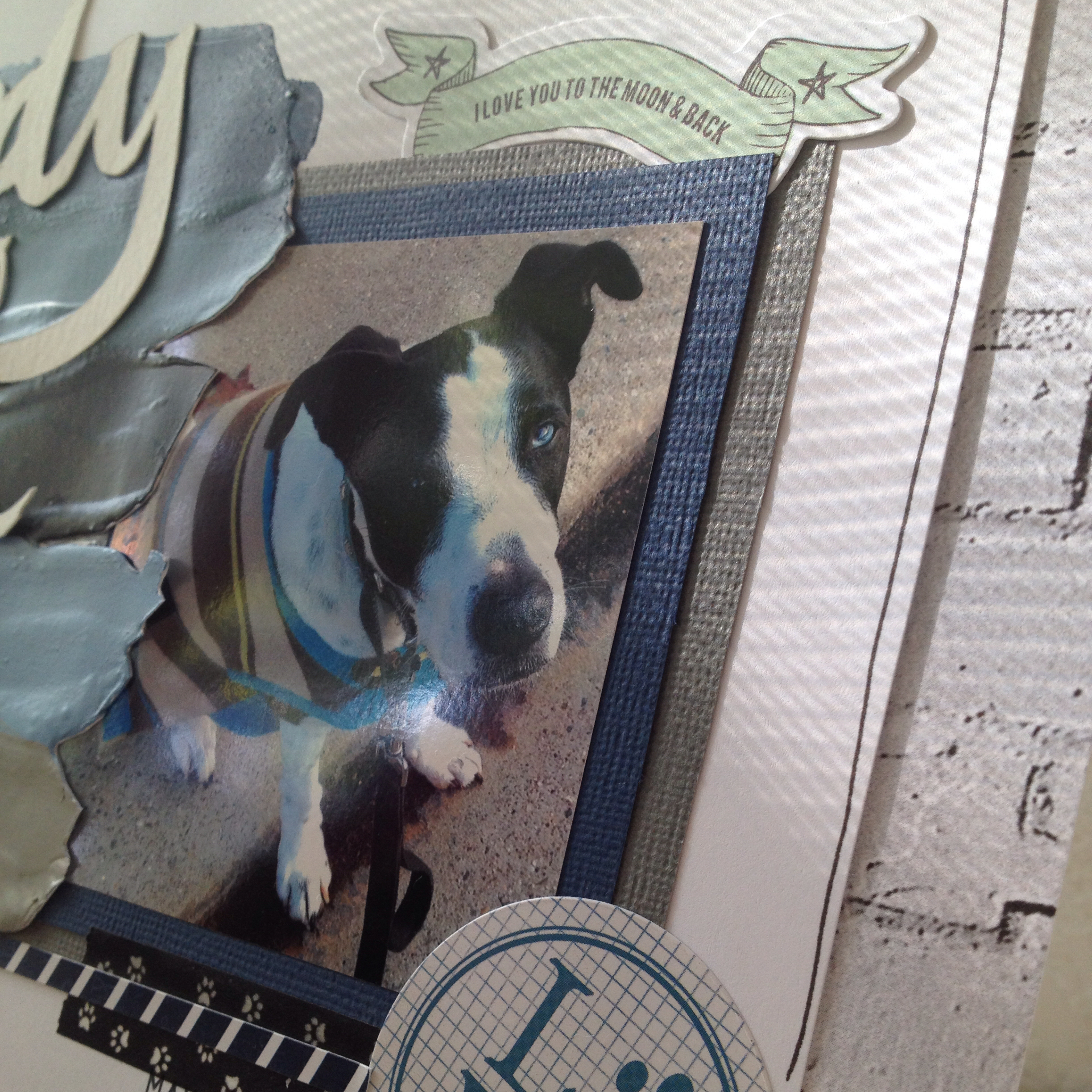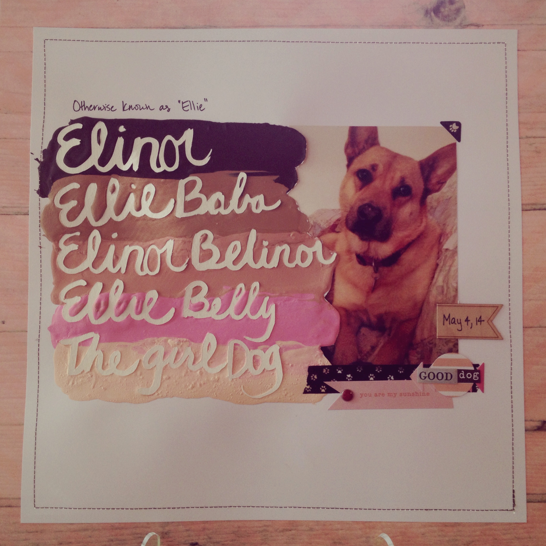I made four layouts for National Scrapbook Day and the final two were similar in technique and title, but with a couple differences. One was titled “Otherwise known as ‘Ellie'” and the other “Otherwise known as ‘Woody'”.