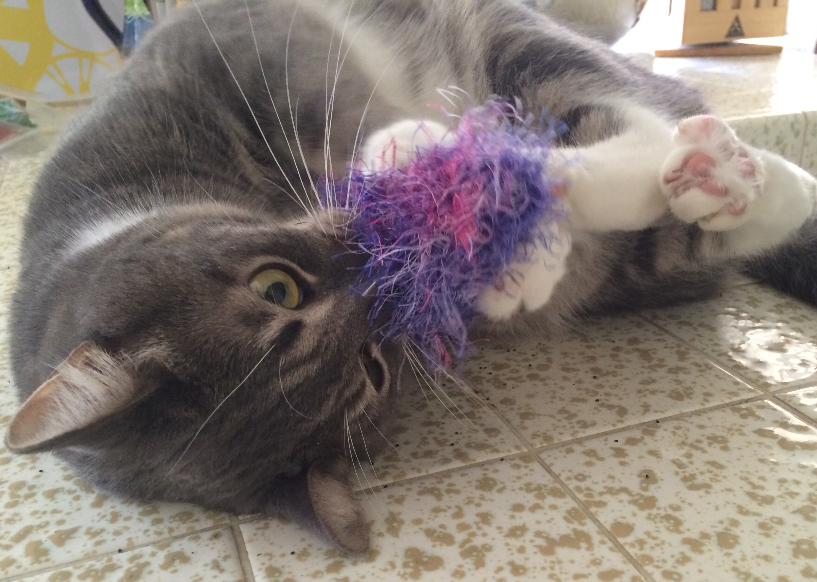 Sheldon, my friend’s very agreeable cat actor, was willing to play with a couple of the toys for pictures. He is featured here playing with Purrfect Purples and Razzy Red. The toys are durably made with 100% acrylic yarn and stuffed with premium catnip. Guaranteed to drive your cats CattyWampus!