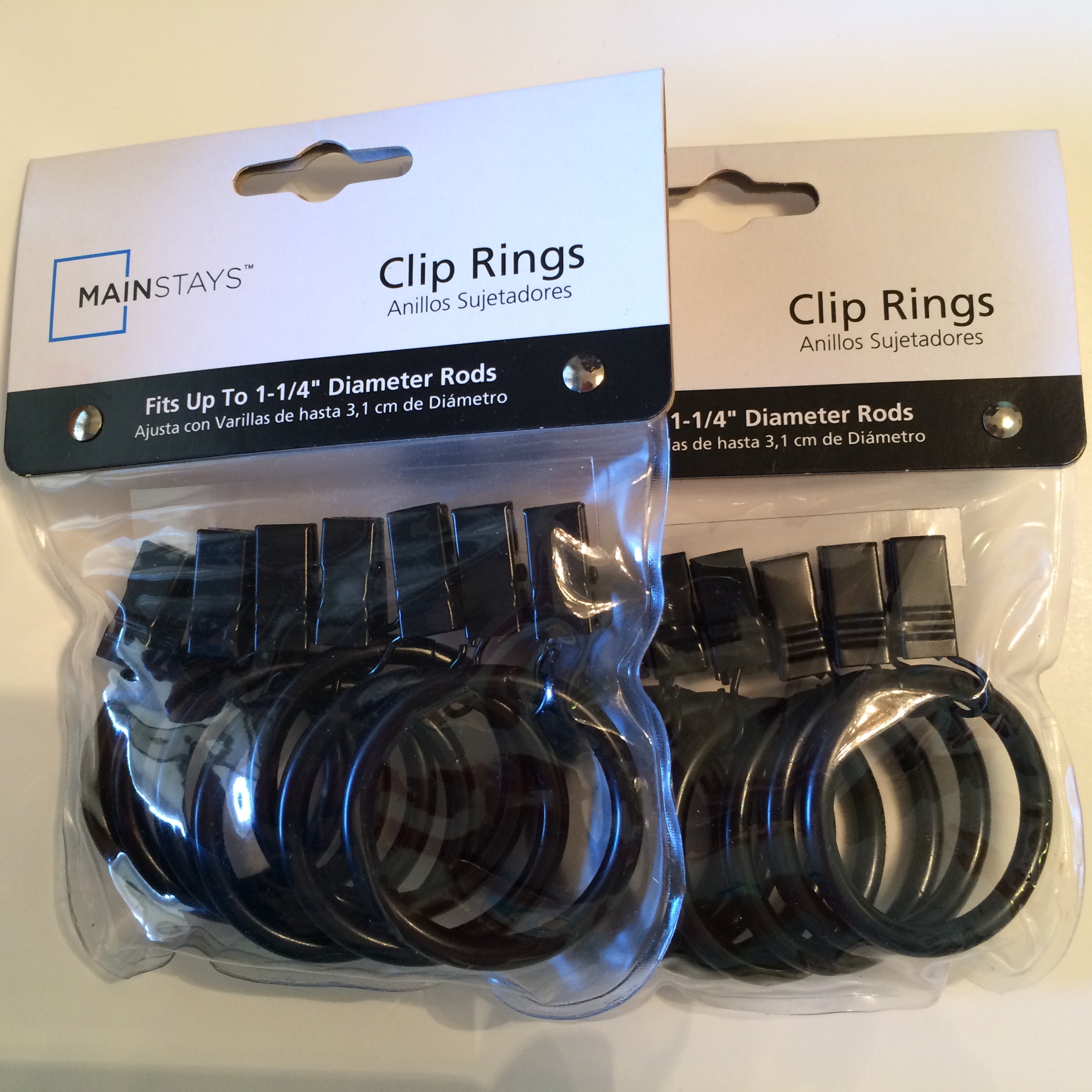 <–I installed a curtain rod in my craft room under a set of cabinets for hanging cards. These clip rings are the perfect size. Cost: $1