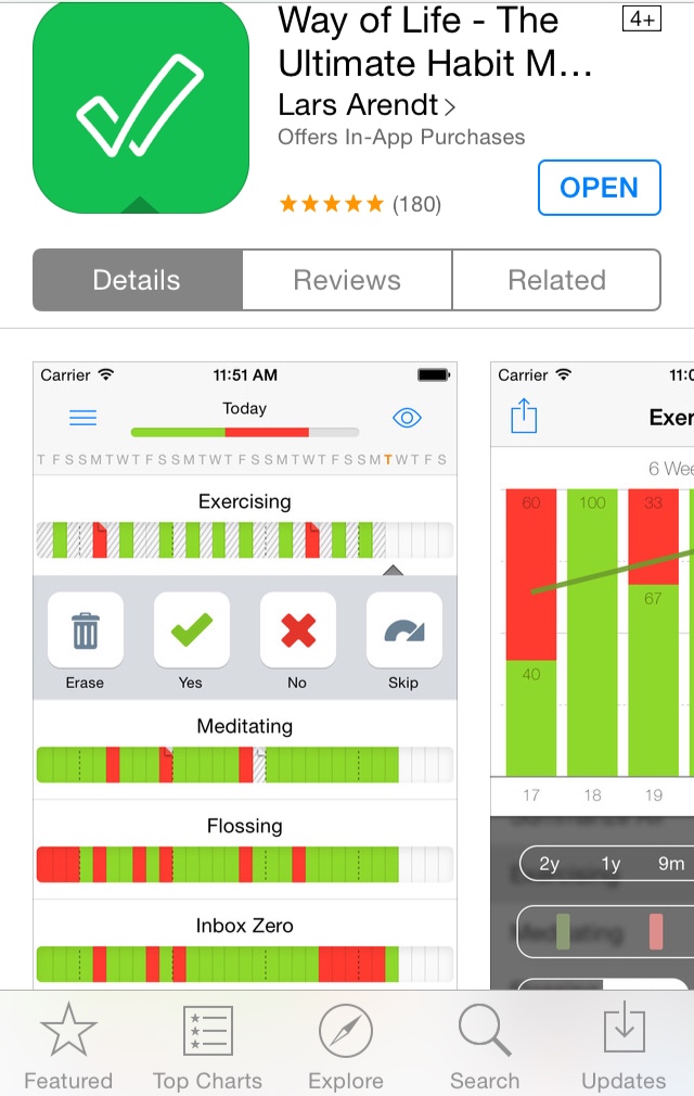 1. Discovered a new, free app called Way of Life for the iPhone. If you have a bad habit you want to break or a good one you want to start, this app can help. It shows your progress in a color-coded format and even makes charts.