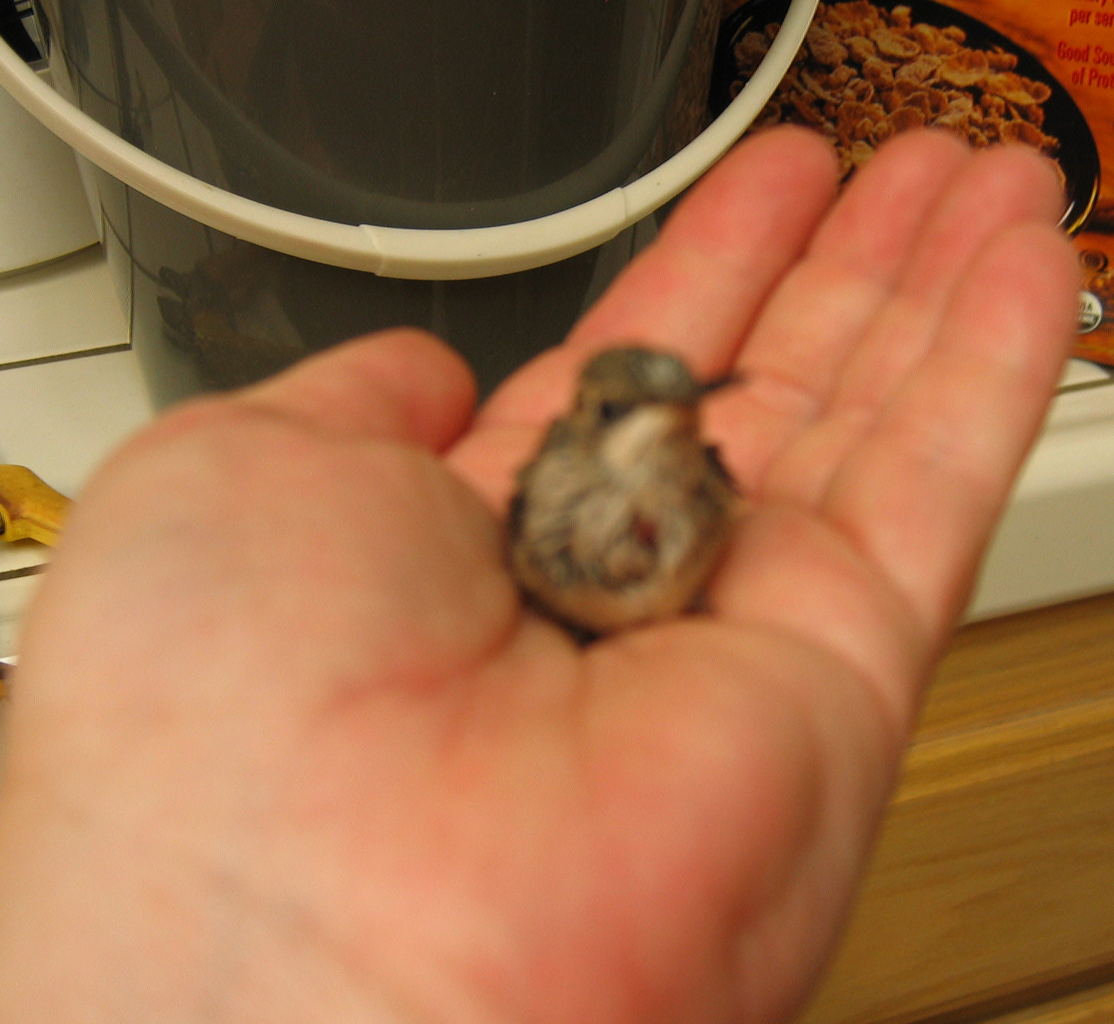 It was about 8 years ago and I called him Peeps. I discovered the little tyke one day as I was walking down the stairs with the dogs. He had been doused with water from the sprinklers and he was alive but not moving. He was tiny – probably an inch tall. I looked to see if I could find his nest but it was no where to be found. Our trees are pretty tall and it was a miracle he survived the fall and the many cats in our neighborhood. I quickly hustled the dogs back upstairs and went to find a shoebox.