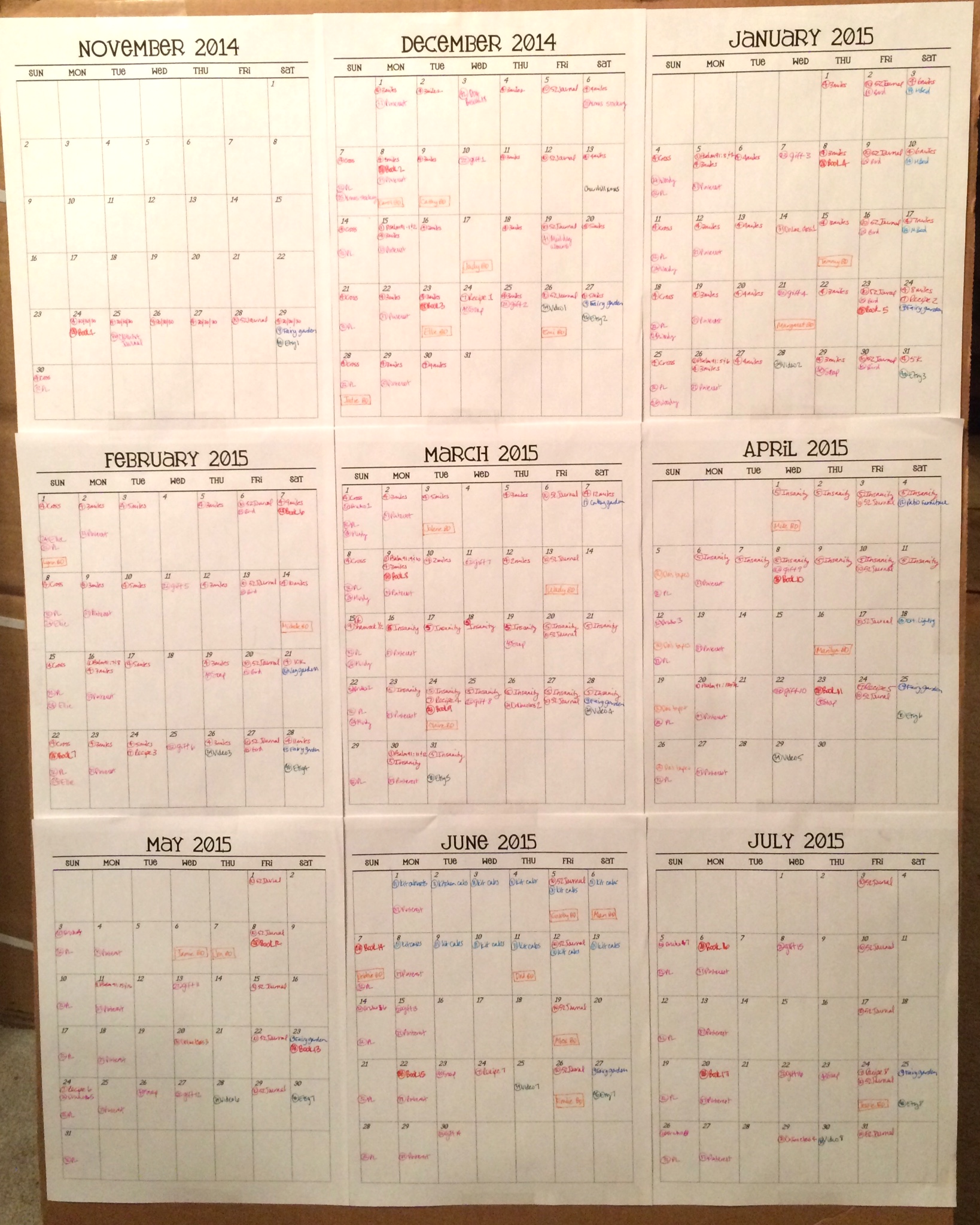 Since announcing my Quest46 idea, I’ve had a few people ask how I plan to accomplish 46 items in a year on top of everything else.  The people who’ve asked are individuals who know me and my propensity to over-plan and over-commit.  Before I decided to do this, I printed 12 1-month calendars and mapped out each item over the course of the year.  I attached the calendars to a big piece of cardboard (front and back) so I could see the whole year.  Some months are going to be very full, but if I work my project tasks, I should be able to keep up.  I know I’ll be making adjustments as the year goes along, but all in all I think I was pretty conservative with how I allotted time for each item.