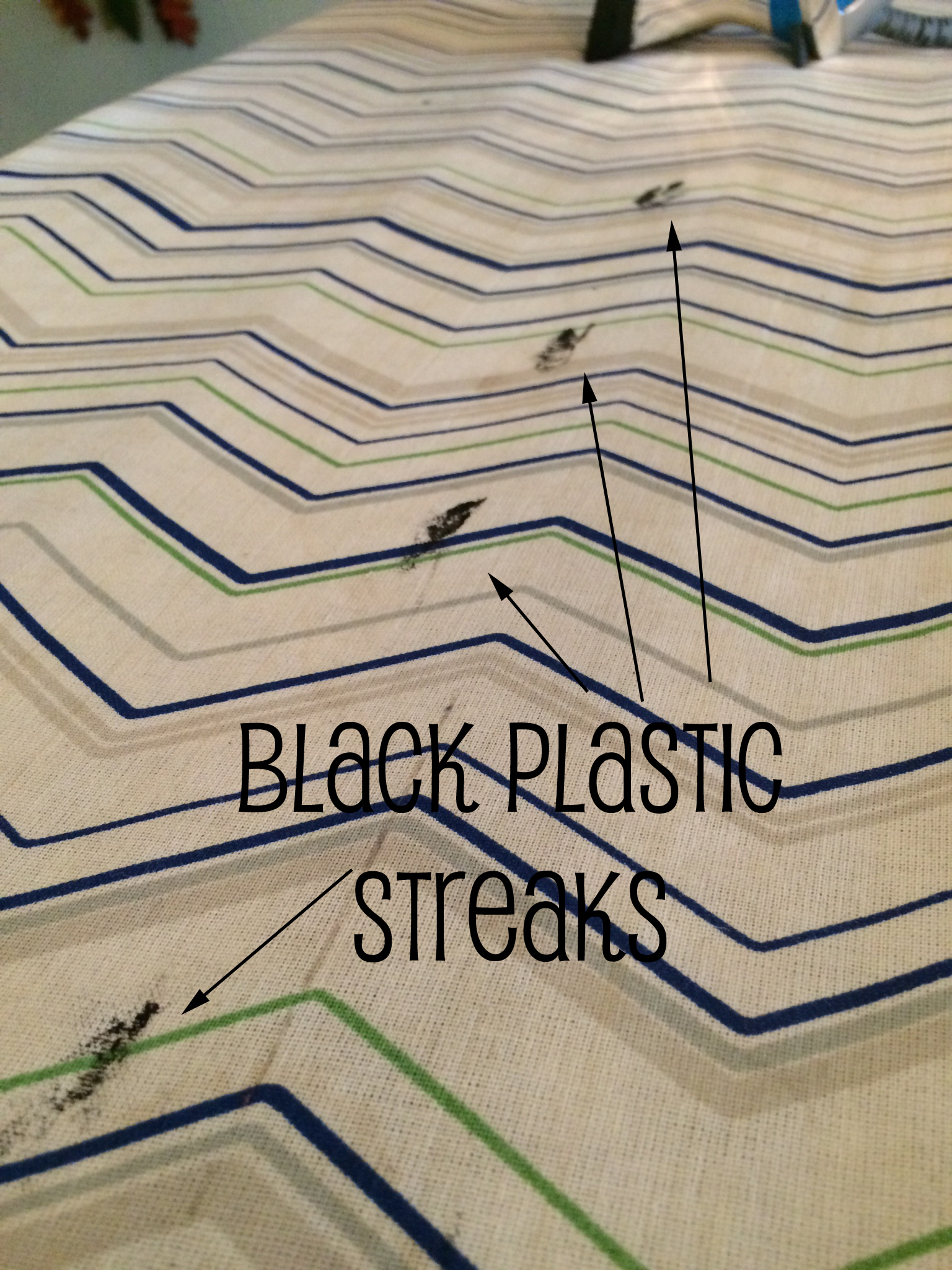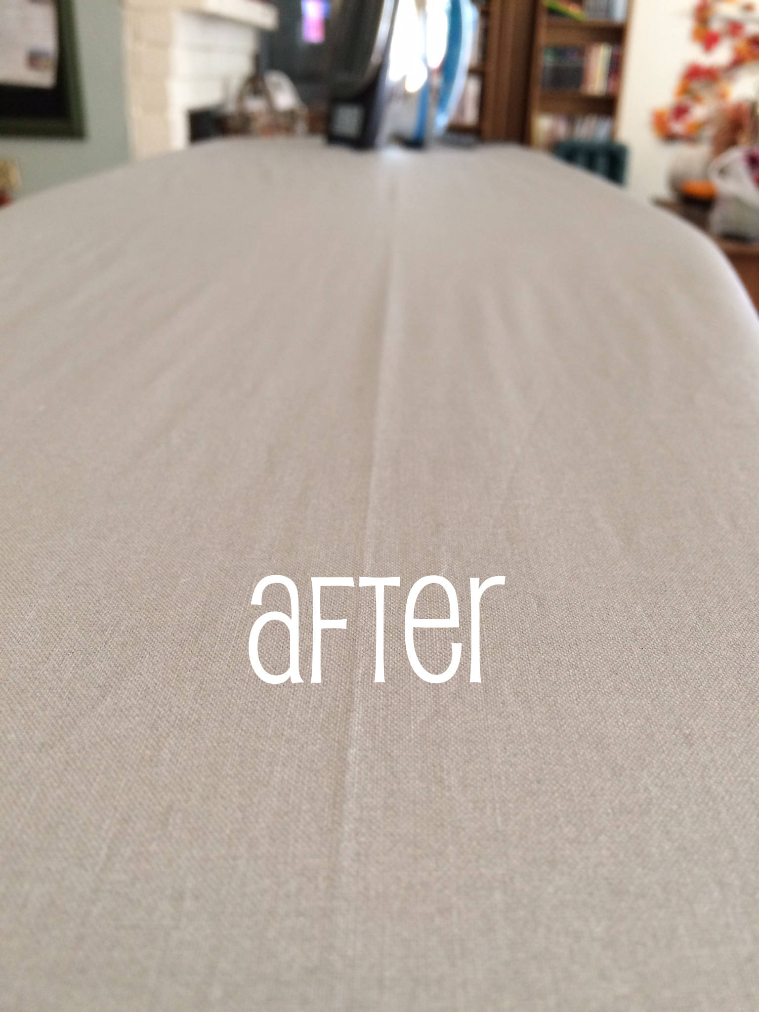 Until 2 days ago. I was ironing away and all of a sudden a black streak of whoknowswhat appeared down the center of the board. It was a complete mystery to me. As it cooled it hardened and felt like plastic. I noticed on the base of our iron there was a chip of the plastic base missing. It must have finally broken loose and I happily ironed over it leaving a lovely mark. The cover was now completely unusable and all my excuses had run out.