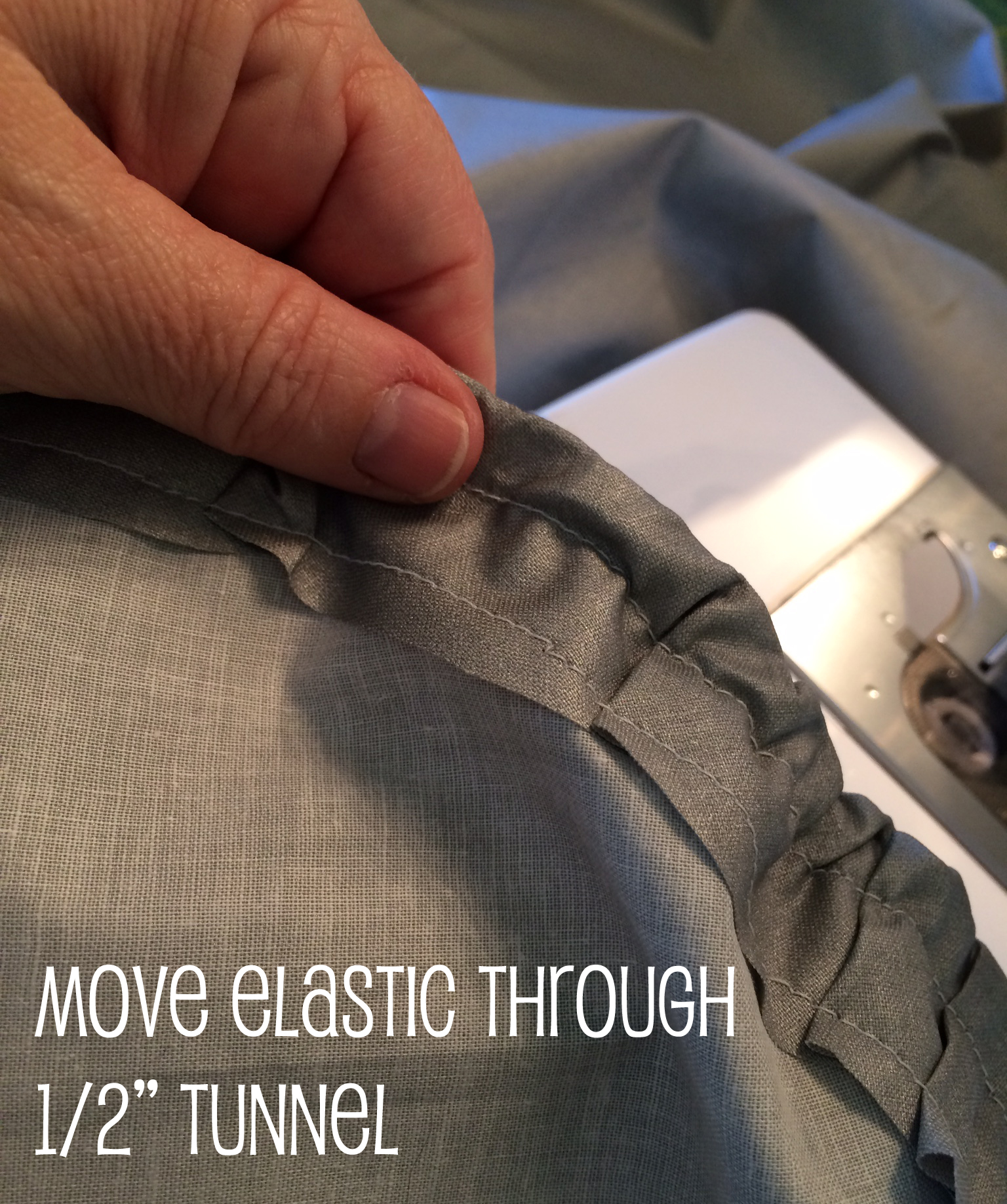 I laid the material on the carpet (over a drop cloth), cut out 3-4″ from the edge of the ironing board, ironed over a 1″ hem, sewed that down then turned the material over and sewed 1/2″ from the hem edge to create a tunnel for the elastic. I used 1/4″ braided elastic attached to a safety pin, thread it around the cover, attached the cover to the board when the elastic was all the way through and tied it off. I wanted to ensure a tight fit before I put down the padding so I popped the cover off, laid the padding on top of the board, replaced the cover and then cut away the excess padding from underneath.