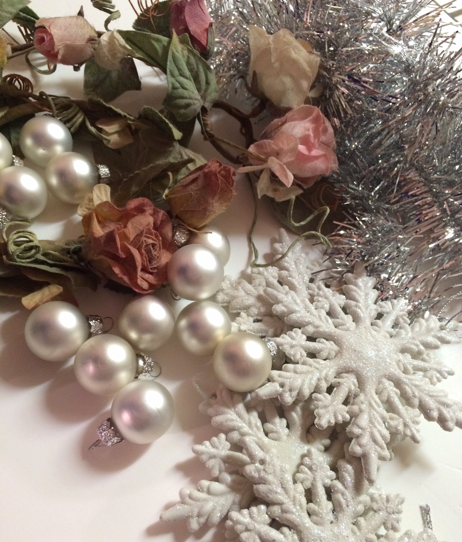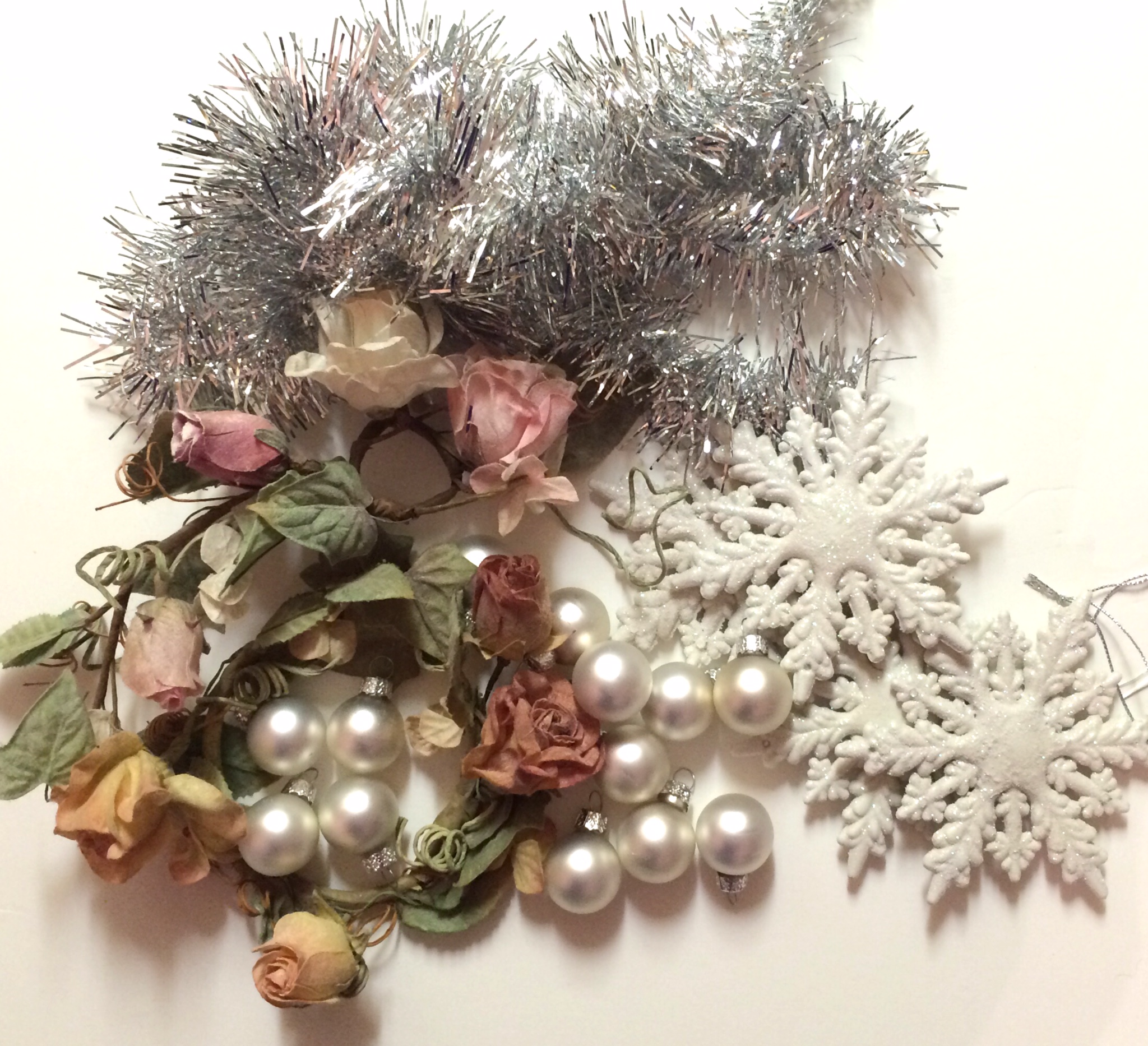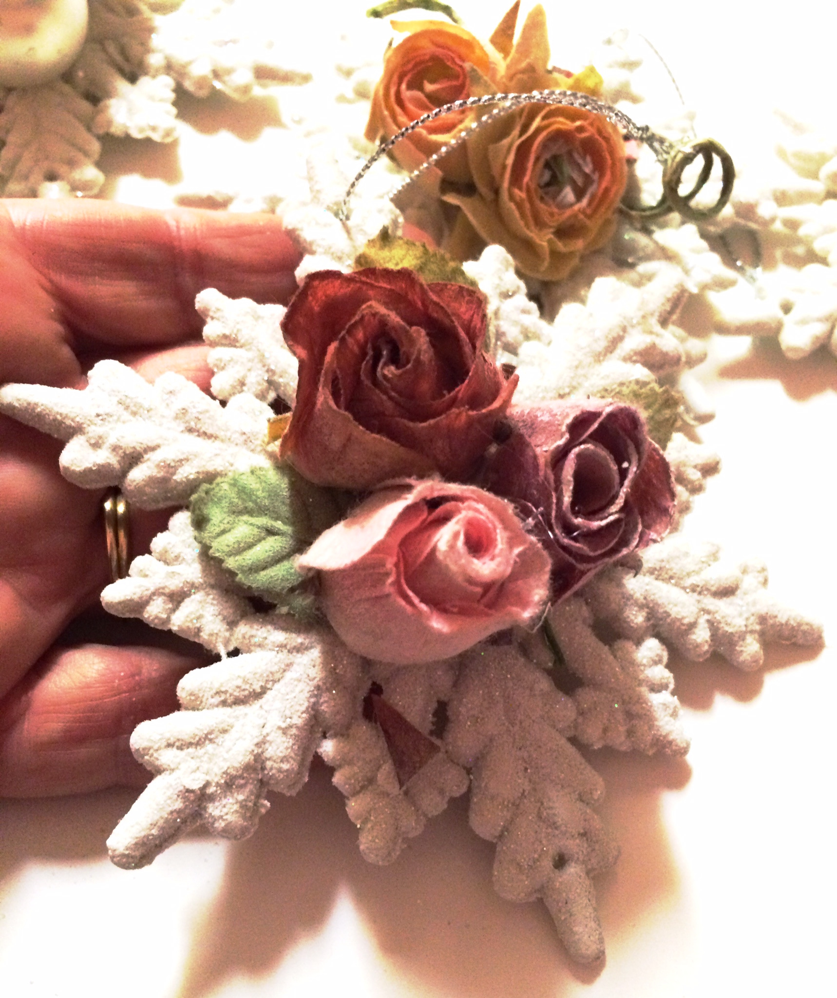 With this ornament, I was able to re-purpose a couple of vintage rose boughs as well as some tiny pearl Christmas decorations and tinsel. I also raided my stash of dried roses. I spotted the snowflakes at my local Dollar store and loved them just the way they were, but knew I wanted to jazz them up for this project.