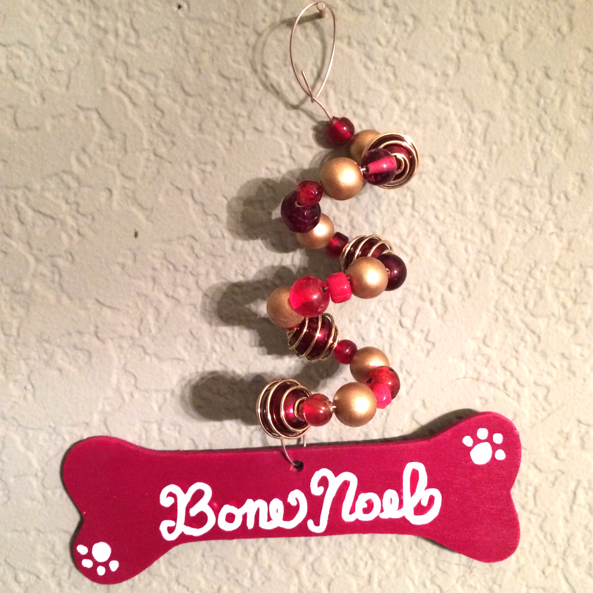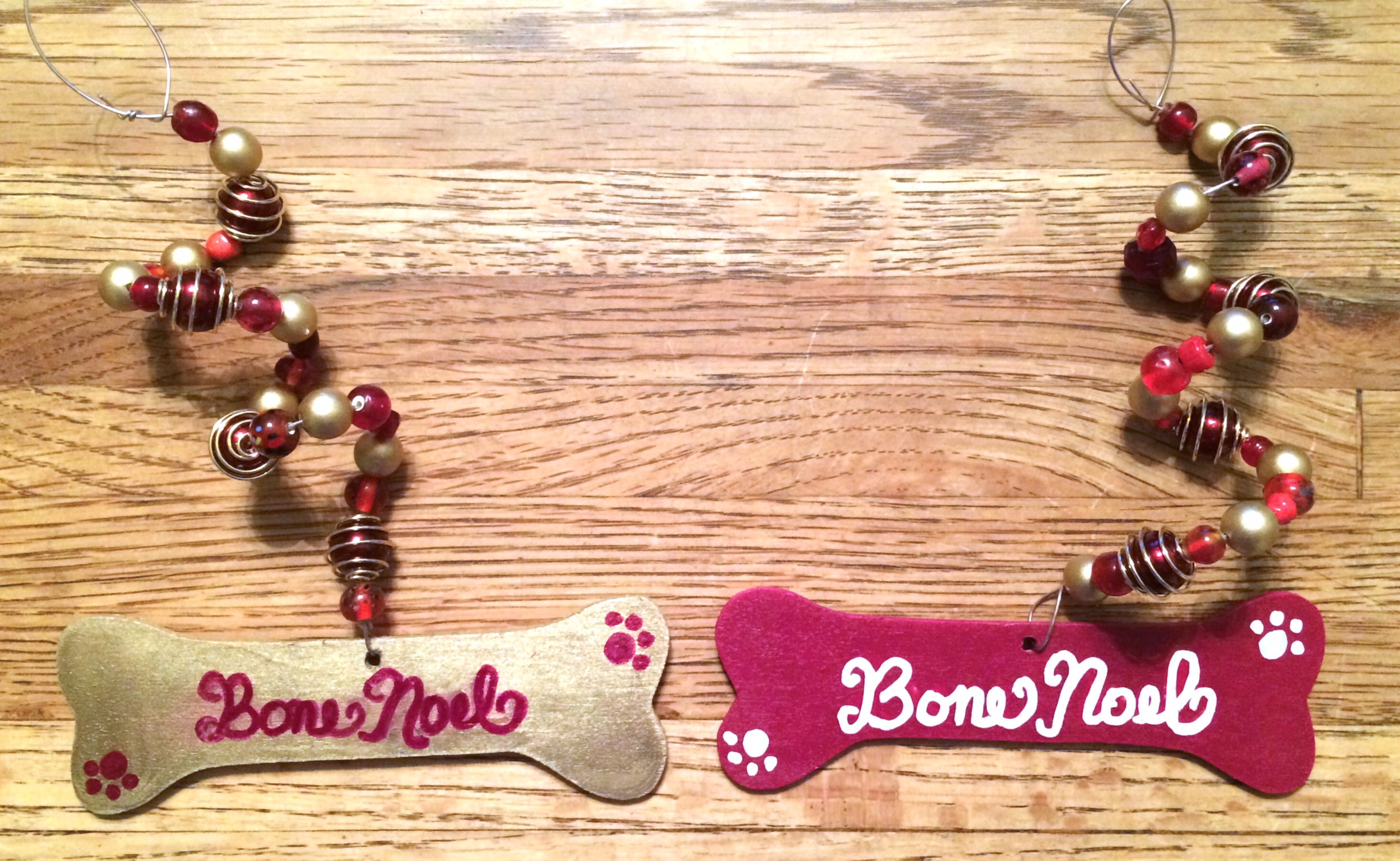 I gathered my materials and immediately pulled the beads off the napkin rings with wire cutters.  I set those aside while I first chomped 1/4″ holes at the top of each dog bone with my Cropodile.  I then spray painted the wood dog bones with gold and burgundy paint.  I chose these colors because of the colors of the beads.  I sprayed the bones twice for good coverage and while those were drying I worked on the beaded hanger.  Memory wire is awesome because it will maintain any shape you mold it into.  I used our knife sharpening 01cc933c2ff99b4e233c1dc129ac50d0fa99c45092tool which looks like a 1/2″ solid pipe to wrap the wire around about 4 times.  I used my pliers to make a loop at the top and then started to feed beads onto the wire.  I set the beaded hangers aside and went back to the dog bones.  They were completely dry by now so I took my white paint pen and wrote “Bone Noel” on the burgundy bone and used a burgundy sharpie to write the same sentiment on the gold bone.  I also drew two paw prints in opposite corners.  I let those dry and then attached the beaded hangers with my pliers. And here they are:
