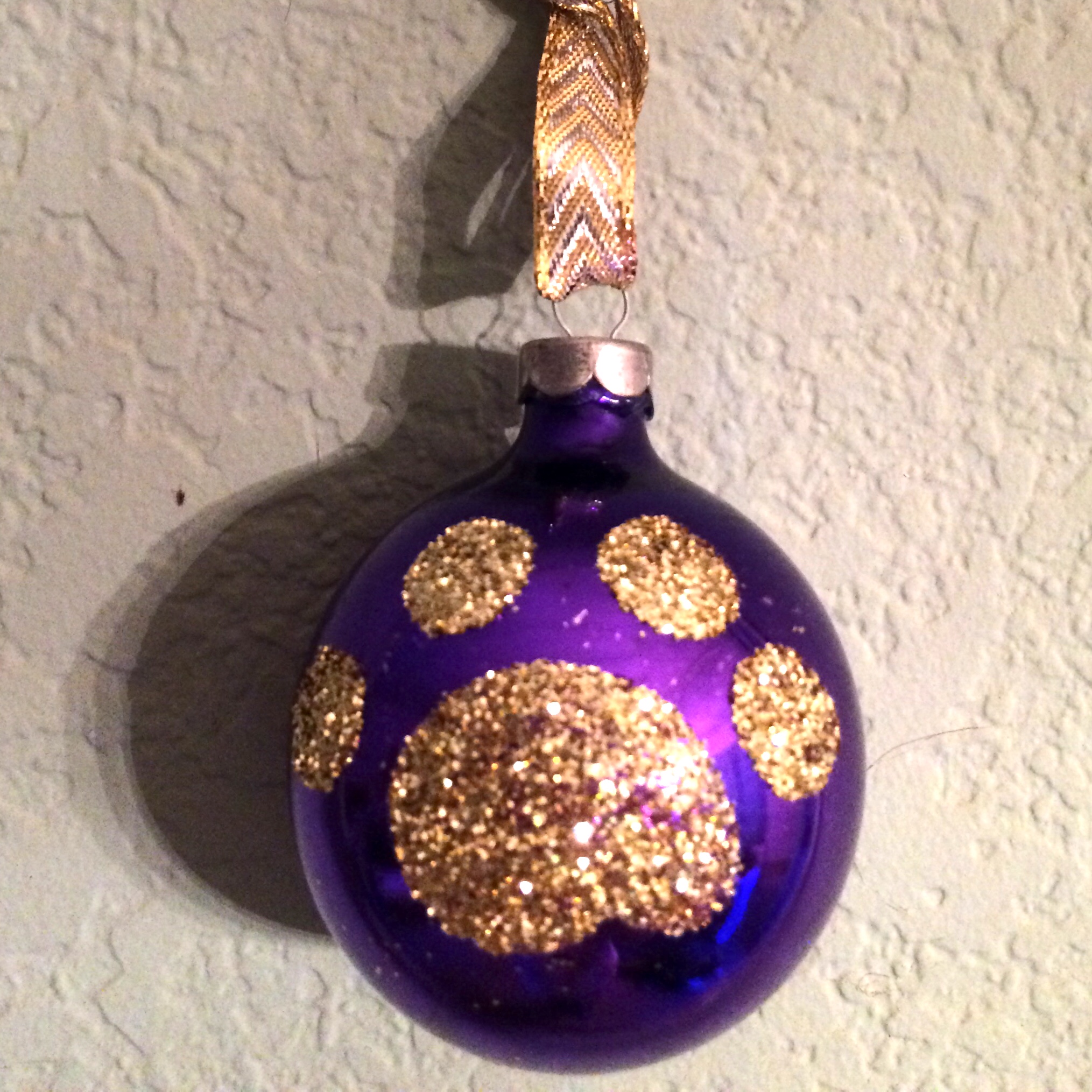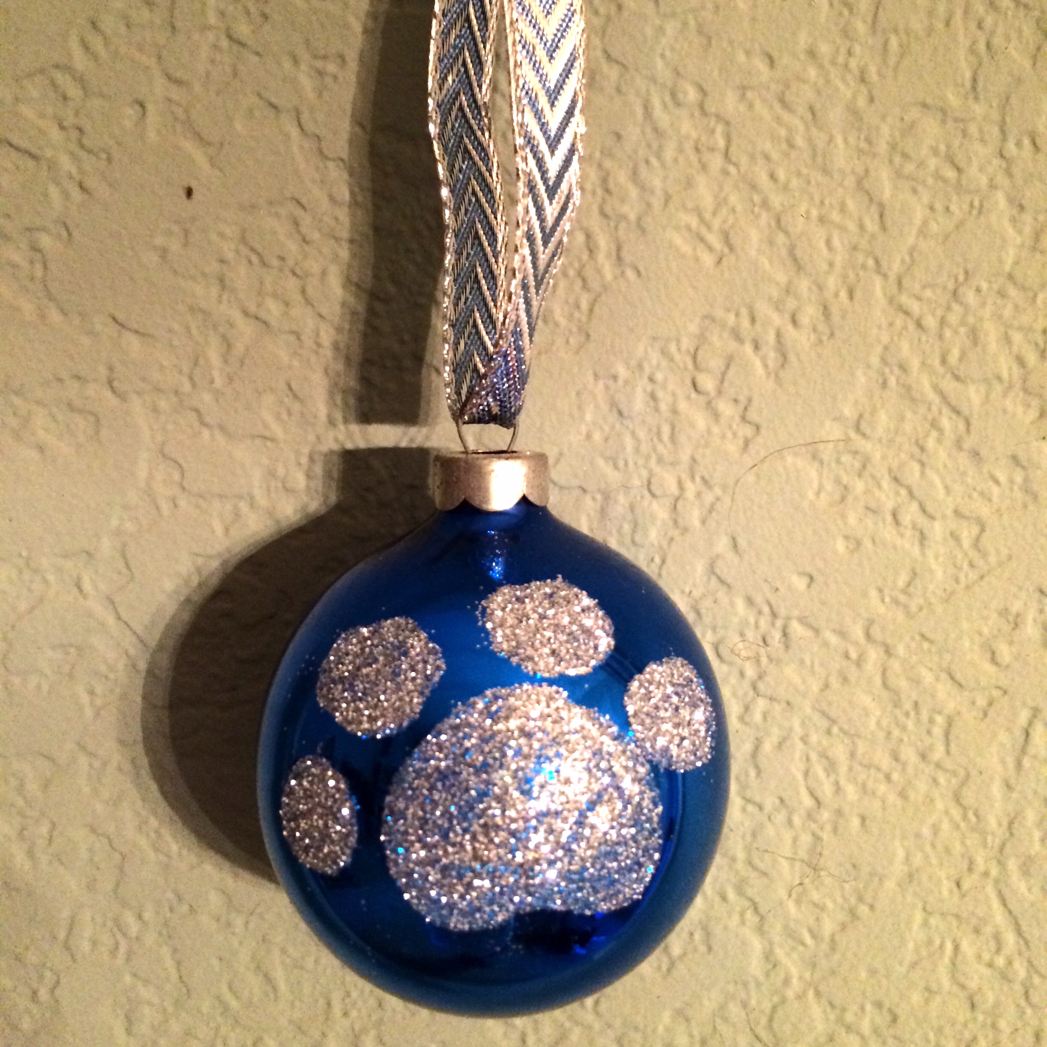 I dipped my q-tip into the glue (any glue will do) and quickly “drew” out a paw and four toes. You need to work quickly for this part because the glue tends to dry quickly. When the “drawing” is done, you dump a good amount of glitter over the ornament (which is over the coffee filter), tap off the excess and voila, a Glitter Paw Ornament. I have great plans for a “Dog Christmas Tree” this year and these are going to be featured in mass quantities.
