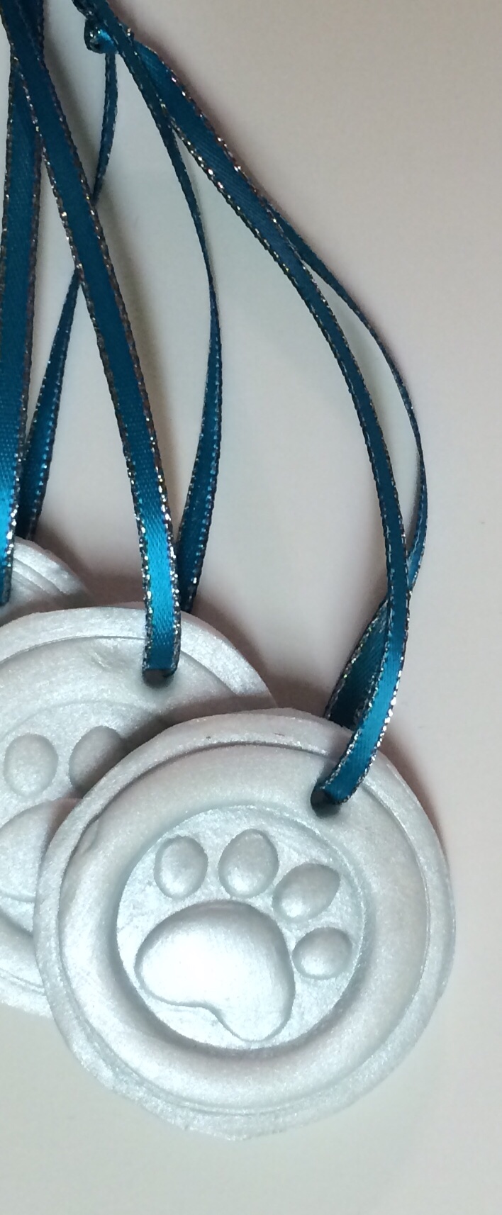I opened the package, followed the instructions and sure enough the clay worked beautifully. It was NOT dry, very easy to work with, rolled out beautifully and sliced very well. I used a soap mold to stamp my puppy paw impression and then cut out a circle around the impression using a paper-crafting circle die. Not the most conventional use of a circle die, but it worked. I poked a hole at the top for the ribbon using my shish kabob skewers and “cooked” them in a 275 degree oven for 20 minutes. After the ornaments cooled off, I painted them using Martha Stewart’s Pearl acrylic paint (Jet Stream). The Jet Stream color is a light wintery blue and the pearl-essence gives them a lovely glittery look.