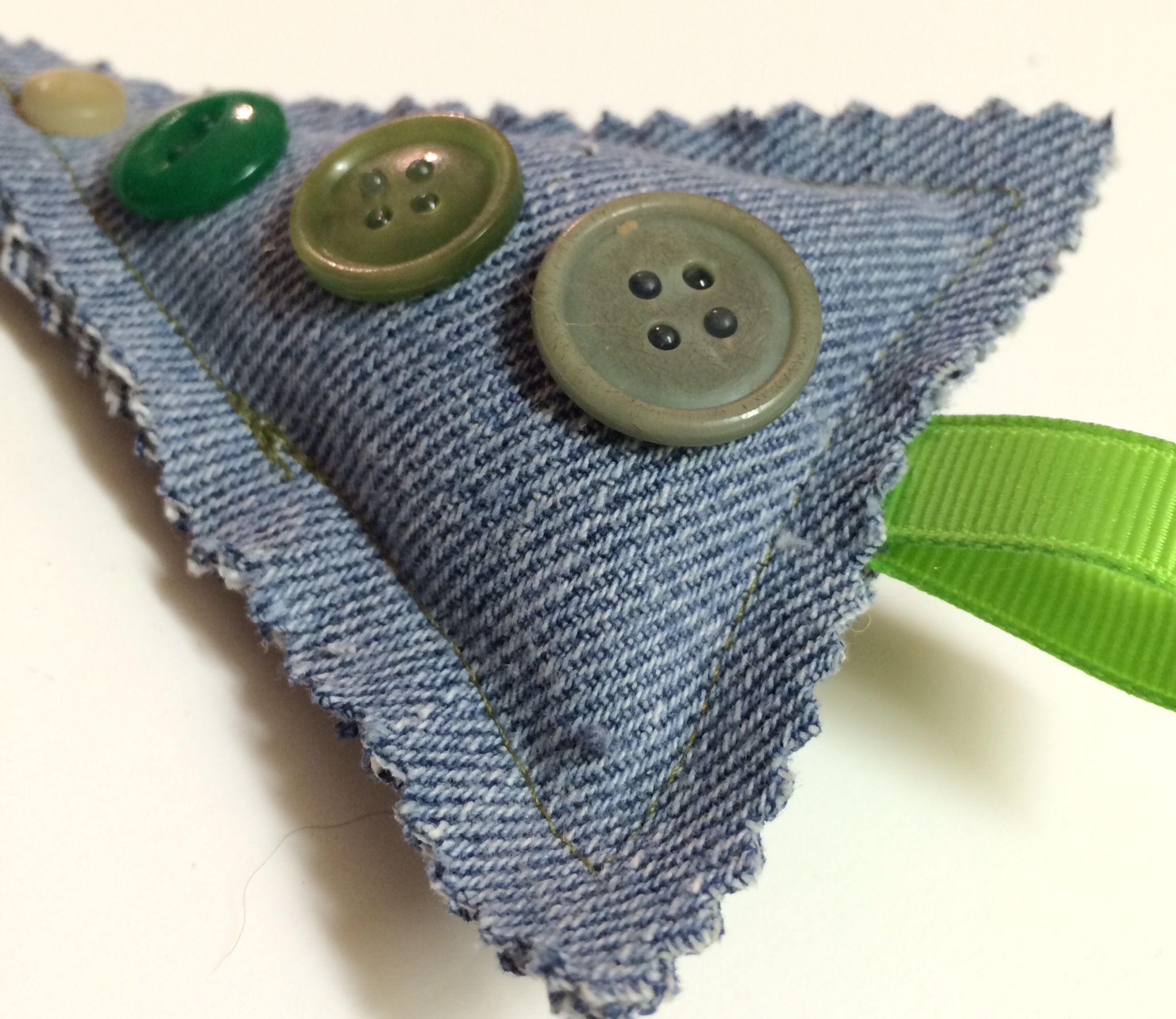 But I digress… I gathered my denim scraps, ribbon scraps and miscellaneous buttons and made a trio of denim trees for today’s ornament. I sandwiched the ribbon between two layers of denim, free-stitched a tree shape and stuffed it with polyester fiberfill. I then hot-glued the buttons down the middle of the trees. I think they’re quite charming.