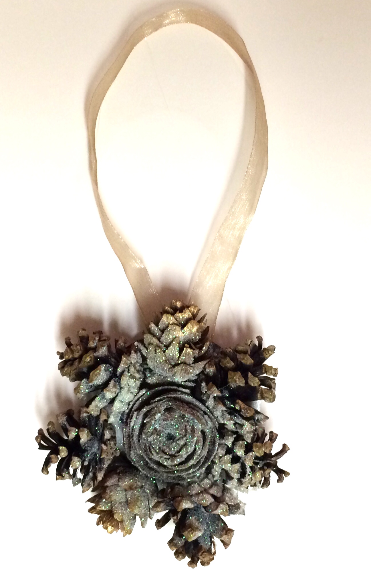 Until now! Today’s two ornaments were made using my pine cones. I kept this really simple, both in materials and technique. I cut scrap cardboard to serve as a base for my design. For the round ornament, I hot-glued the tiny pine cones in a ring around a rose pine cone and then sprayed them with spray adhesive and sprinkled them with glittery dust.