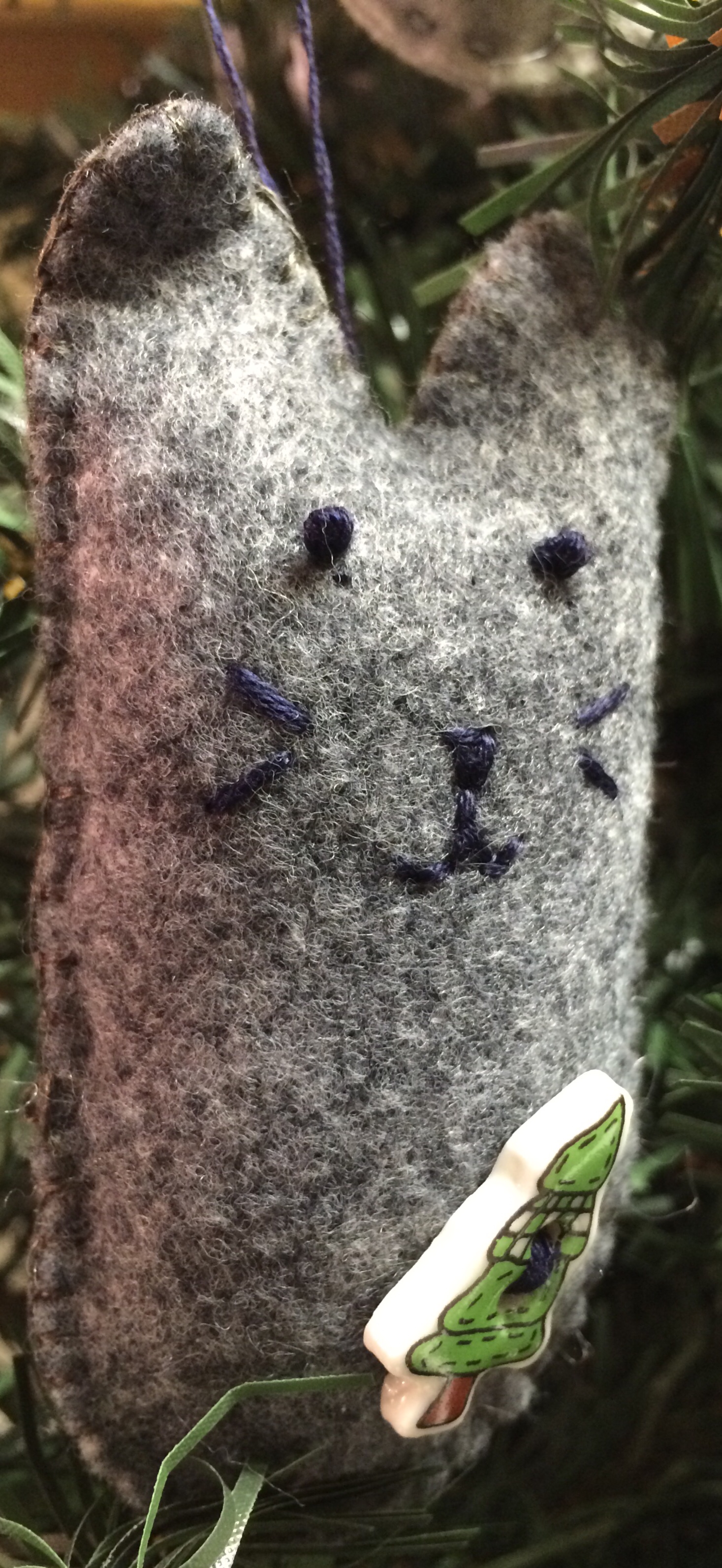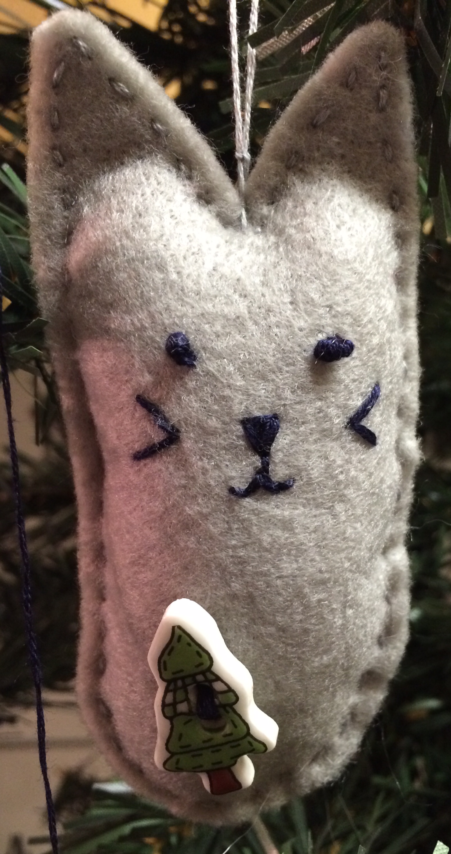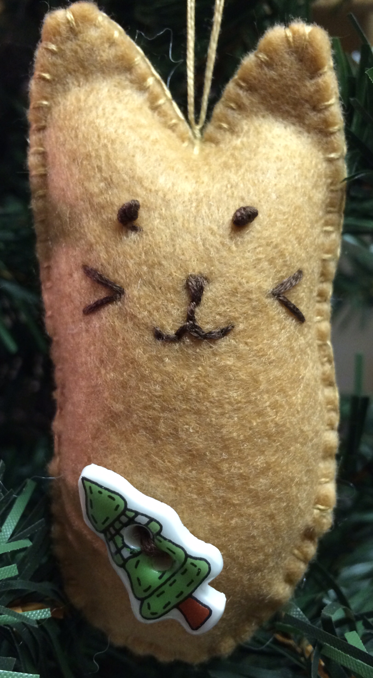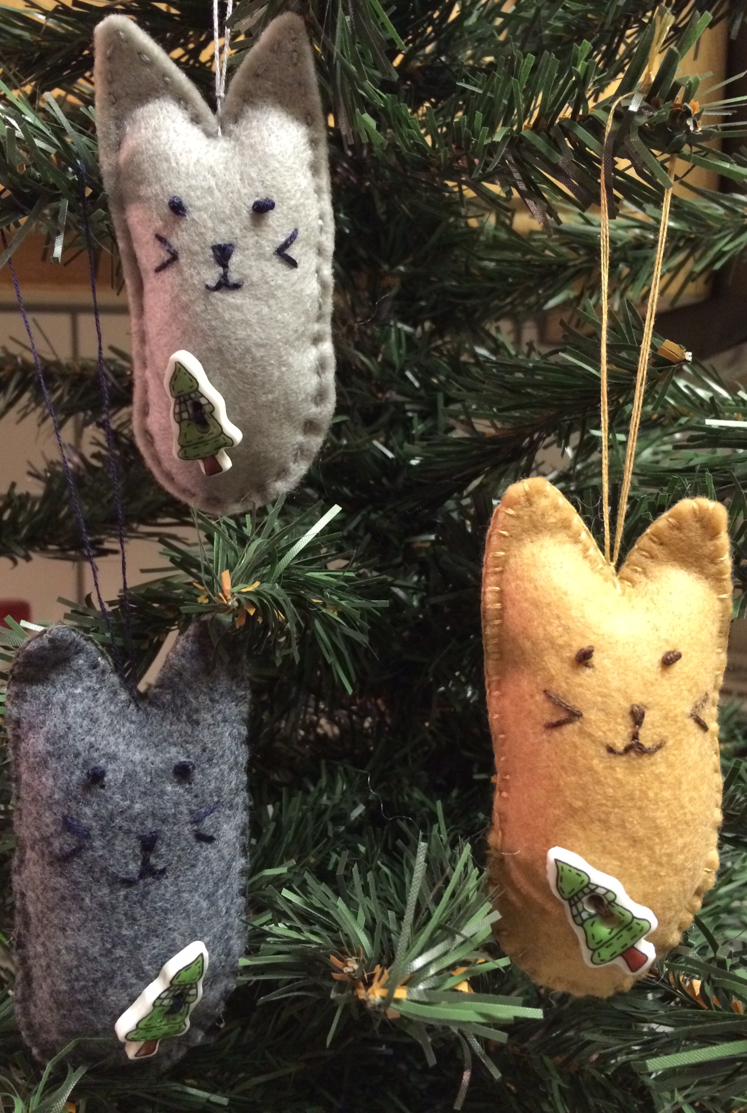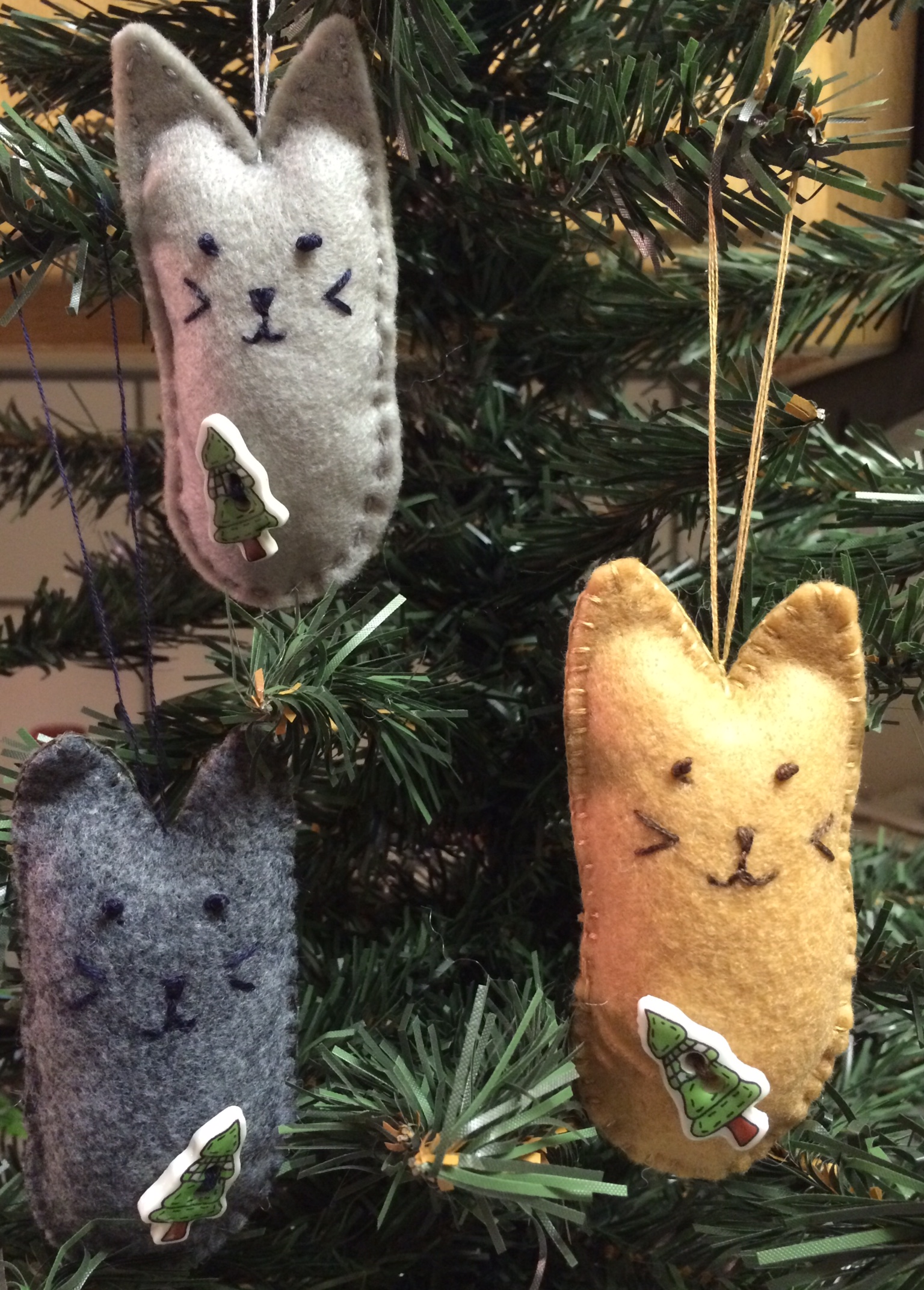016a865a9e4d09aaf92809a021e1e3f577fa7e75eaI used light gray, dark gray and light tan felt and embroidery floss with a little bit of polyester fiberfill for stuffing.  I found these Christmas tree buttons that I’ve had for decades and I thought they looked good on these guys.  I used a running stitch on the light gray guy and a blanket stitch on the dark gray and the light tan kitties.