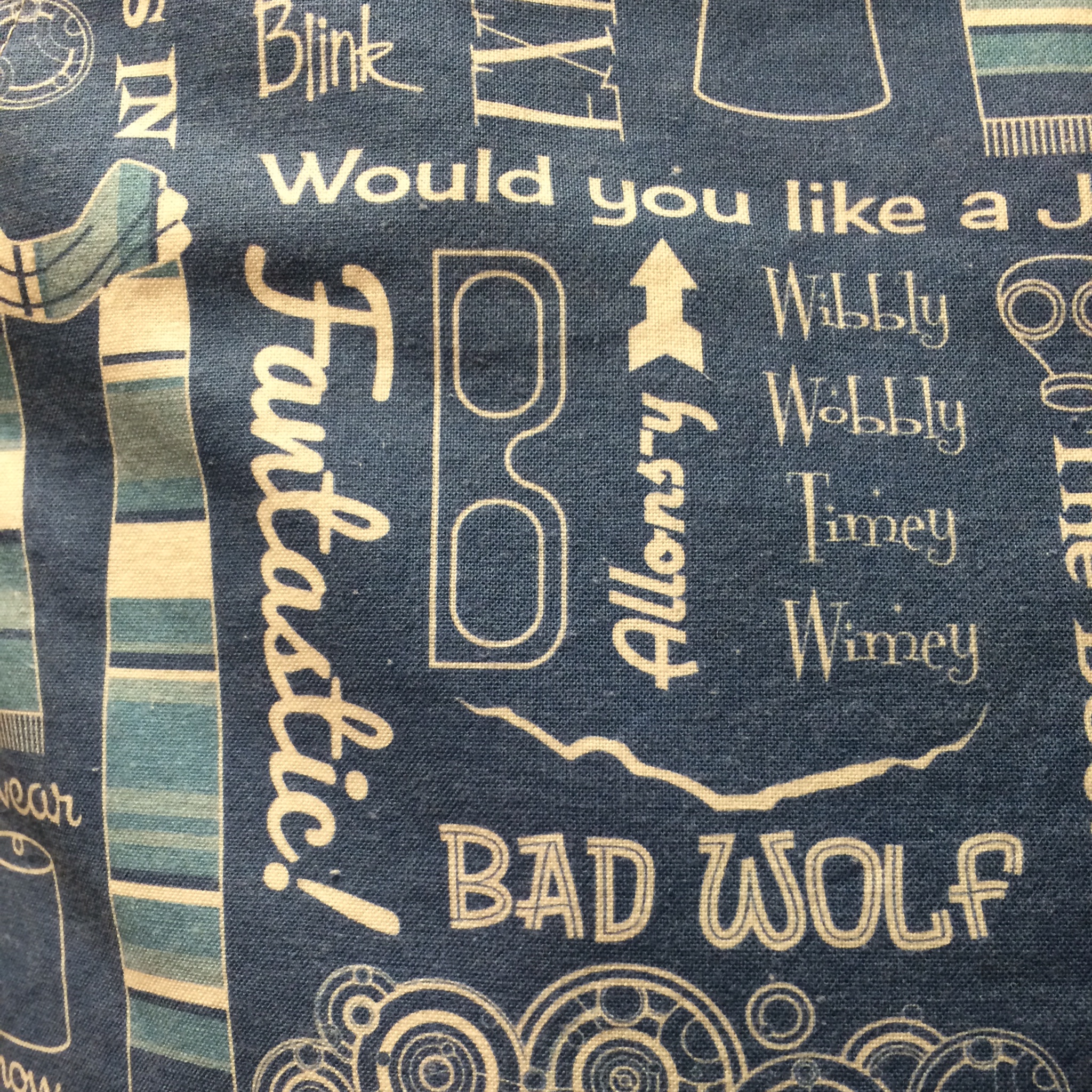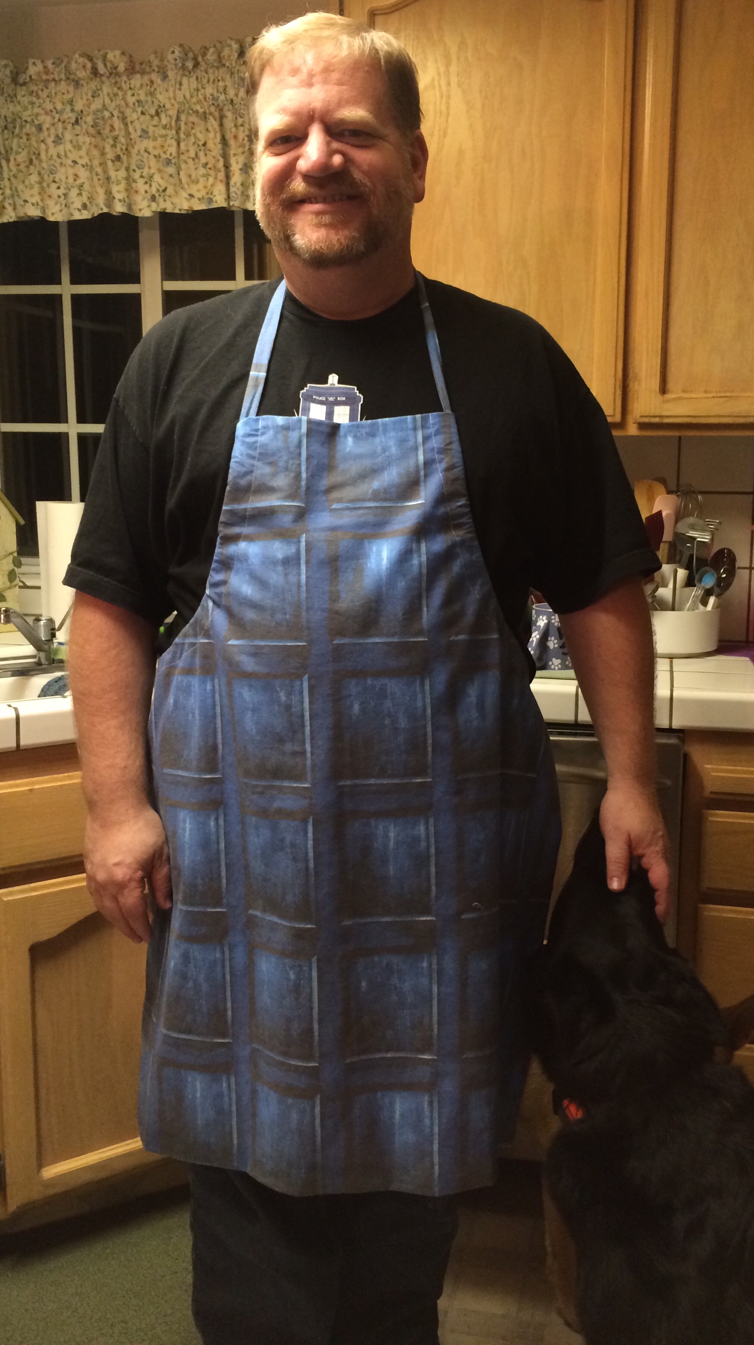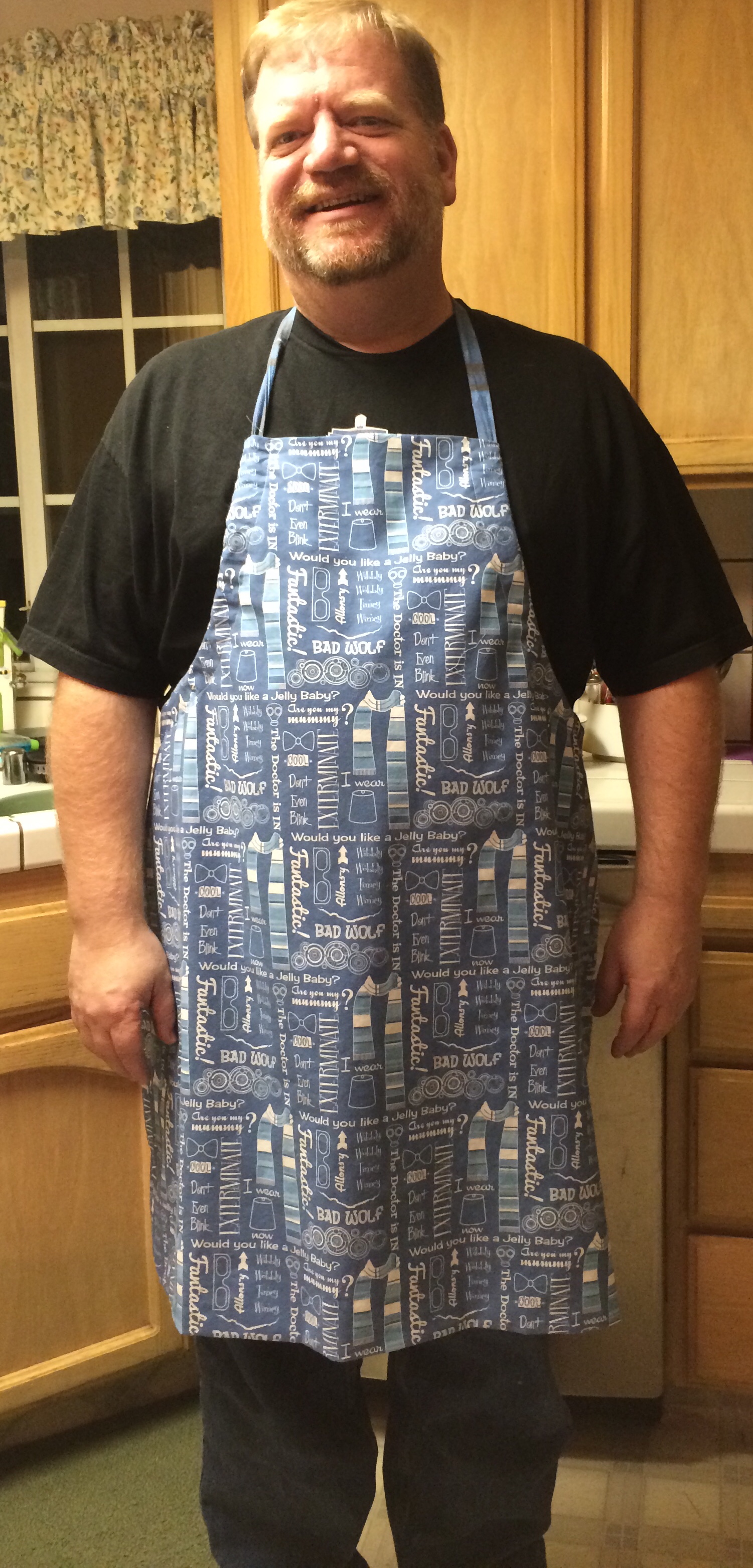 01a8fdce570ed23d746a2392914ef5f65e4da1f24c01fdb96598878ee0a54b4c443f5ba61d642ce00a80The second project I made today was an apron for Mike.  Mike is a wonderful cook and when he cooks or bbq’s he always wears an apron.  He also cooks for kids on Thursday nights at a teen center where he works and we thought he needed a unique apron.  We found Dr. Who fabric at Spoonflower.com – an awesome website where you can design your own fabric or use designs that other people have made.  We chose two different designs because I wanted the apron to be reversible and have adjustable straps.  I used his current apron for a pattern and am really pleased with how it turned out.   He is too ;-).