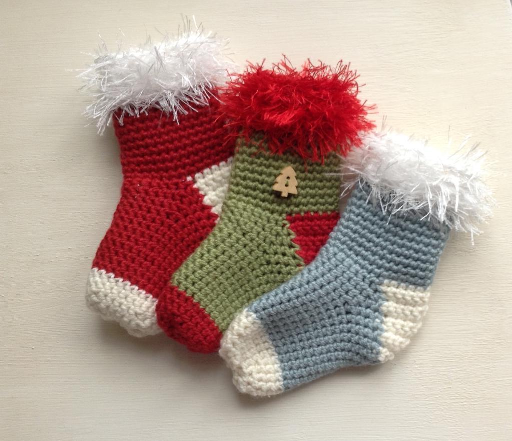 was able to make the body of the stocking using only one skein. The contrasting color for the heel and the toe used maybe 1/4 of a skein. The fuzzy top part was made with Lion Brand Fun Fur. I definitely plan to make more; they would make a great garland or stuffed with candies or tiny goodies.