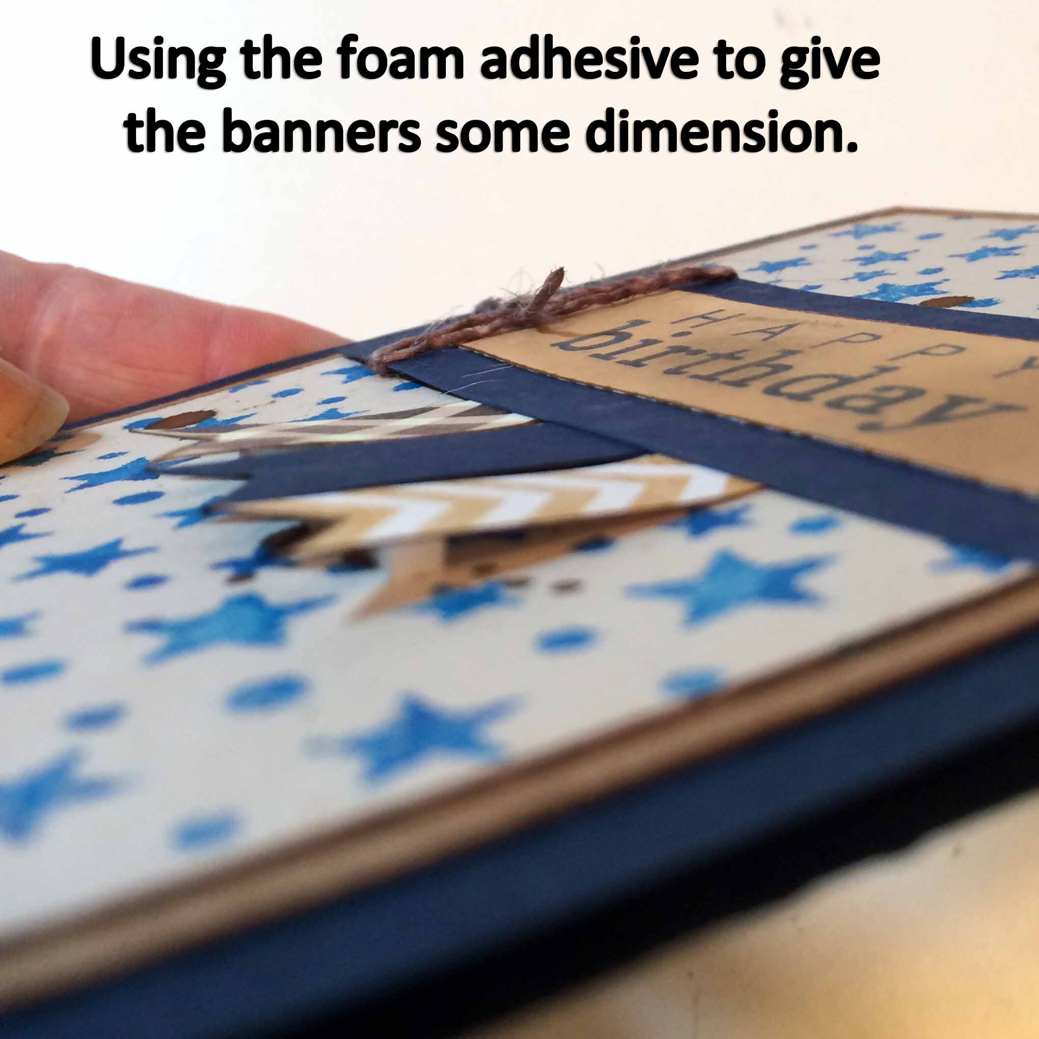 To add a little bit of dimension, I cut three pieces of patterned paper (1/2″ X 1 1/2″) and used my scissors to cut the banner shape. I also inked the edges of each banner. I used adhesive to attach these to the back of the main sentiment banner. Then I used foam adhesive to prop each banner up a bit.