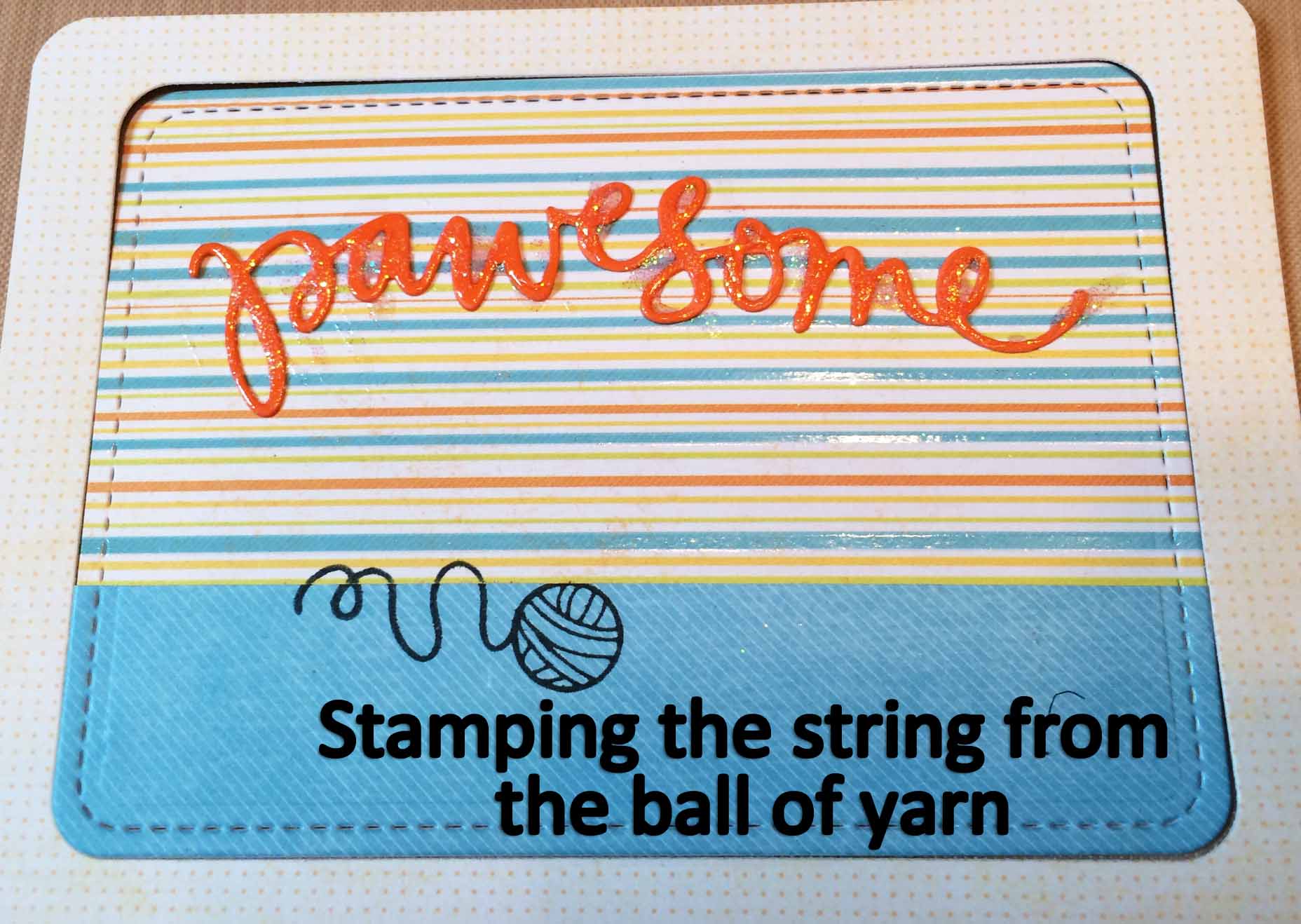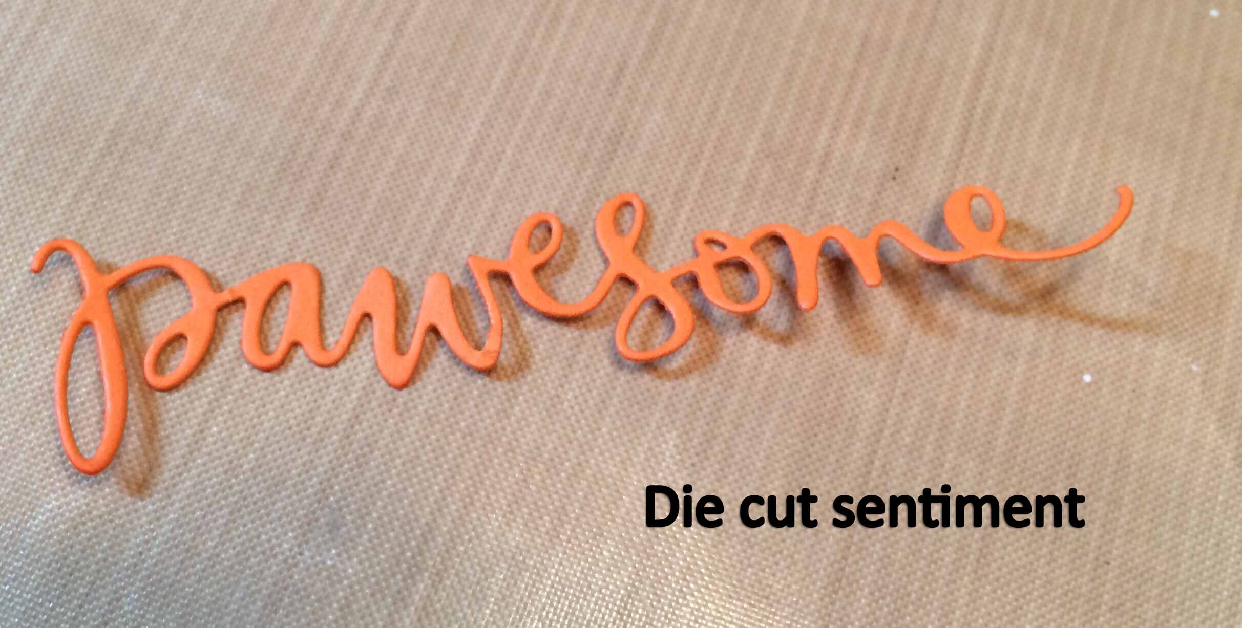 I started by die cutting the patterned cardstock using a rectangular stitched die. I also die cut the sentiment “Pawesome” out of orange cardstock. I wanted to add some dimension and glamor to the sentiment so I went over the letters with Glossy Accents, a clear, dimensional adhesive and glitter.