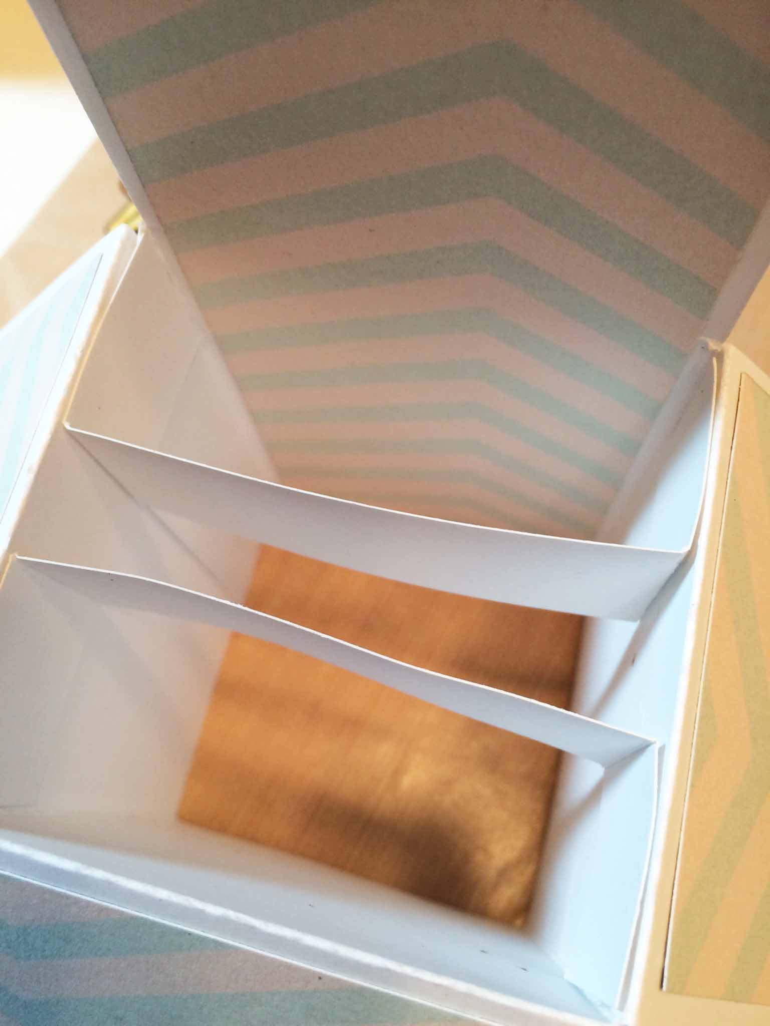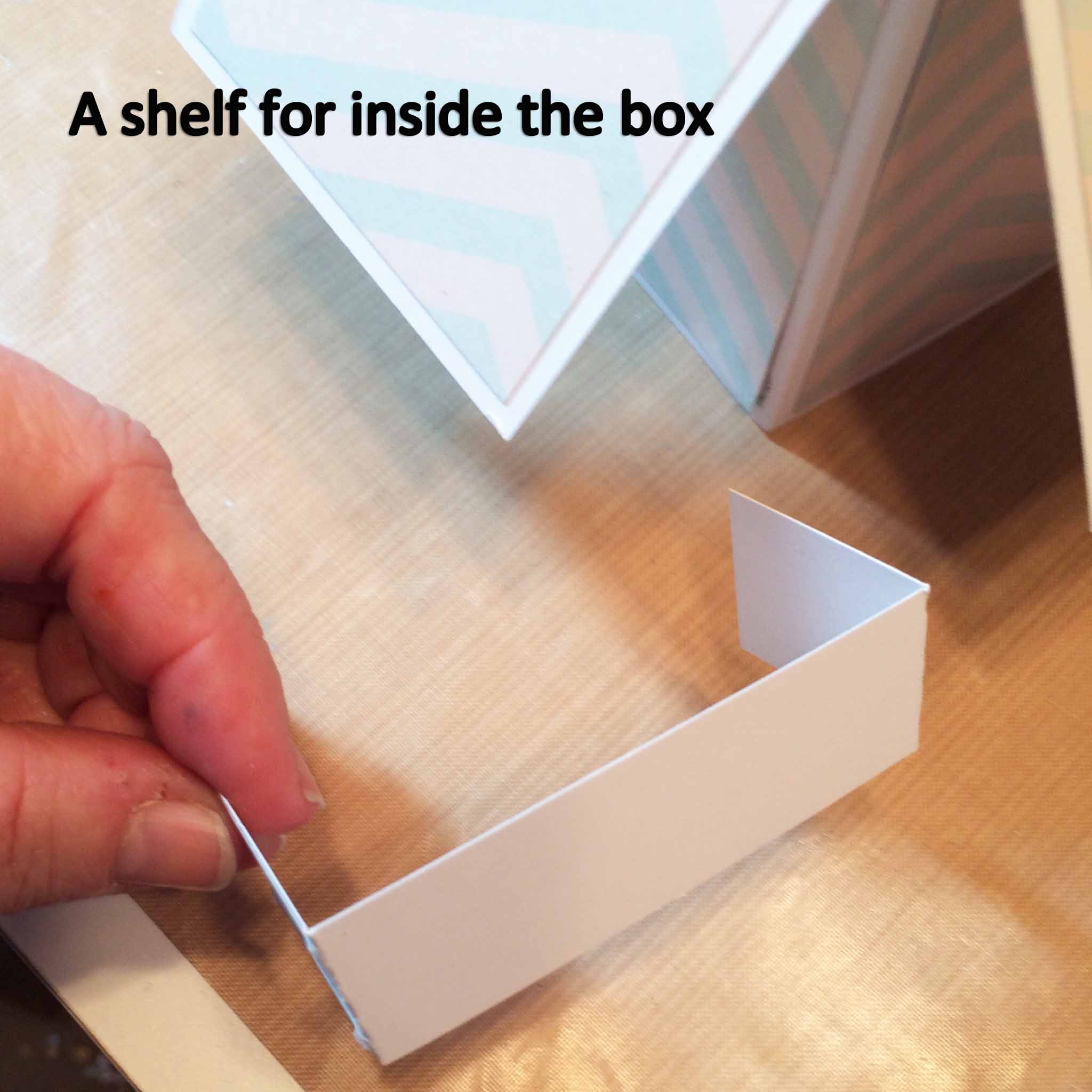 After the box is assembledOnce the back of the box was complete, I folded the paper into the ‘box’ shape and using double sided tape, glued the boxed together.A shelf for inside the box