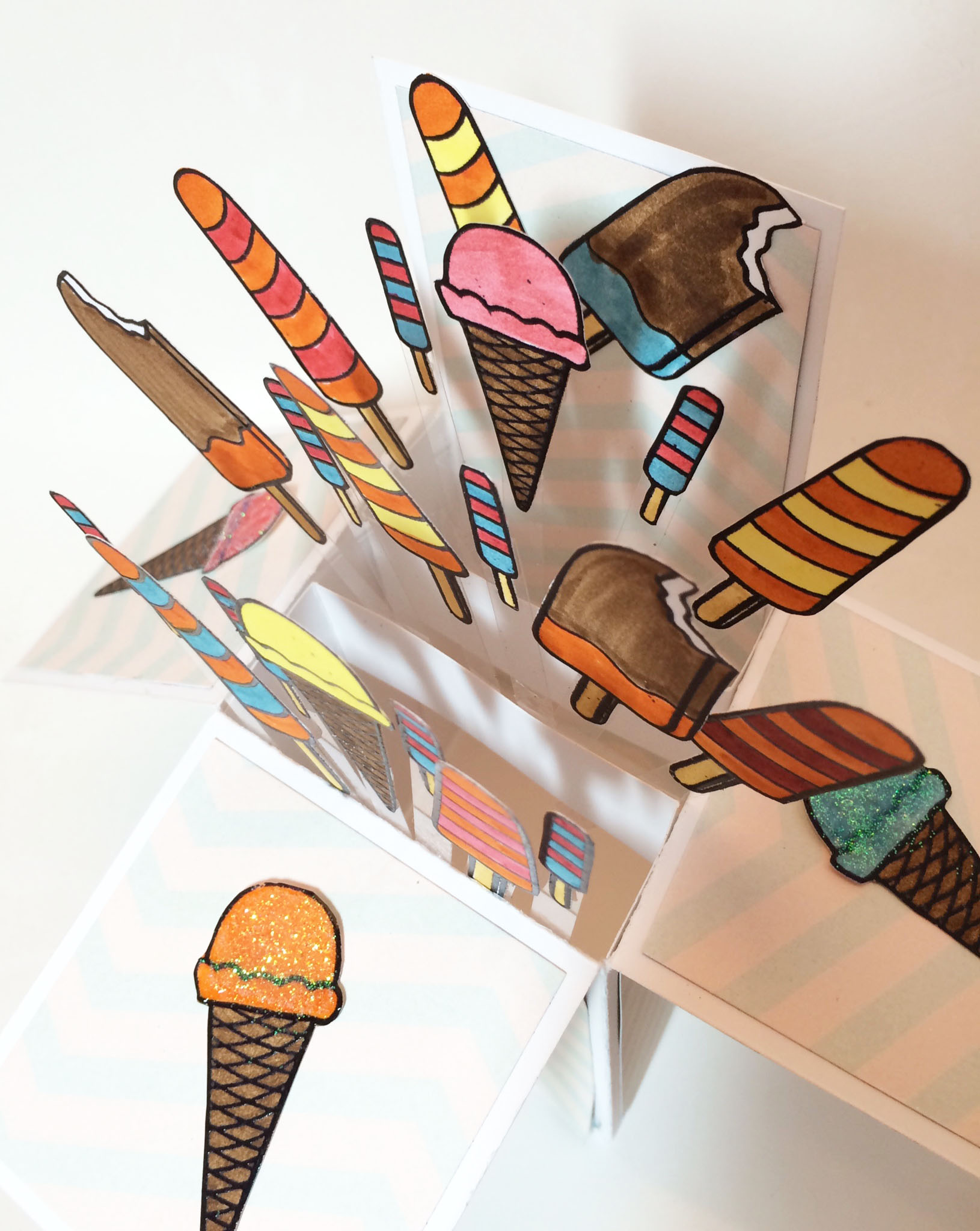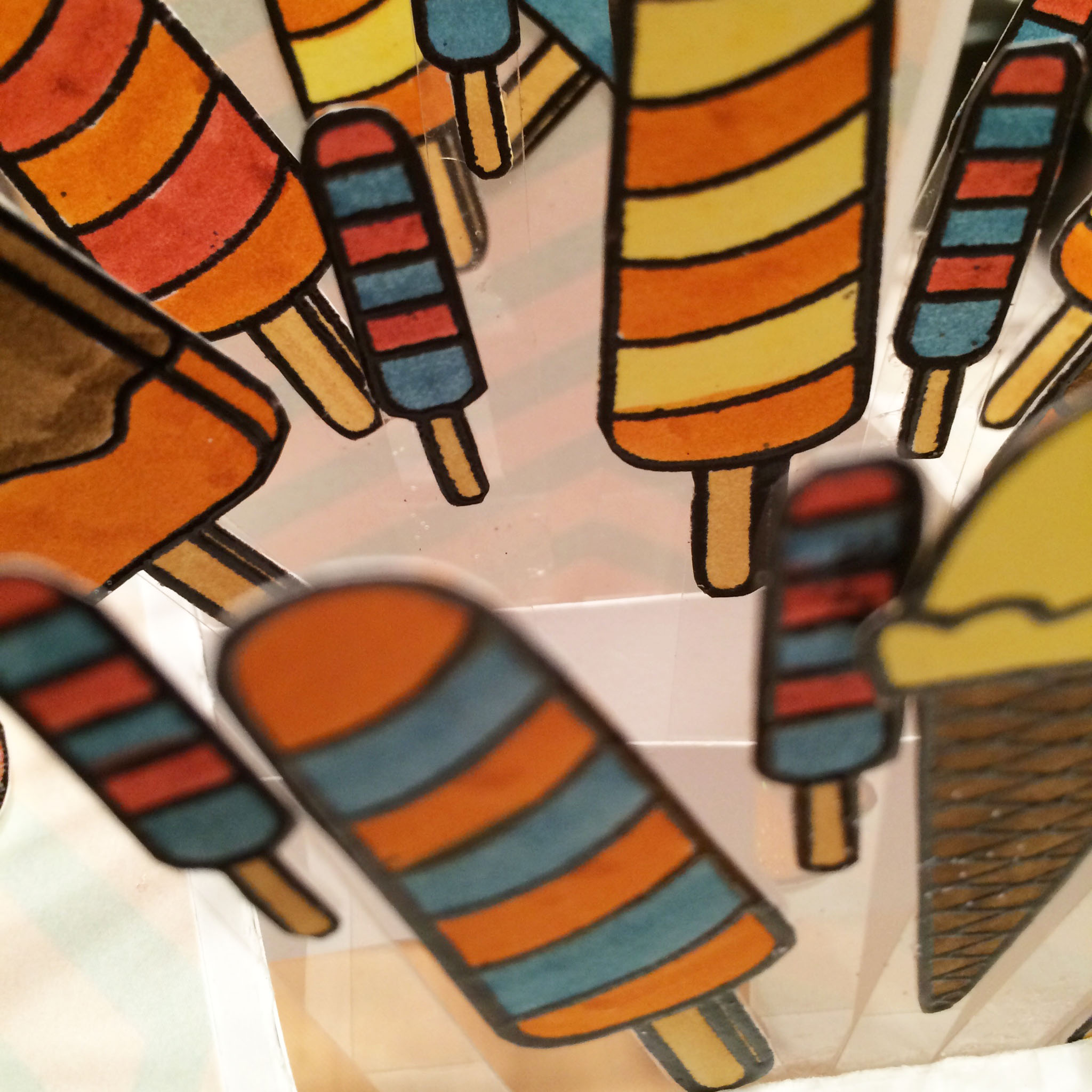 Using clear acetate stripes, I glued ice-cream cones along the front inside, 2nd and 3rd shelves of the card.  I also glued a couple cones to the back panel of the card.  For the three flaps in front of the card, I glued three ice-cream cones that I embellished with Glossy Accents.