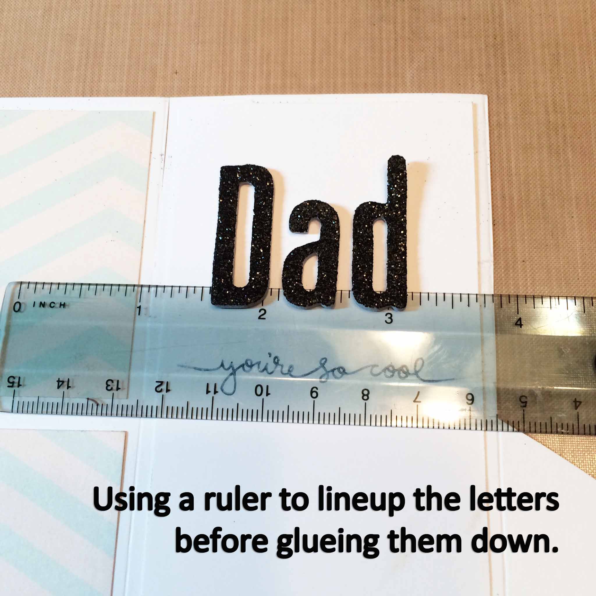 Using a ruler to line up the letters before gluing them downHere’s a little tip for attaching adhesive letters.  Use a small plastic ruler to line up the letters before you glue them to your paper.  When you’re pleased with how they’re lined up, just press the letters onto the cardstock and then remove the ruler.  They stay perfectly in place.