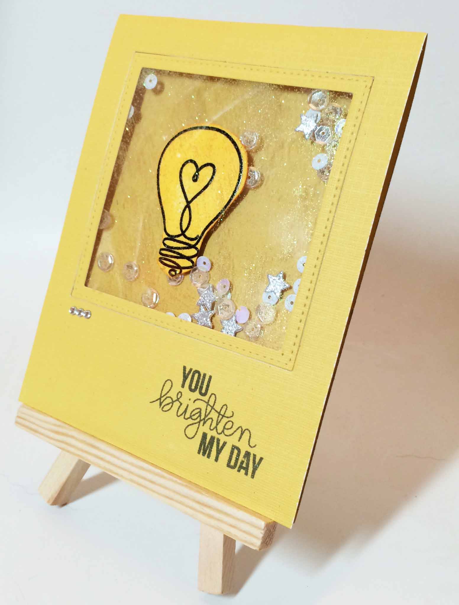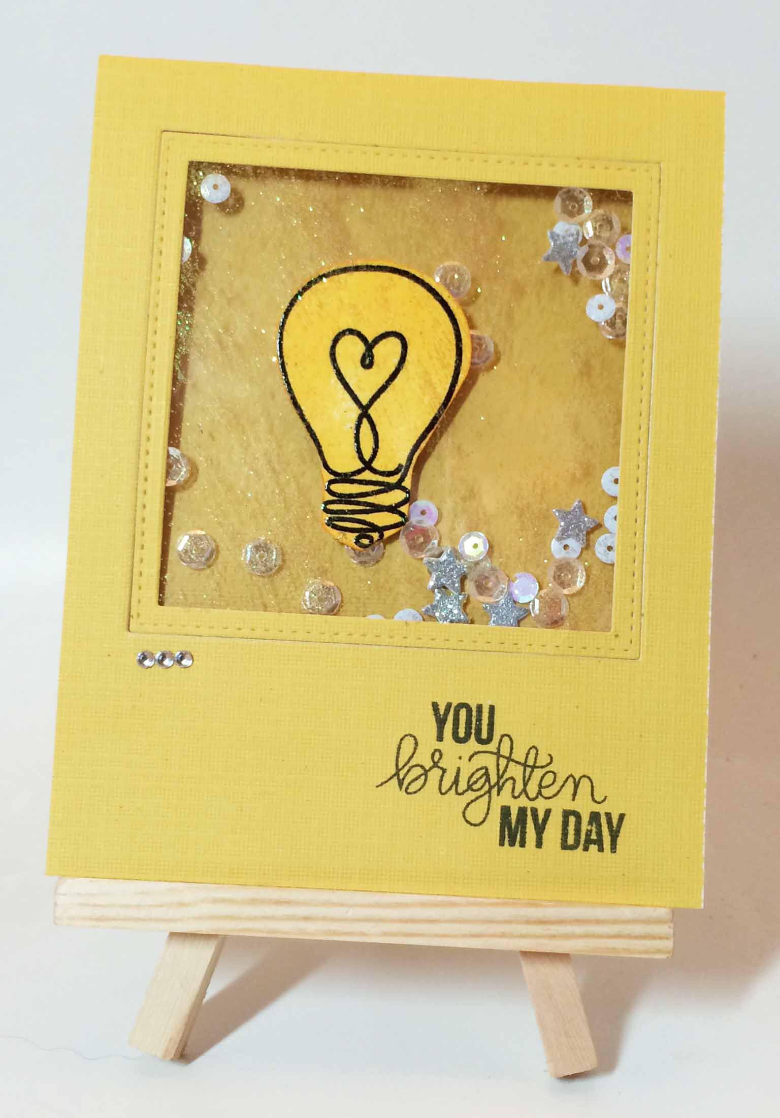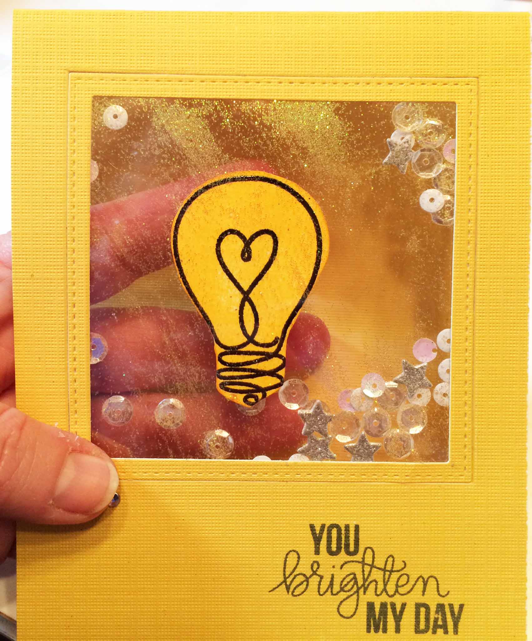 I adhered one of the clear acetate pieces to the back of the front panel over the square made by the die cut. I placed the light bulb and sprinkled glitter and sequins. I then glued down the remaining acetate square on top of the bulb and sequins. I glued down the white cover panel to cover the glue used to secure the acetate.