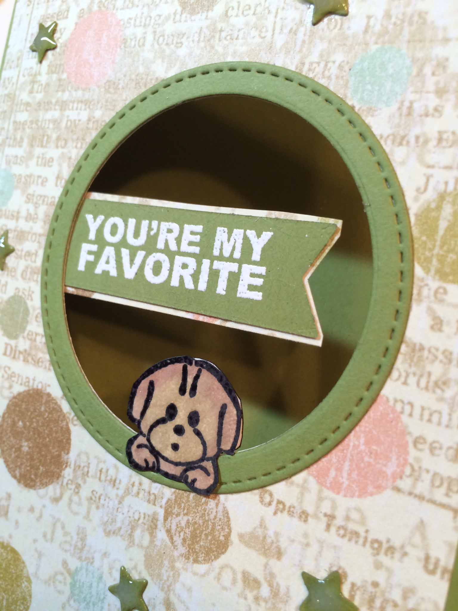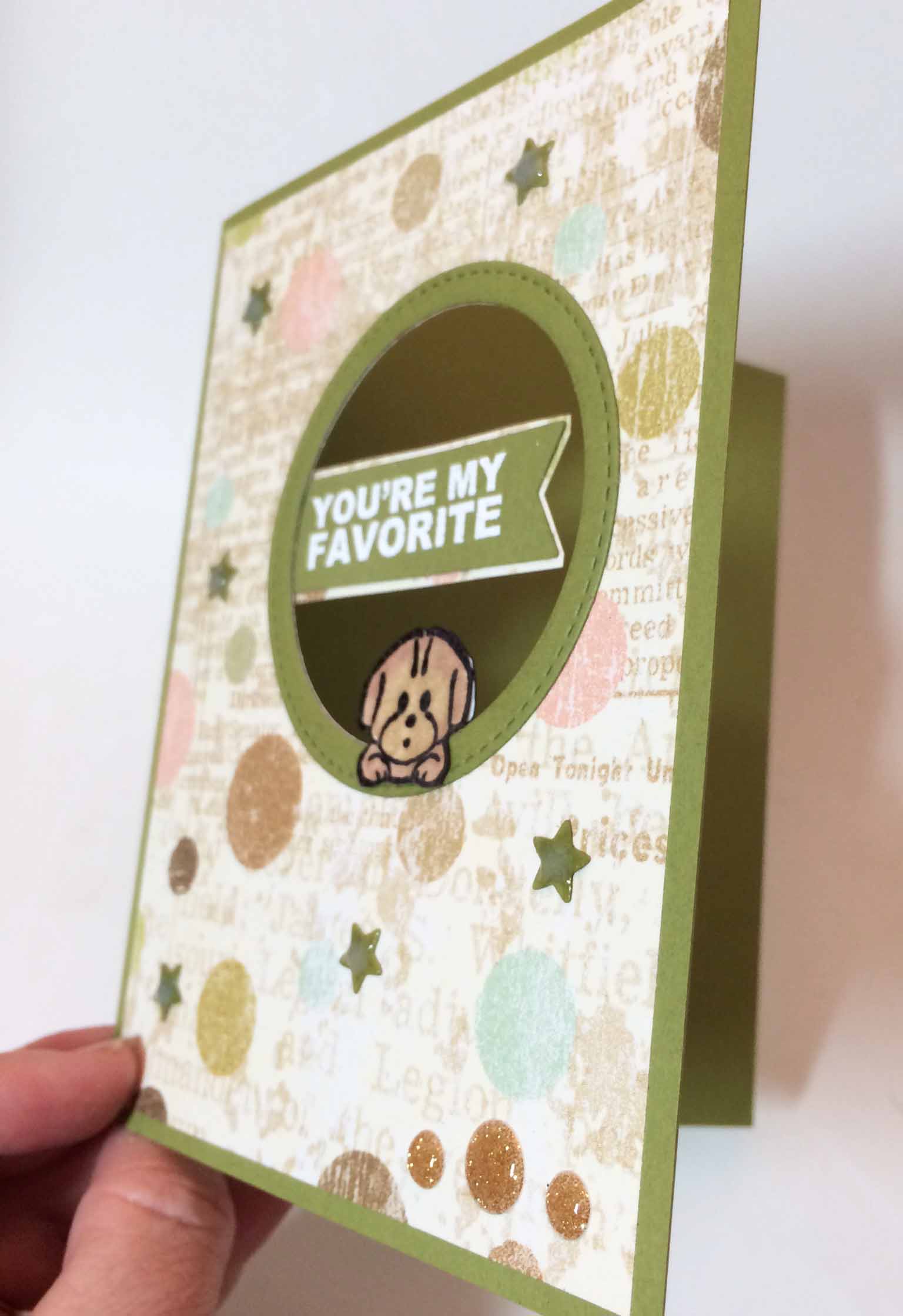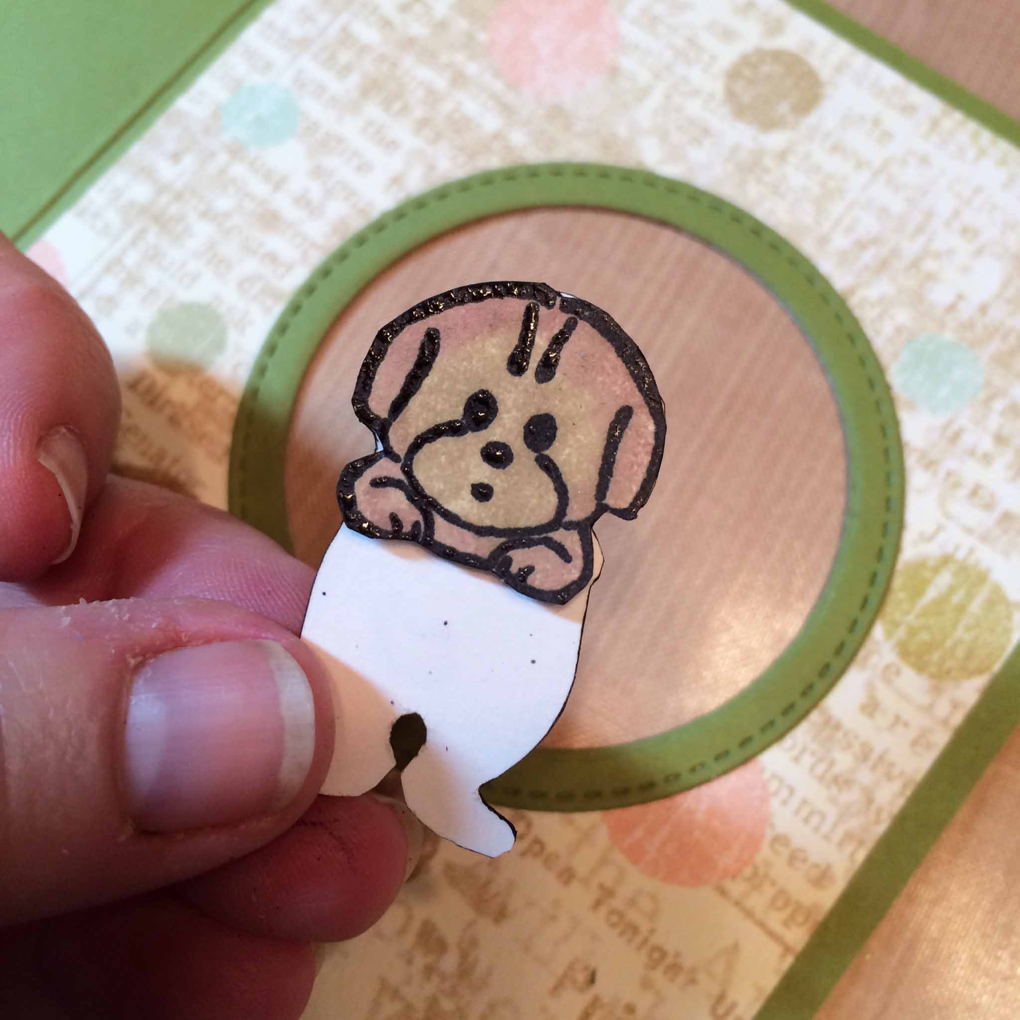 I used my tape runner to glue the patterned paper to the front of the avocado cardstock and then adhered the puppy image just over the lip of the lower circle. This gives the illusion that the puppy is leaning on the circle.