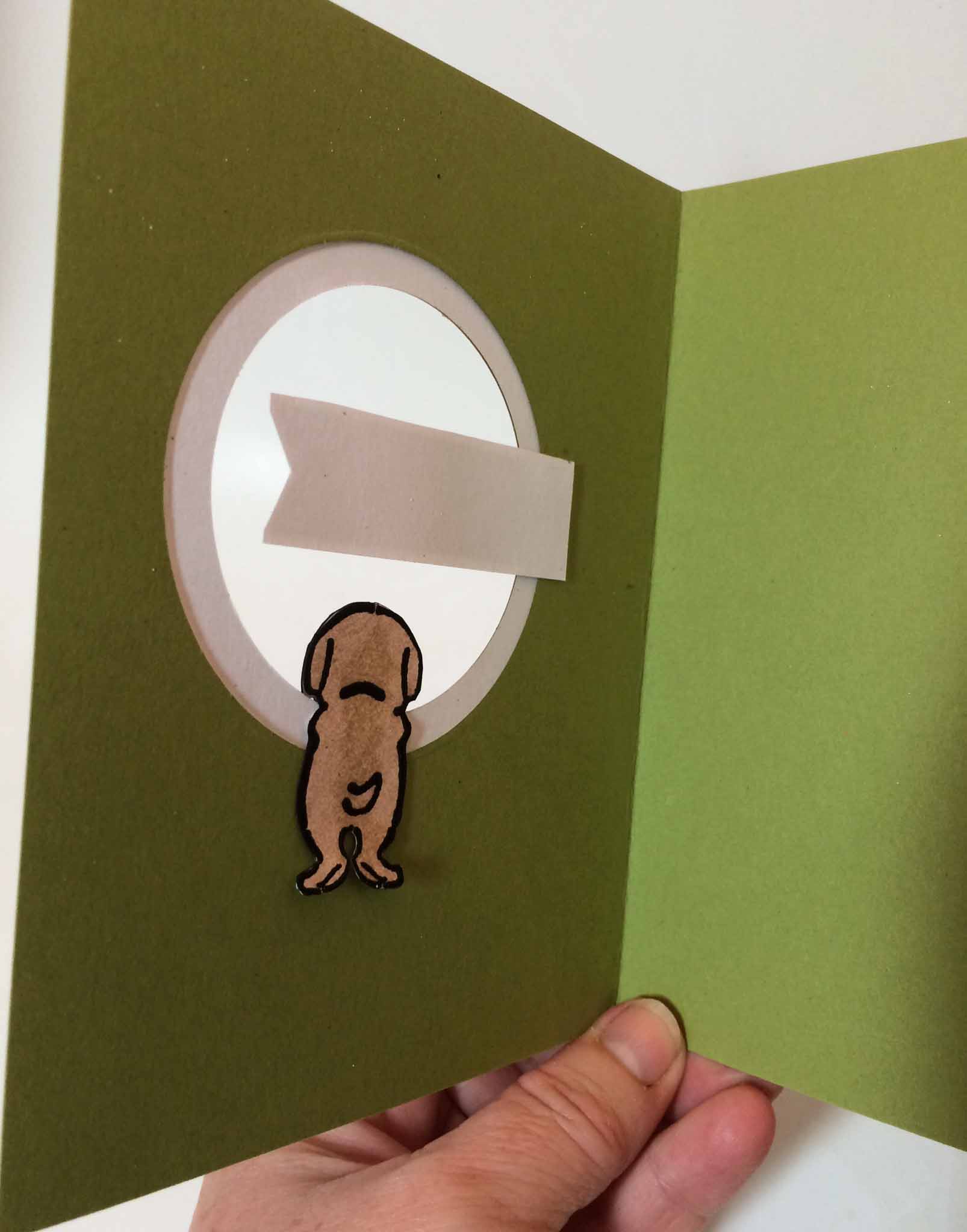 I’ve had this stamp set for a while and today I decided to take it out for a drive. You stamp the front and back of a puppy or a kitten and attach them so it looks as if they’re peeking through a window. When you open the card there’s a surprise inside.