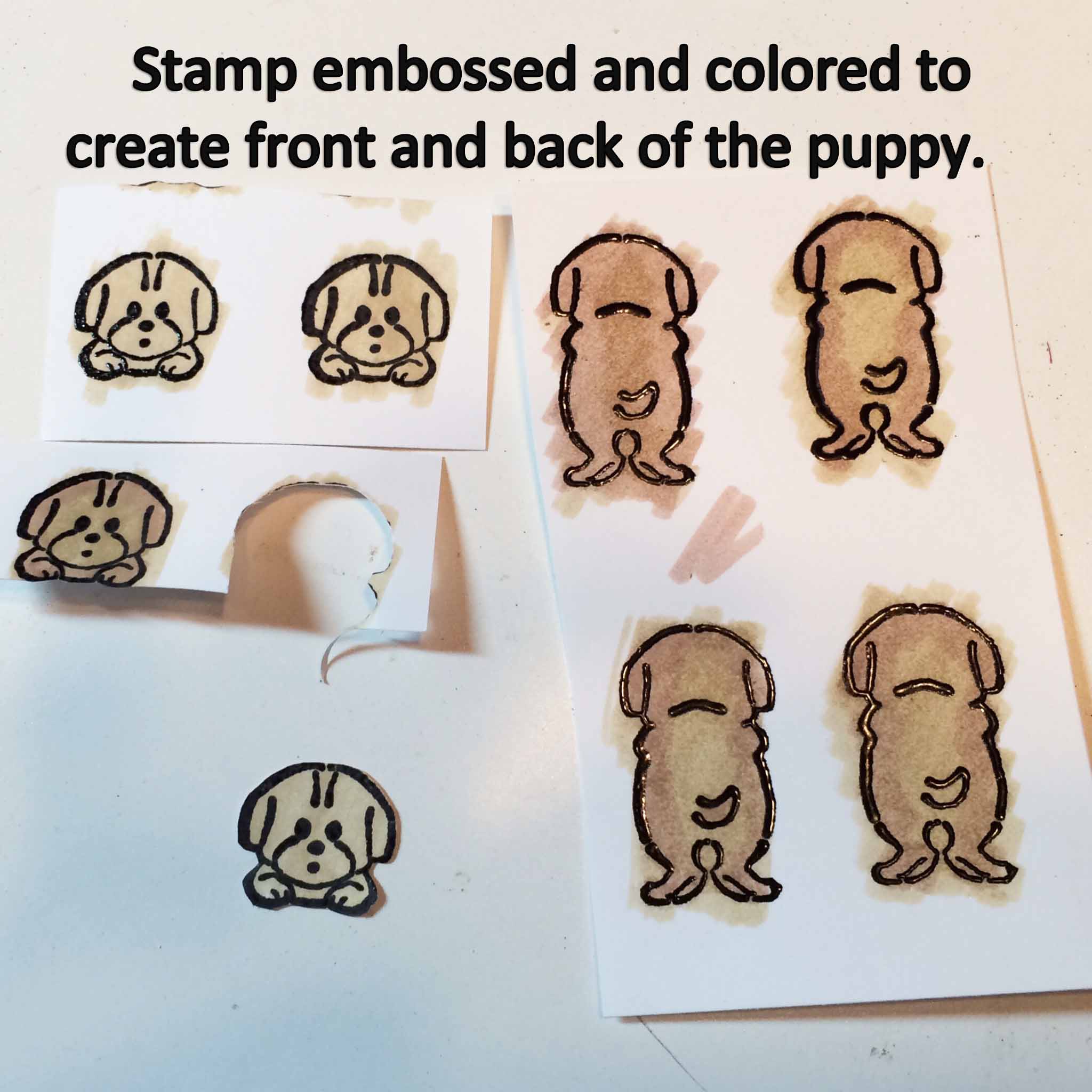 I stamped, embossed and colored the front and back of the puppy. After cutting them out, I glued them, wrong sides facing, together.