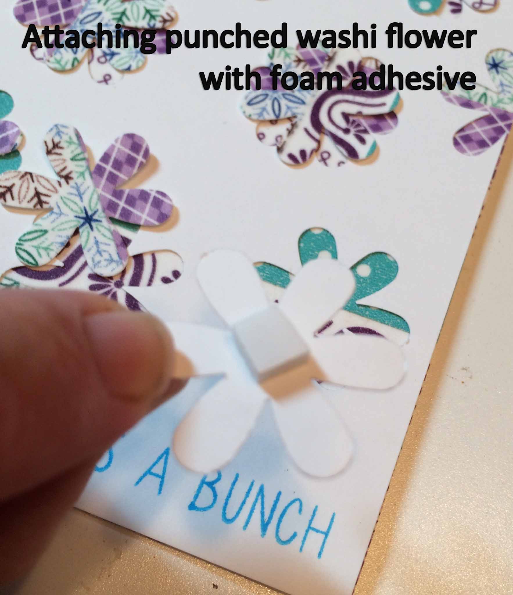 Punching flower shape out of washi tape paperAttaching punched flower with foam adhesiveBefore I stamped the sentiment, I punched several flowers from the remaining washi tape cardstock and attached foam squares.  Positioning them at an angle to each flower cutout on the white cardstock, I pulled the release paper on the foam square and glued them.