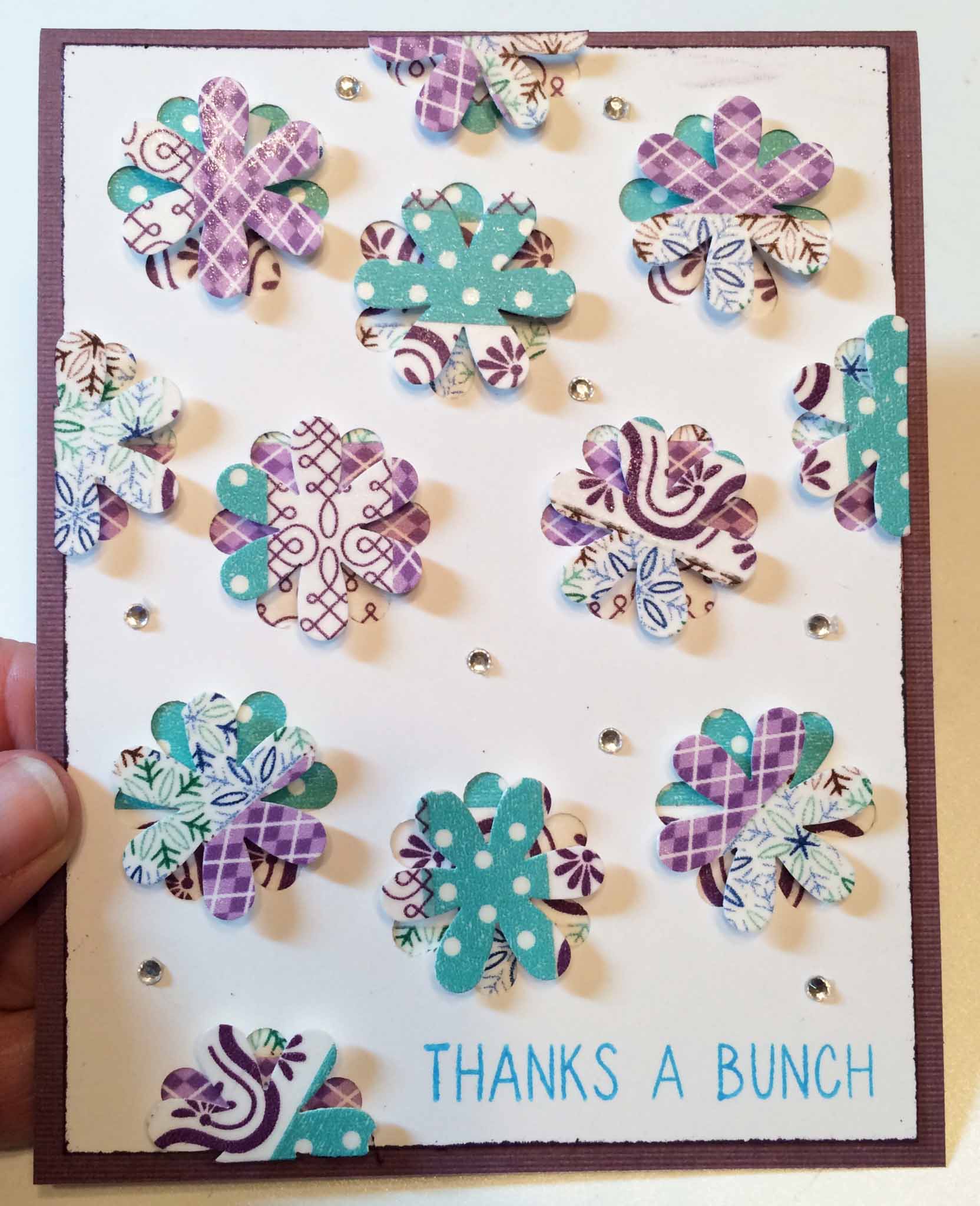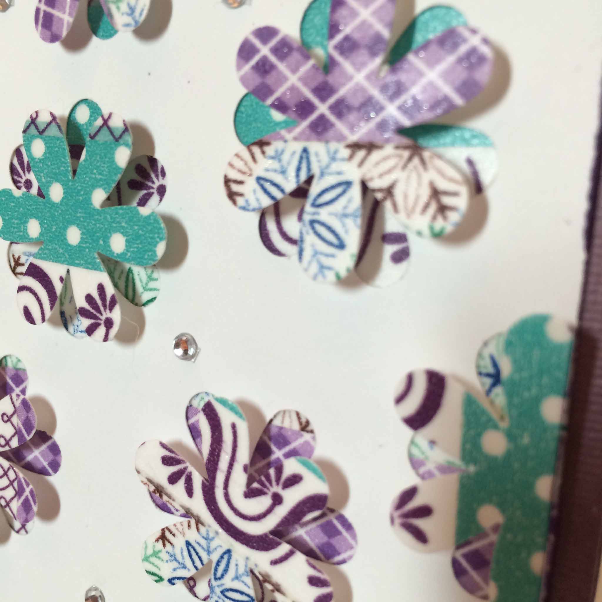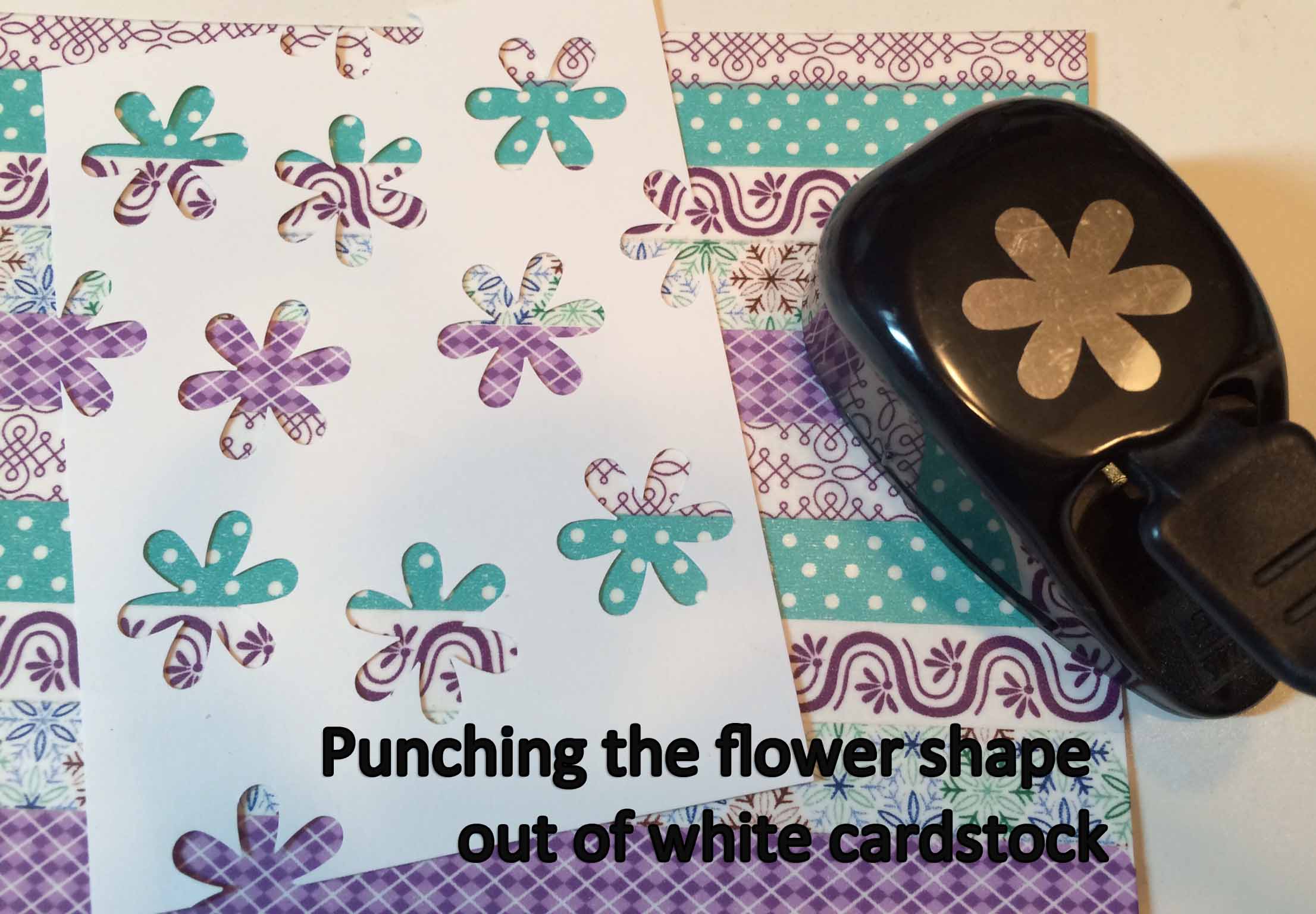 Punching flower shape out of cardstockI took the white cardstock front panel and punched flower shapes in a fairly haphazard fashion.  I then glued this panel to the washi tape cardstock and trimmed the excess.