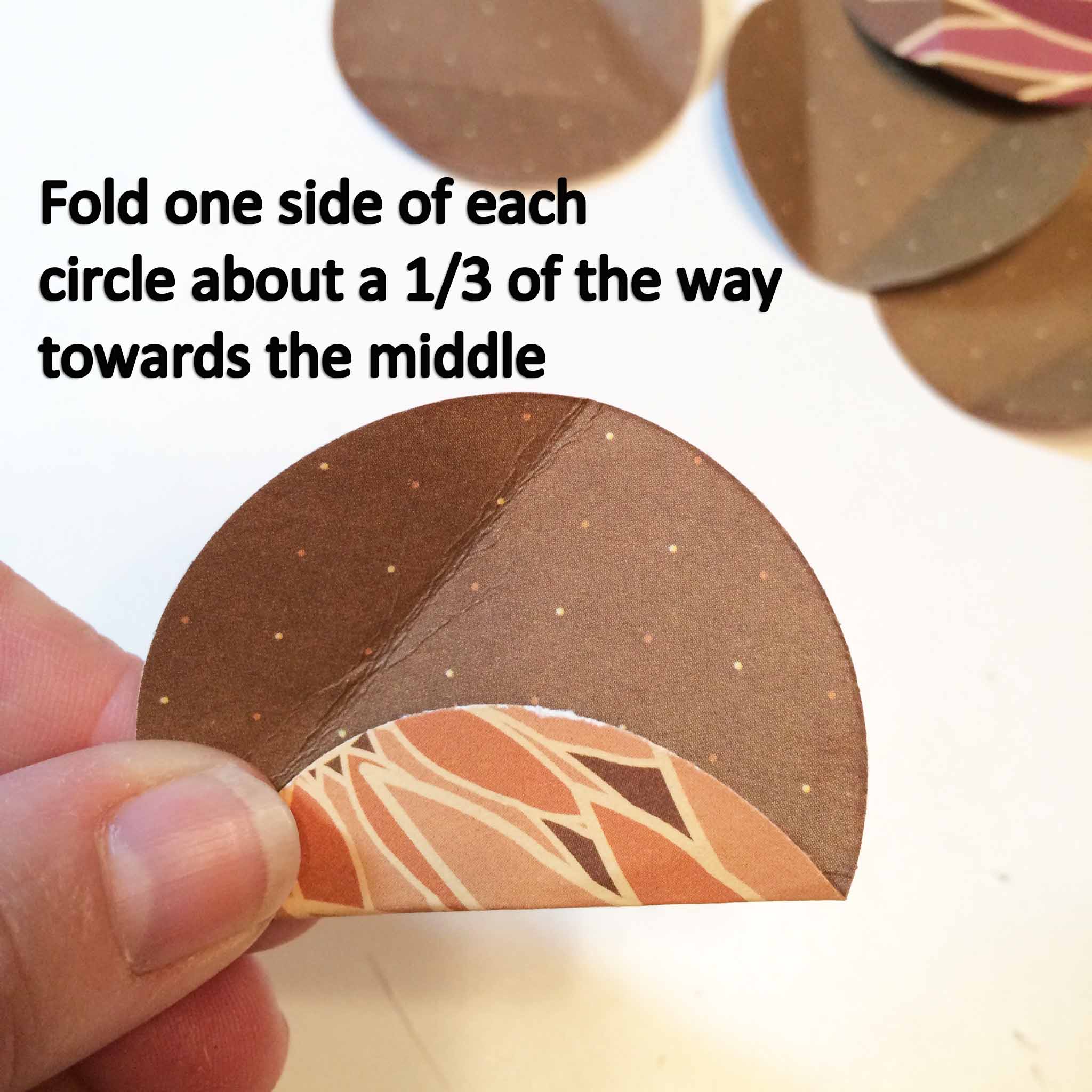 I started by punching 8 circles from the patterned paper. I inked around the edges of each circle to add some dimension and interest. Then the folding began. With each circle I folded one edge about one third of the way to the middle. After that I folded the opposite side of the circle to meet the edge to make a cone shape. Repeat this step 7 times. I used my adhesive to seal the cone shapes closed.