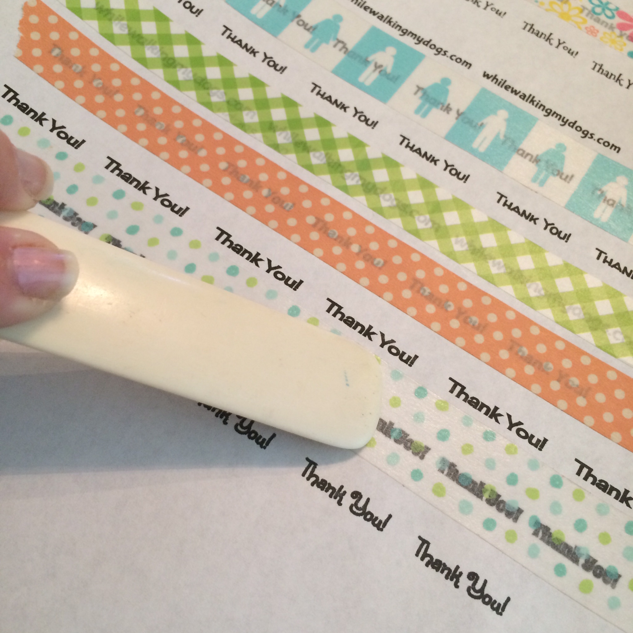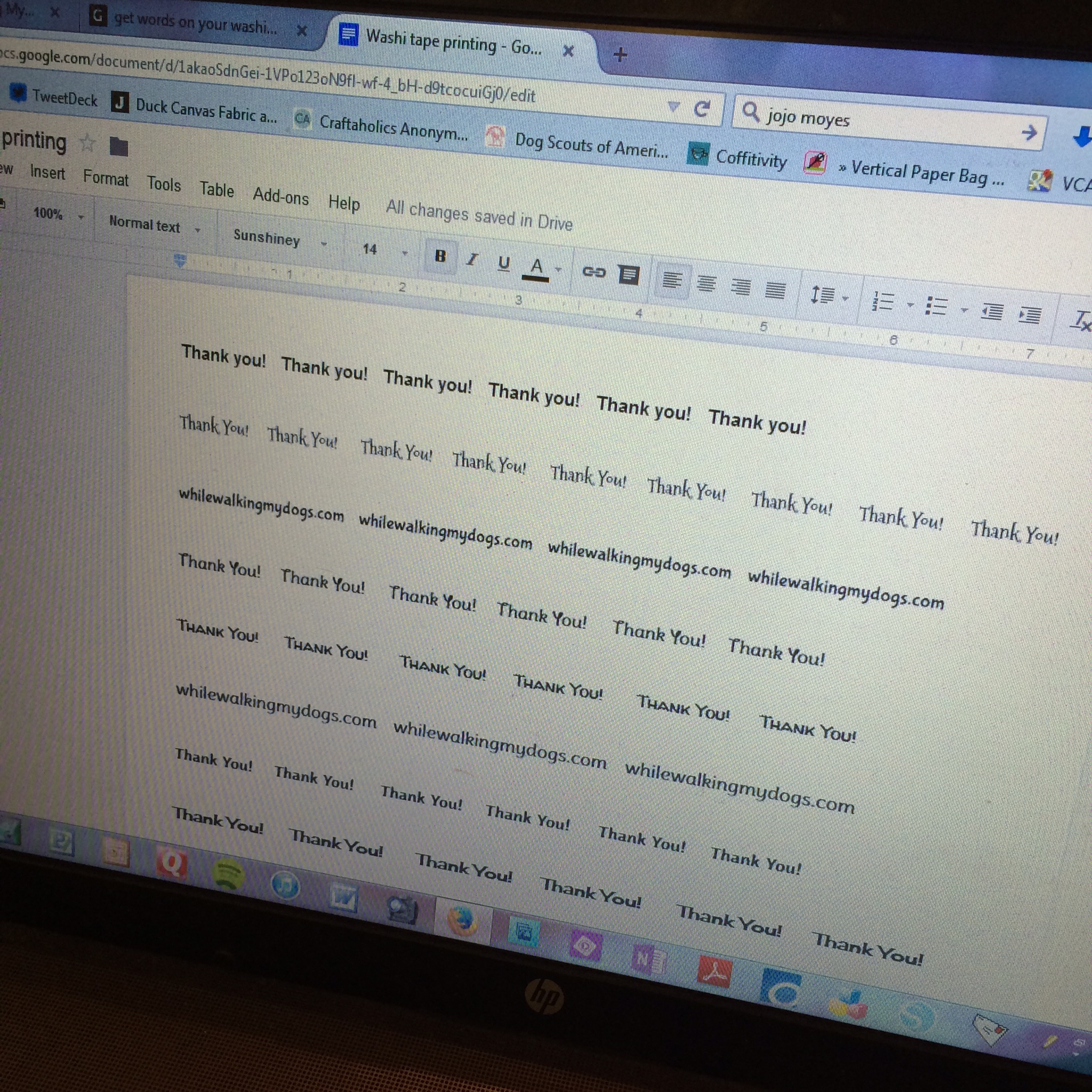 I printed lines of “thank you” and “whilewalkingmydogs.com” in different fonts. I made sure to bold the fonts to ensure the maximum amount of ink on my paper.