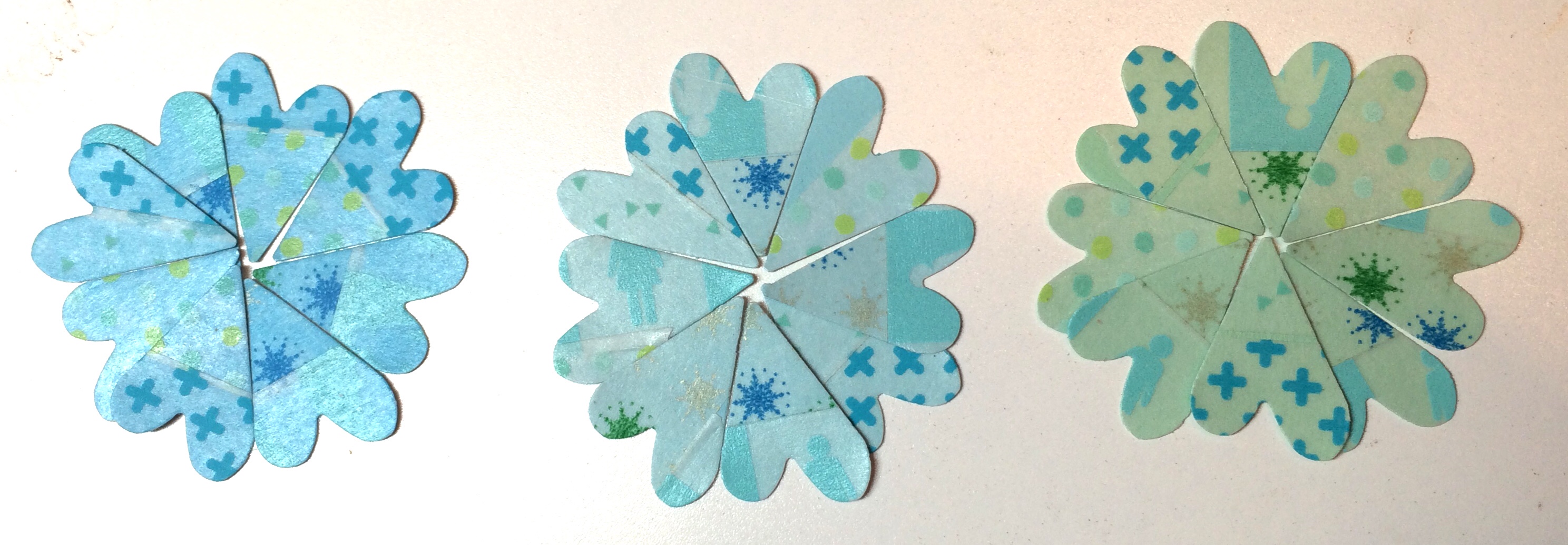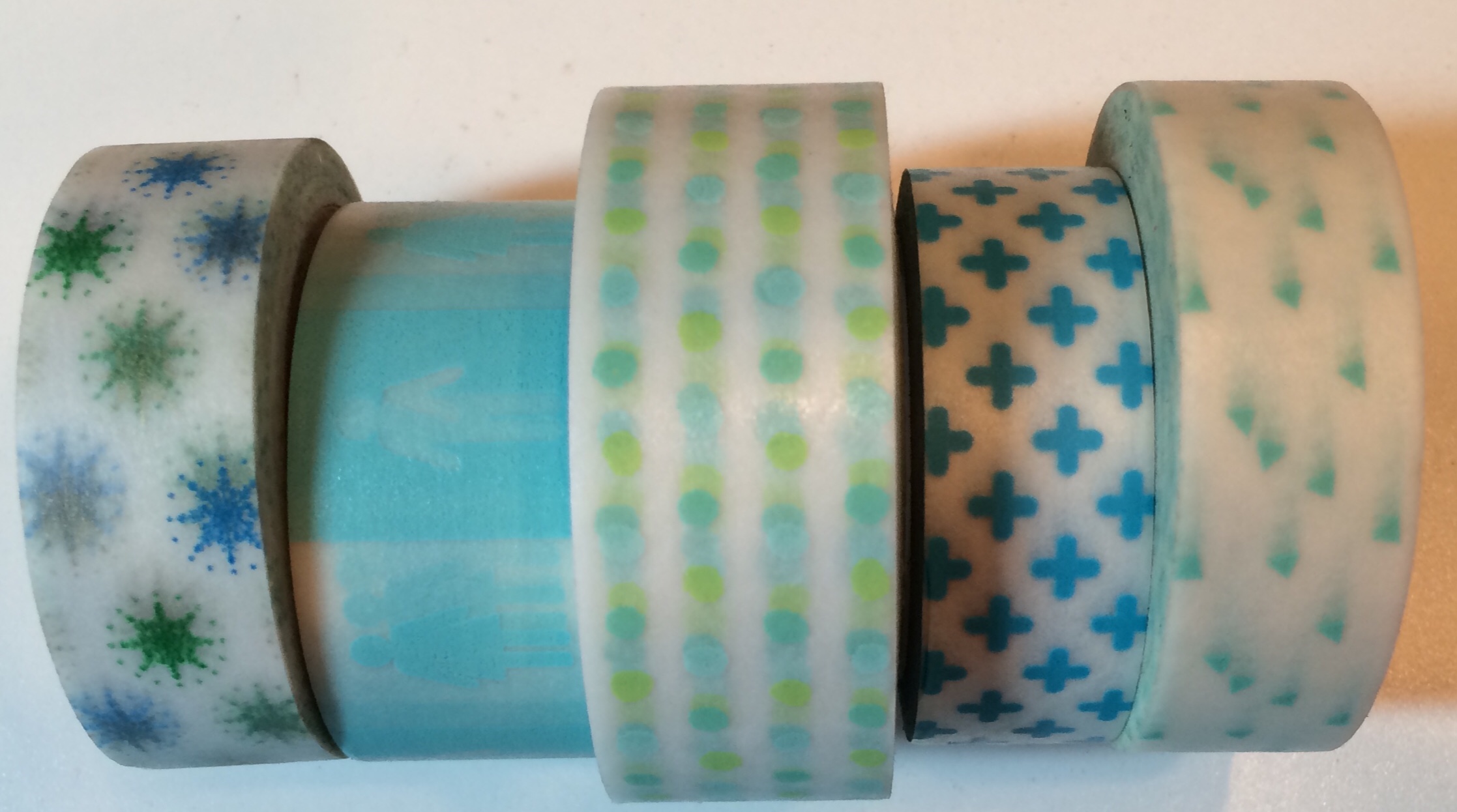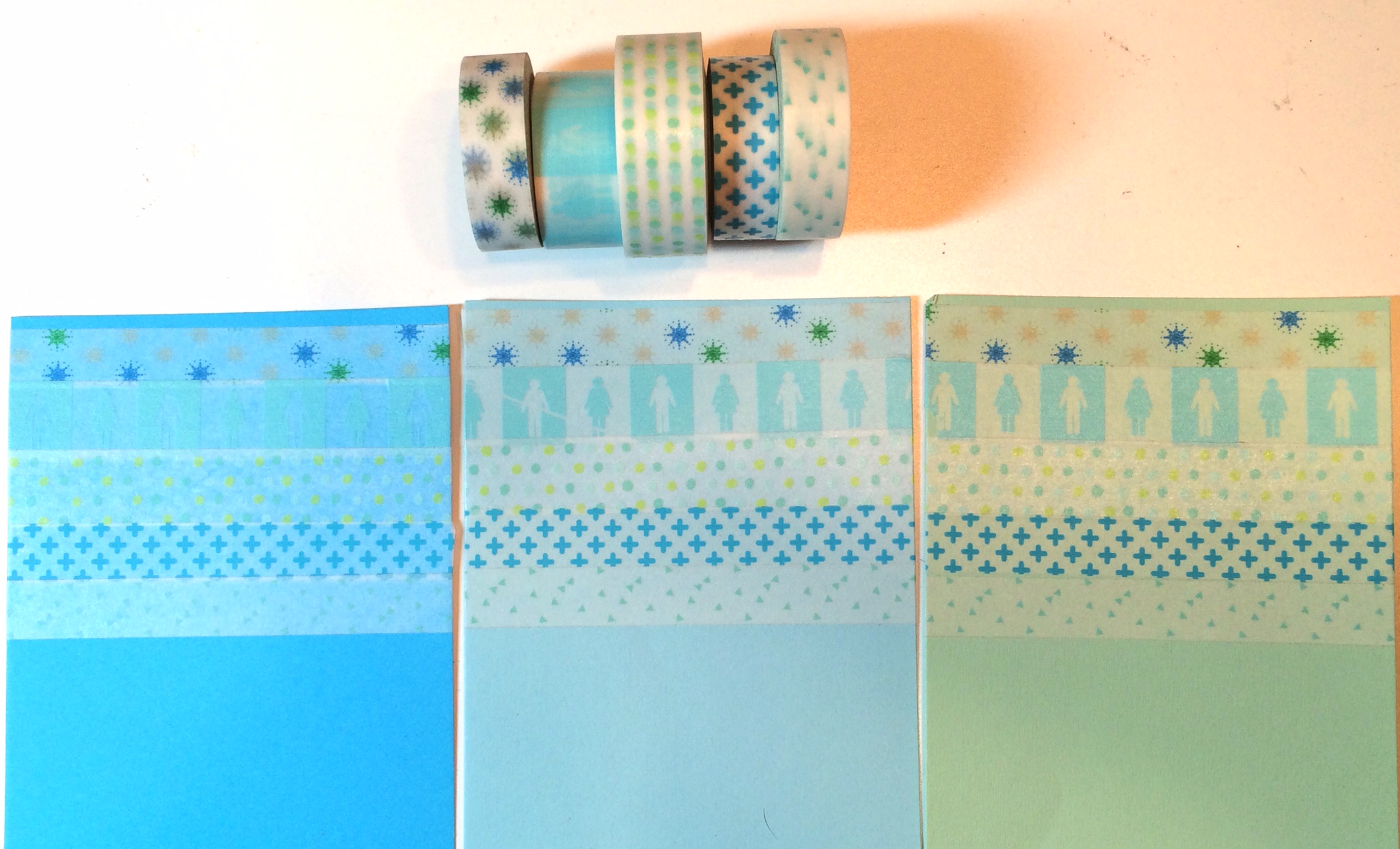 I used the same 5 washi tape designs, but on 3 different colored piece of cardstock. Because washi tape is translucent, the color of whatever it is stuck to comes through. I really liked the result. These are all the same shapes with the same tape designs, but each with a different look.