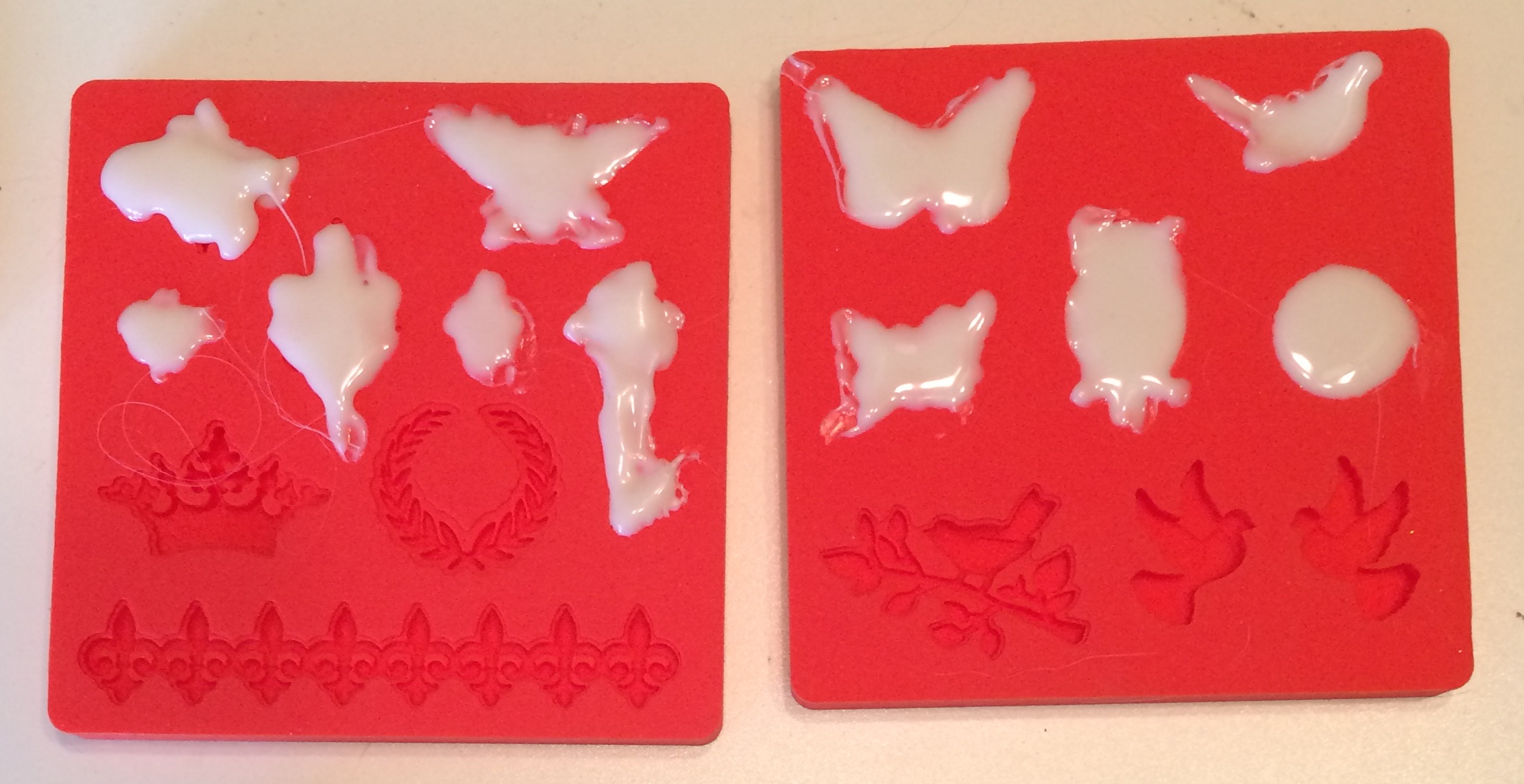 If you want to try this craft, you’re going to want to over-fill the molds. Don’t! This does create a beautiful, detailed embellishment, but it also creates an ugly edging that you need to cut away with an Exacto knife. For the molds that have straight edges it works pretty well, but for any that are highly detailed with curved edges – it doesn’t look so good.