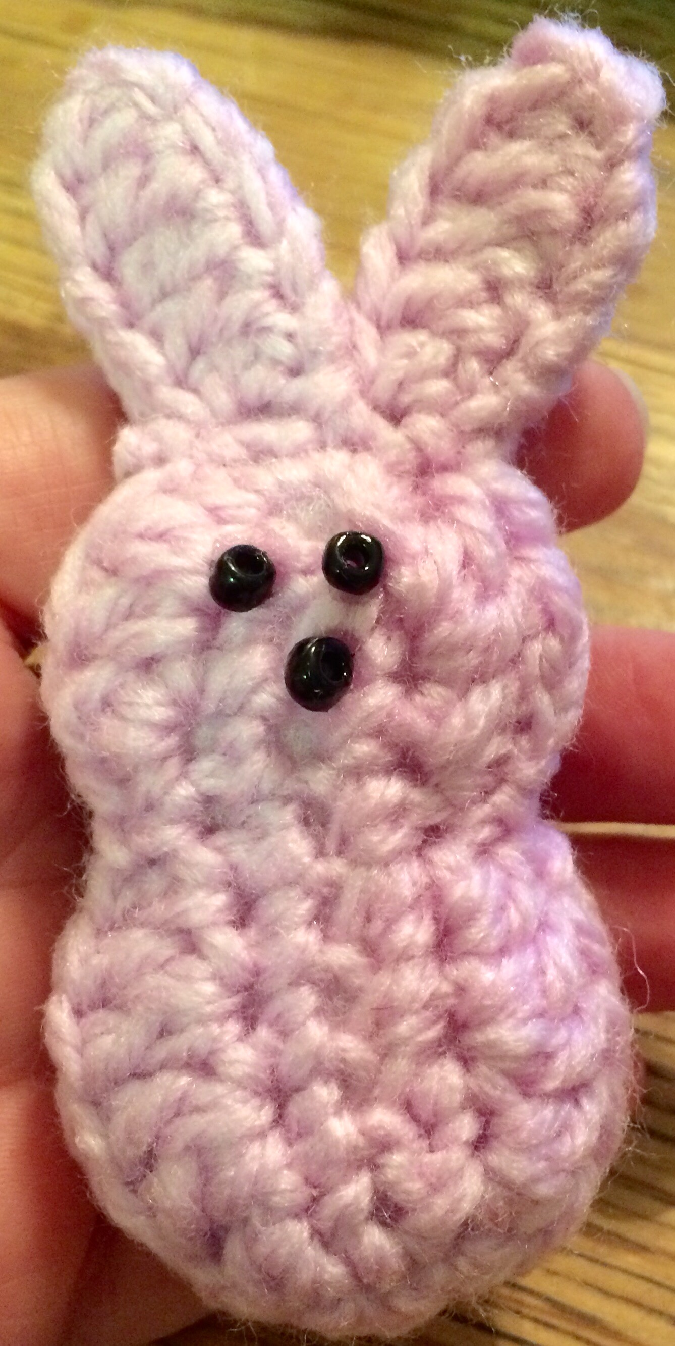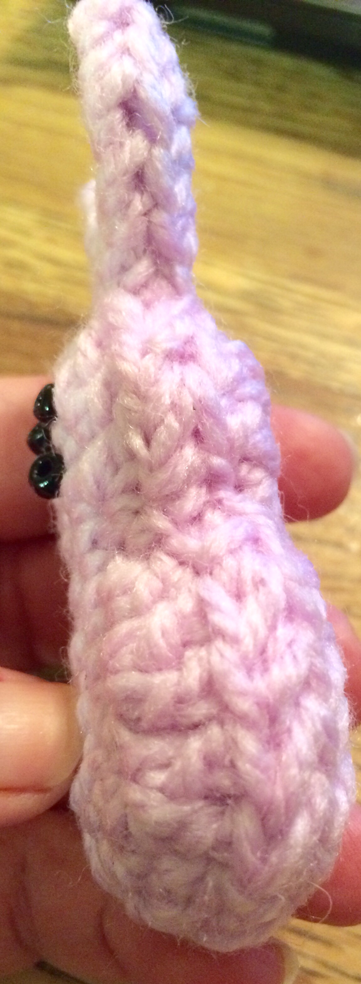 The pattern said to sew on the eyes and nose, but in a moment of sheer laziness, I hot-glued mine on. The eyes and nose are very small black beads, but I would be cautious about having these around small children and/or animals.