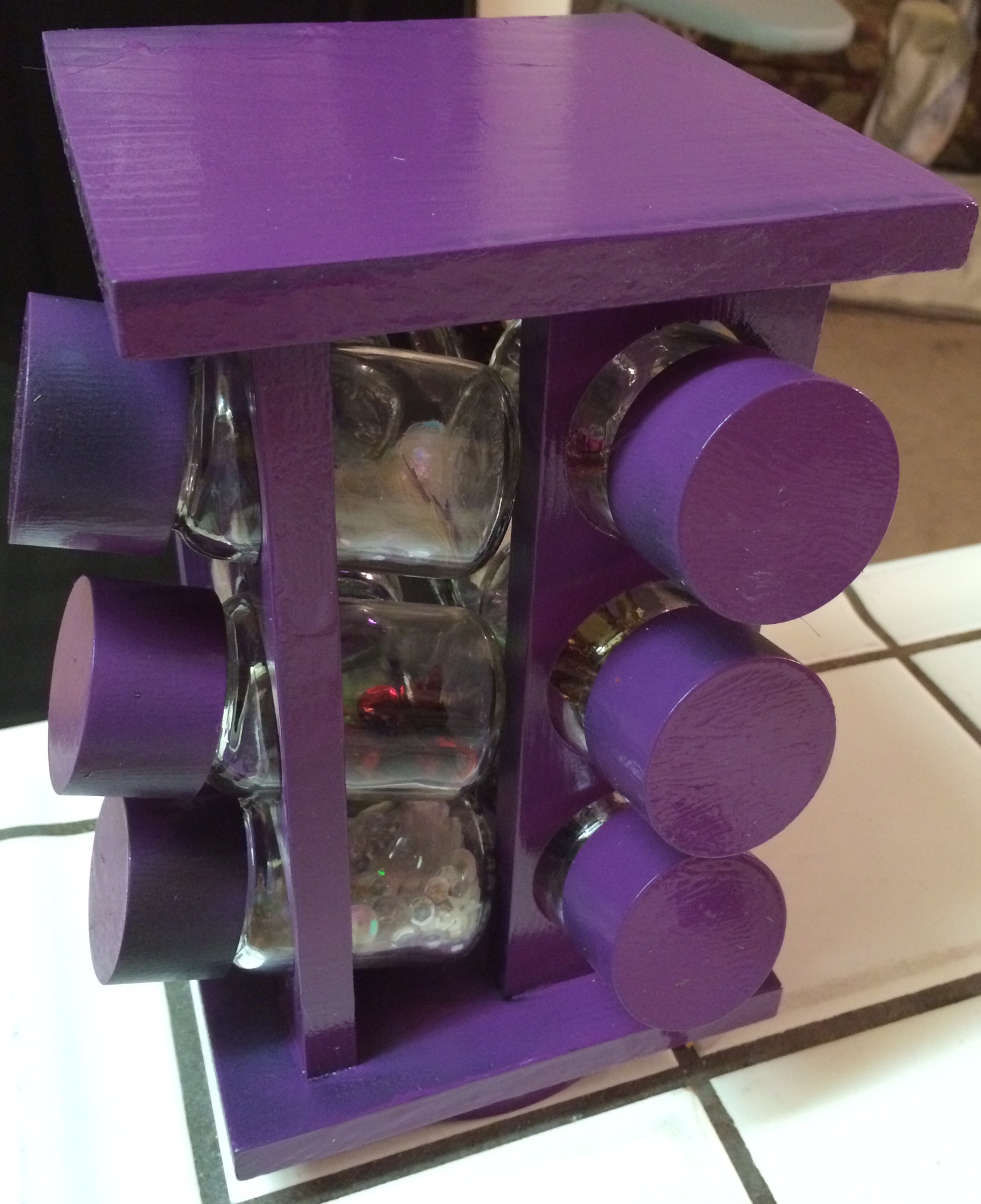 My little sequin rant aside, I’m pleased with how my turnstile rack turned out. As you can see, in the picture on the left, it started out brown and then I painted it. I primed it with black spray paint, and then chose a bright purple to match my paint racks.